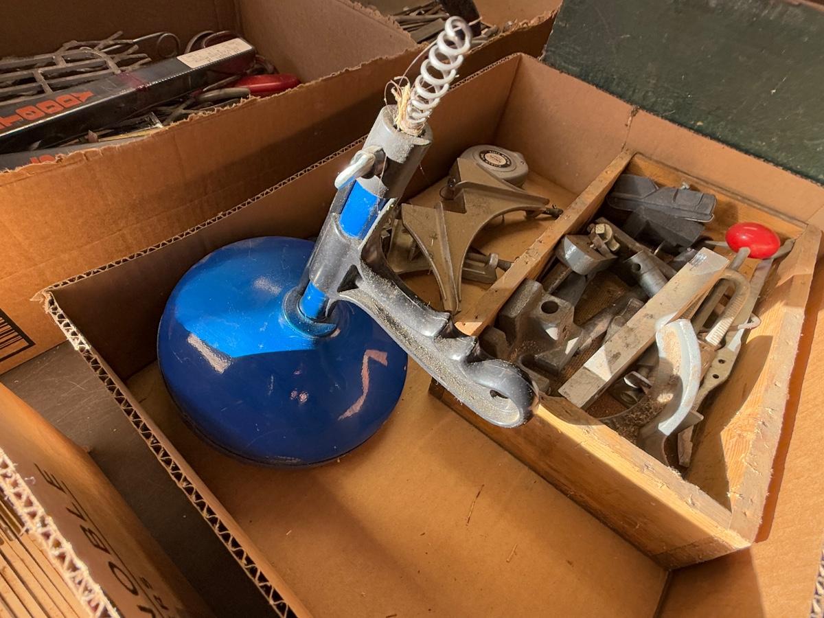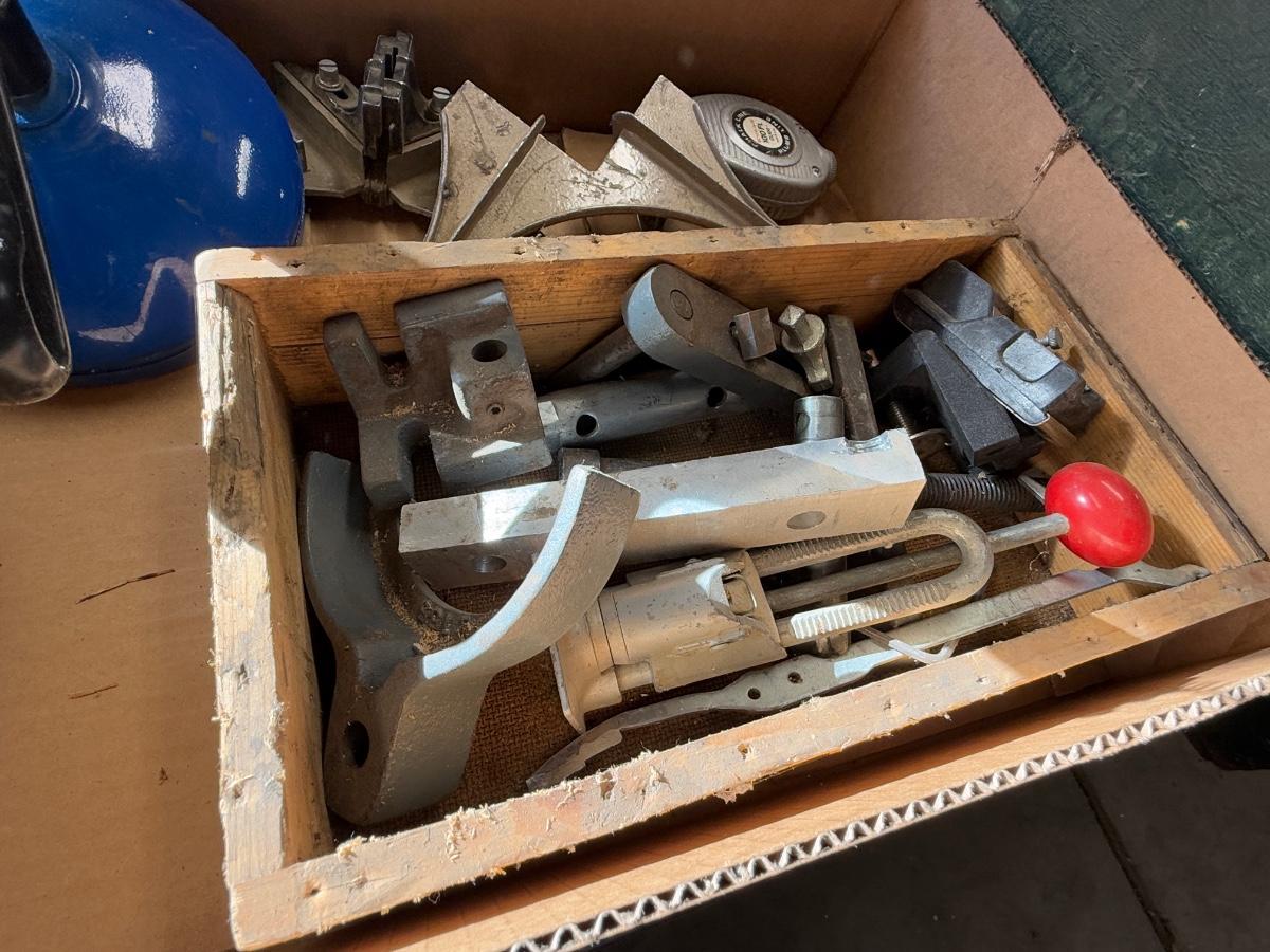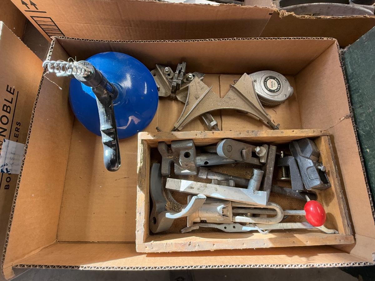 Box with 2 angle clamps/drain snake/chalk line & misc. machine parts