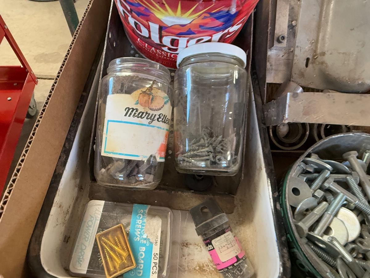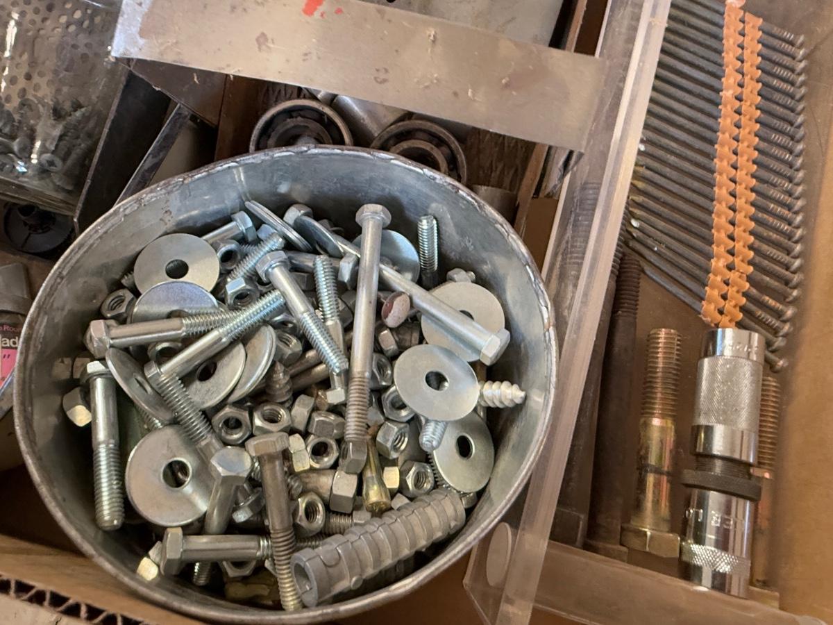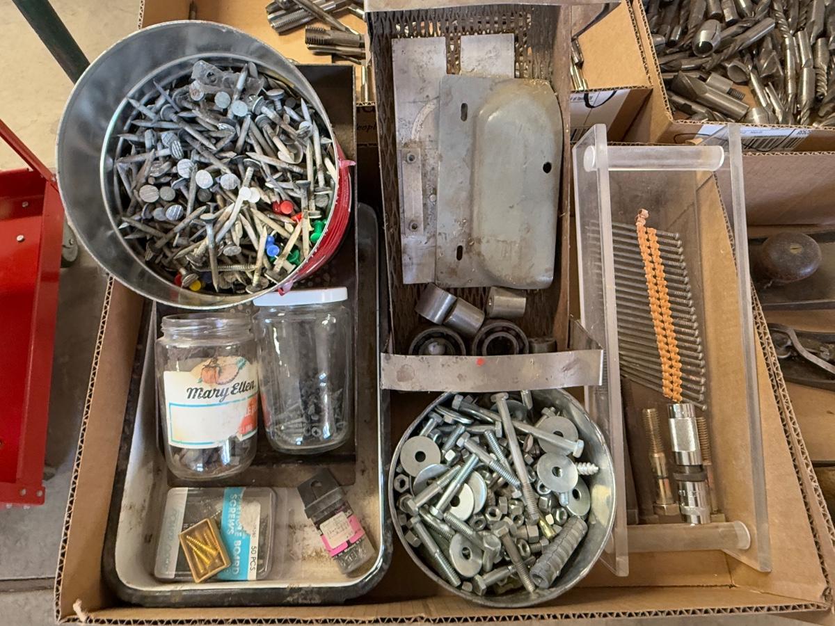Box of Misc. shop items-nuts/bolts/nails/screws & misc. hdw.