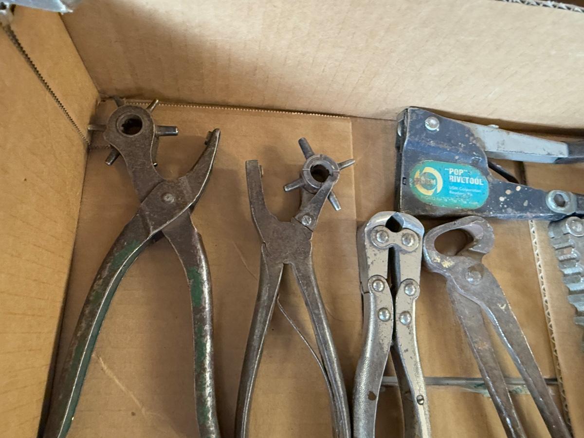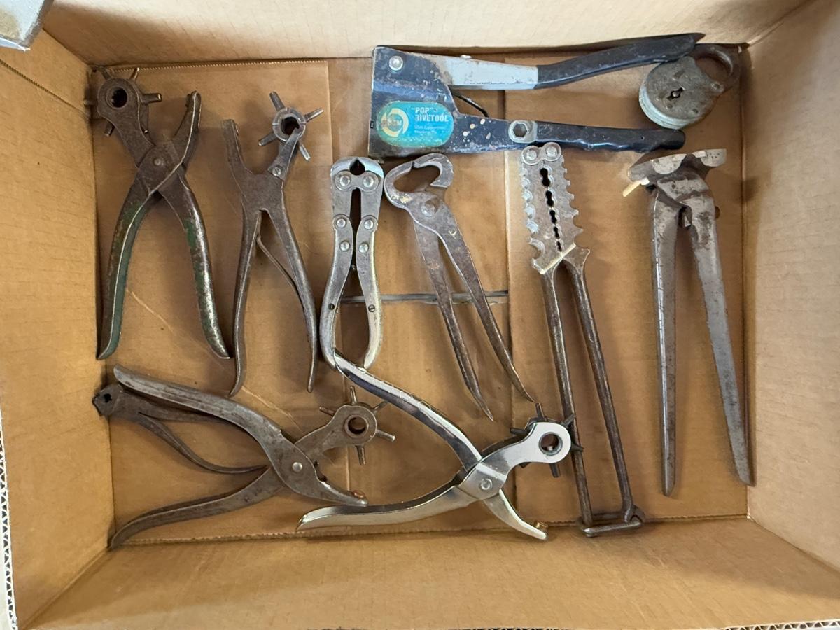 Box of Riveting Tools + (9 total tools & 1 old padlock w/o key)