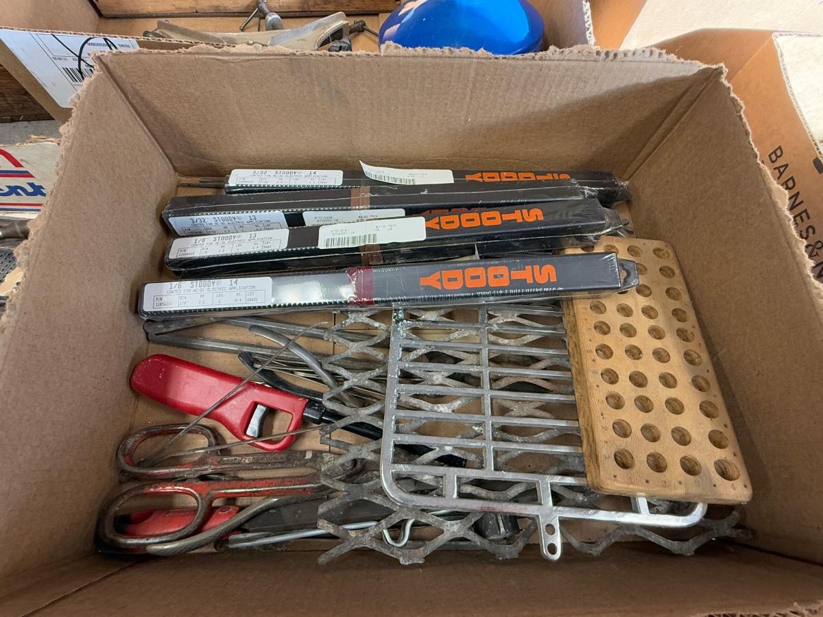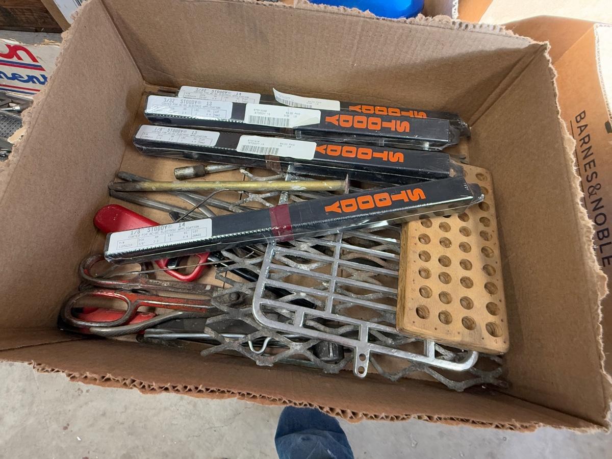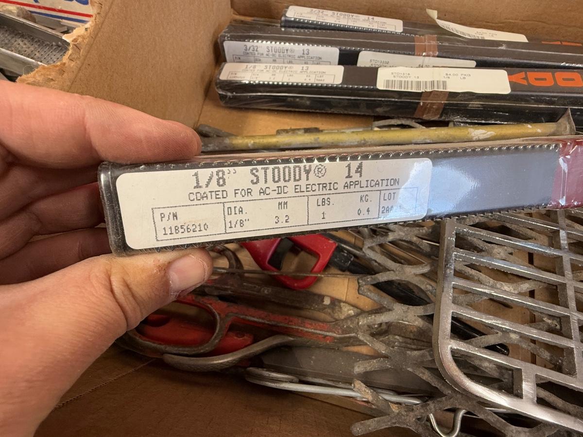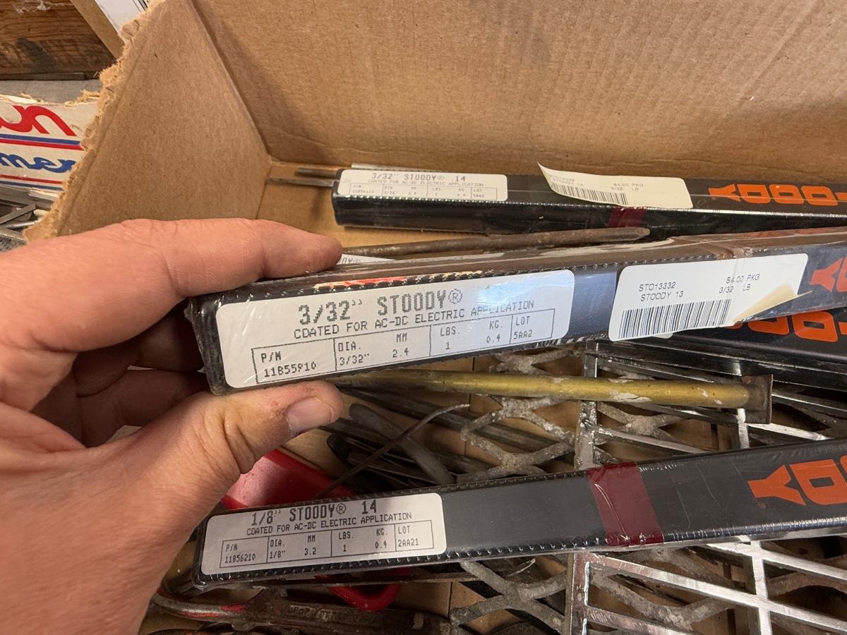 Box with Stoody Welding Rods 1/8, 3/32 & misc. metal pieces