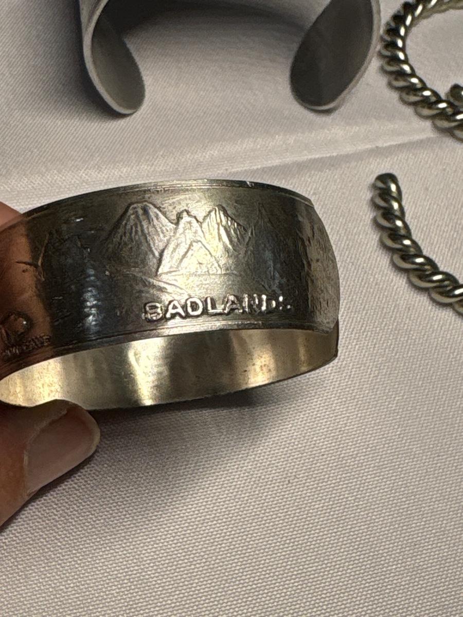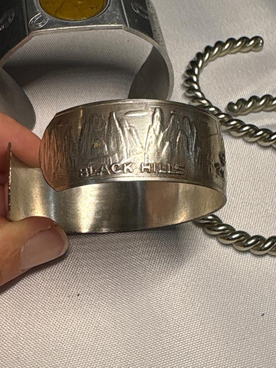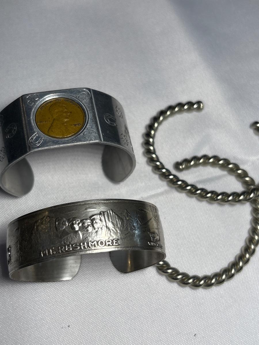 Lucky horseshoe/shamrock & 1945 wheat penny bracelet, Mt Rushmore bracelet & 2 silver bracelets