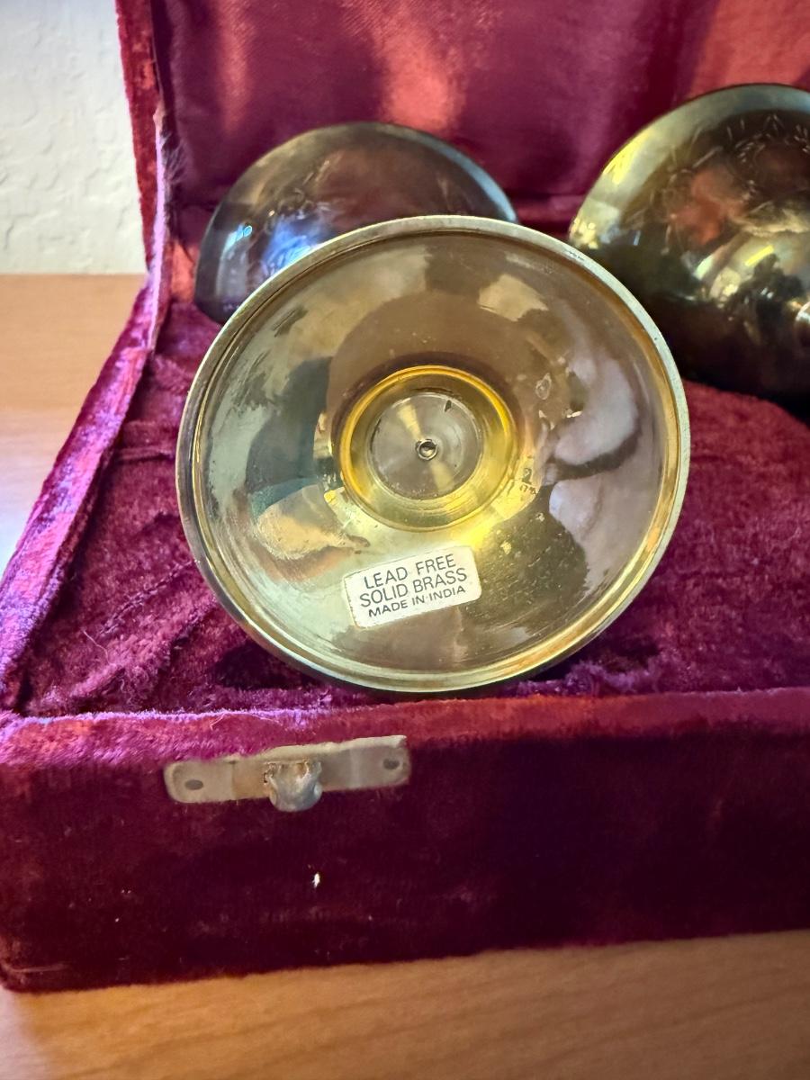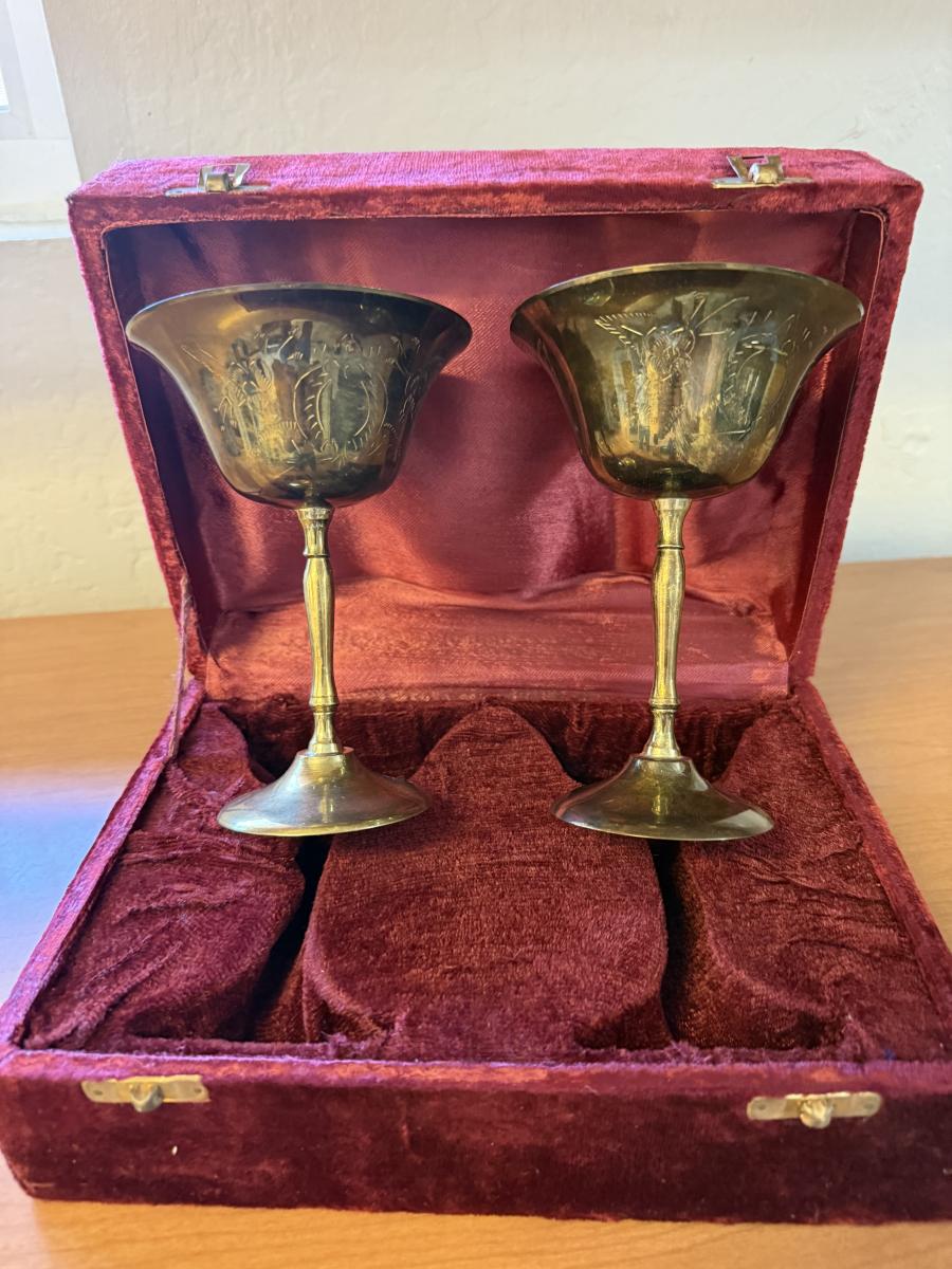 Pair of engraved brass goblets presented in a red velvet case. Ornate detailing makes them a unique collectible or display piece.