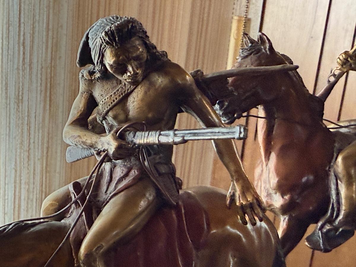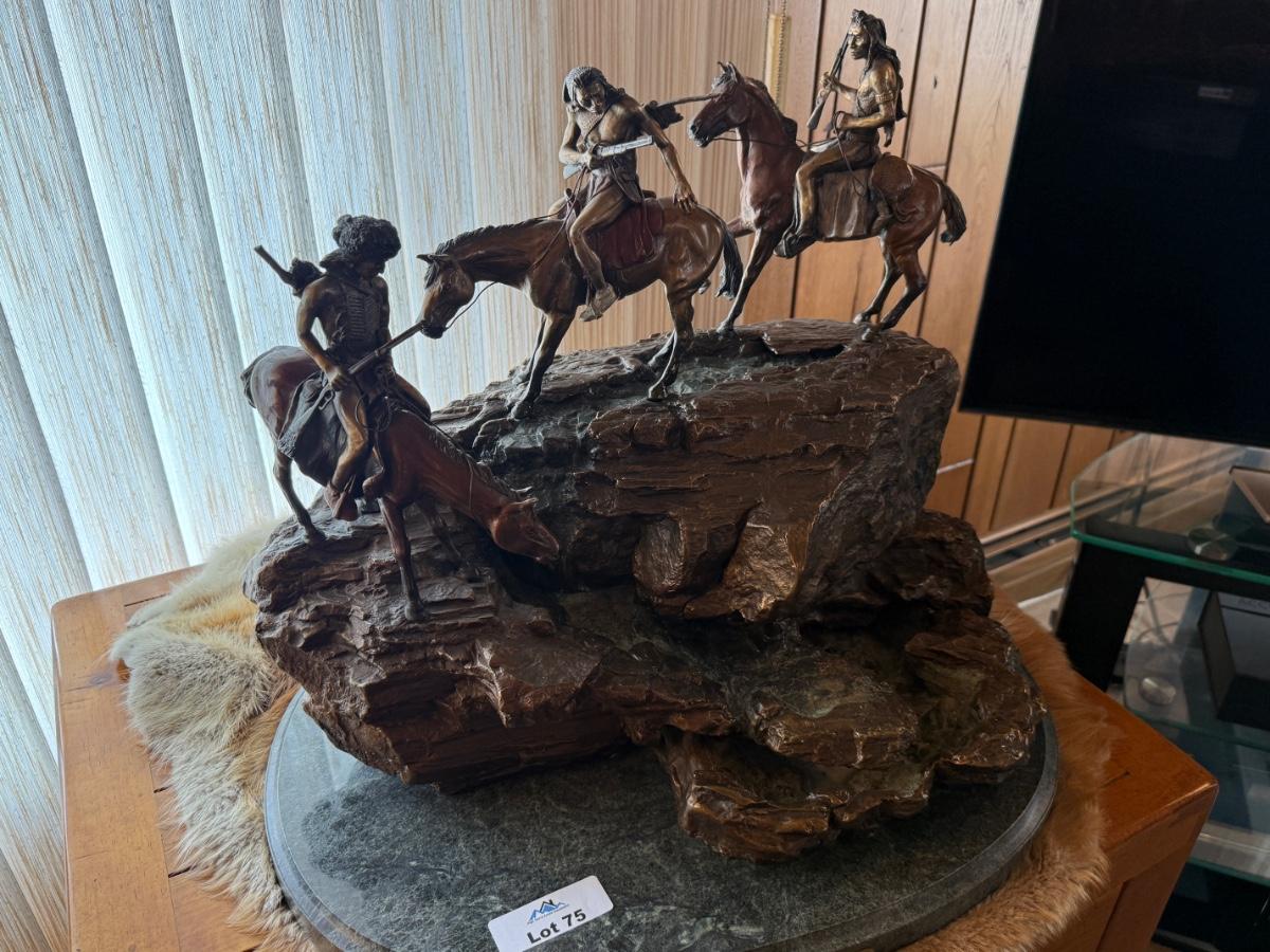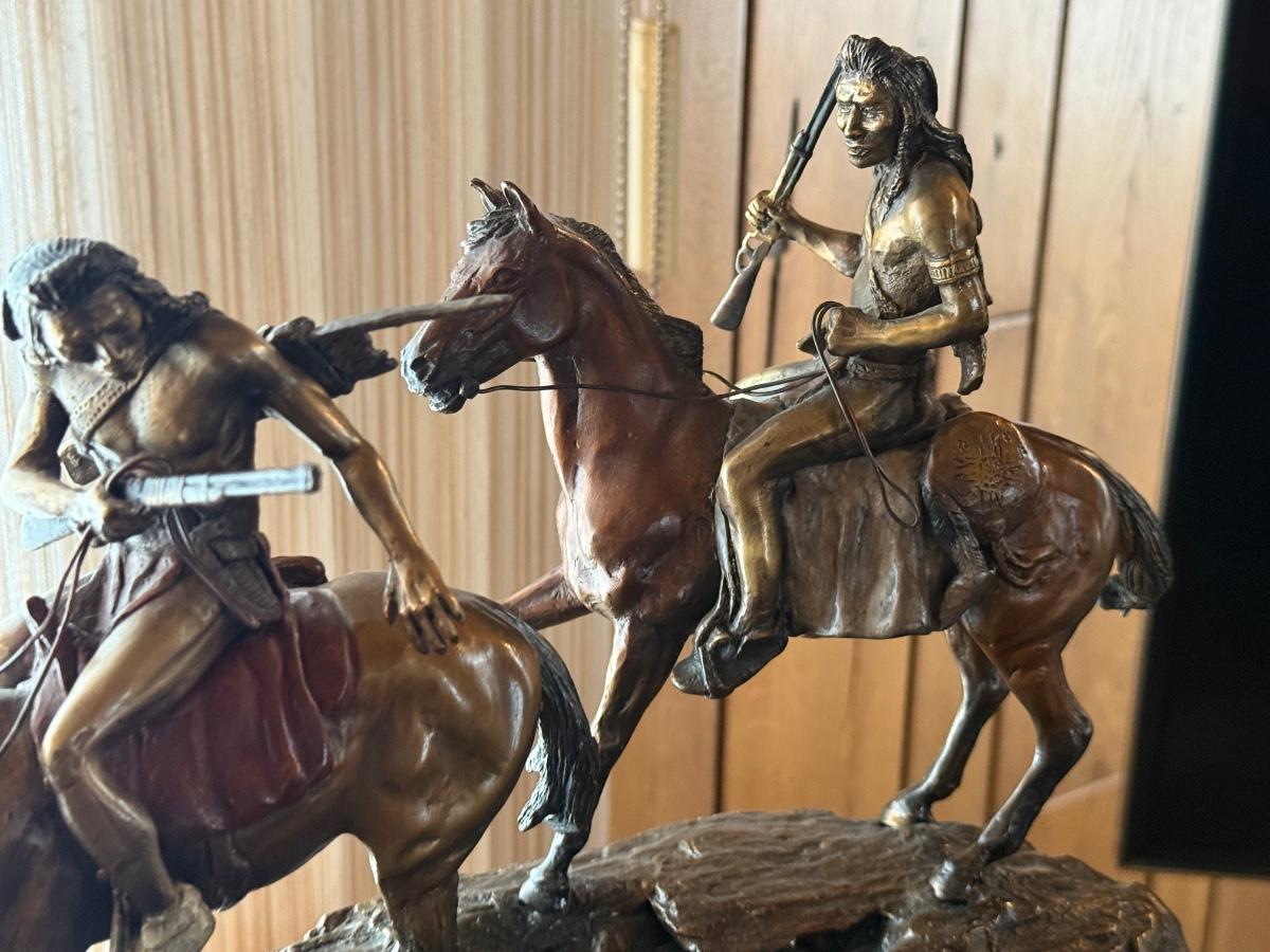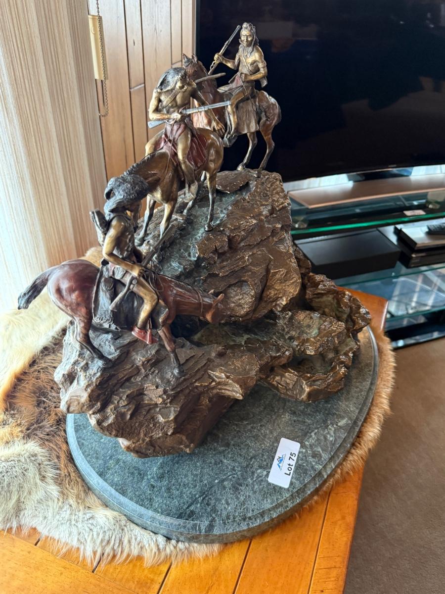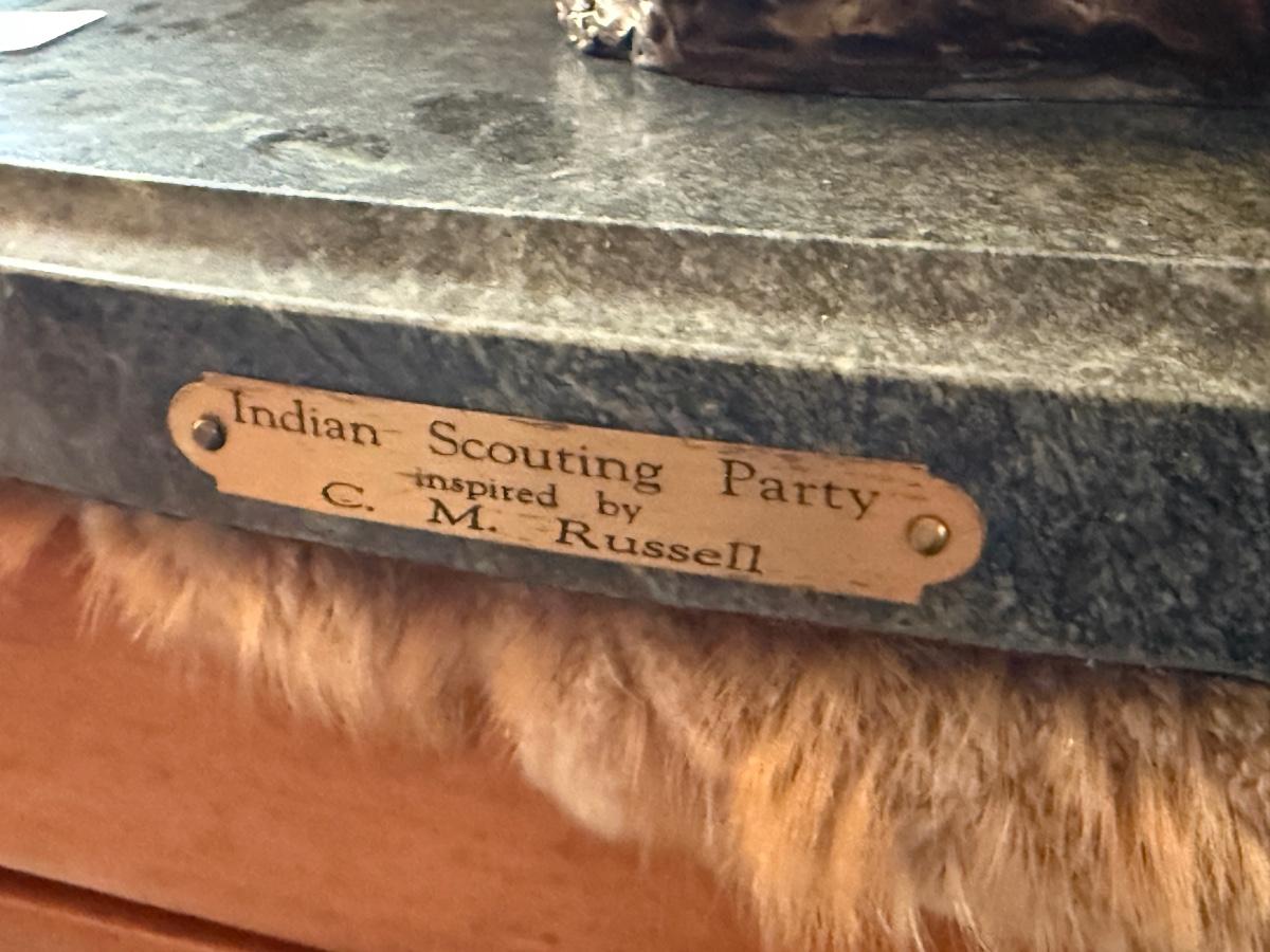 Mounted on marble base - large heavy piece probably a little over 100 lbs featuring 3 native americans with rifles riding down a cliff on horses. Fountain sounds like it works but did not put water in it. Doesn't include fur piece or table underneath it.
