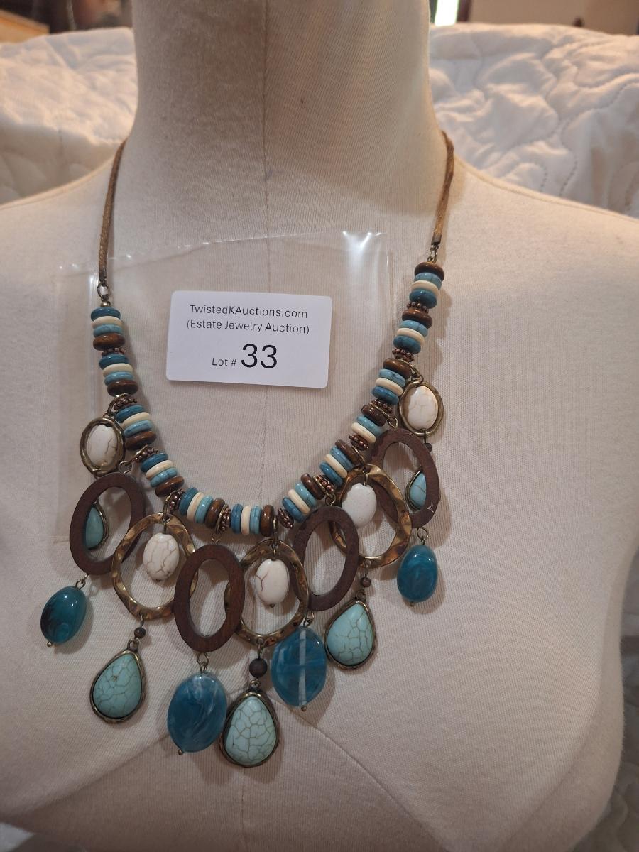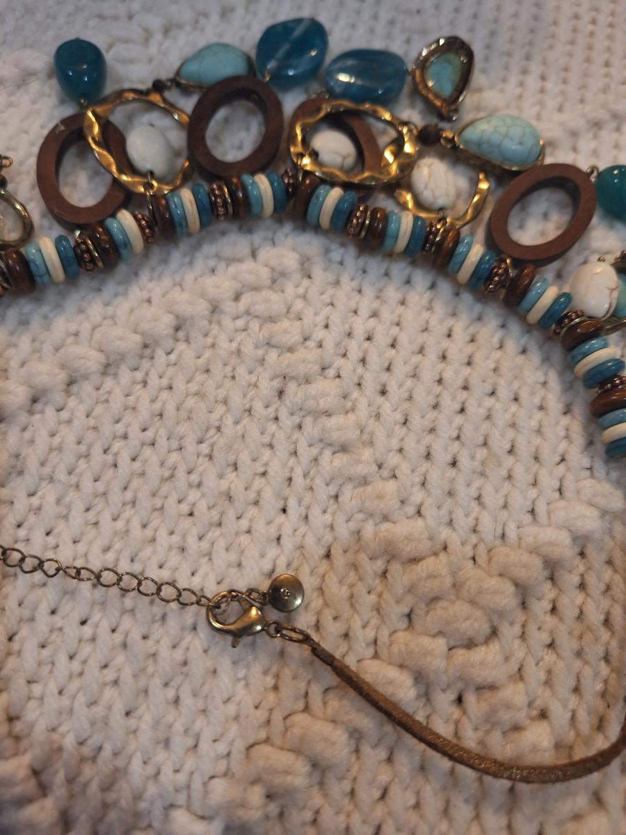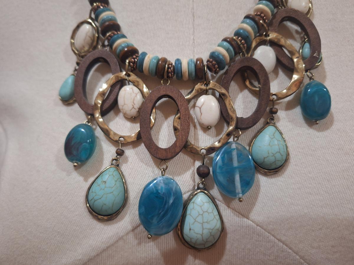 browns and turquoise colored beaded and dangle necklace with leather strap.