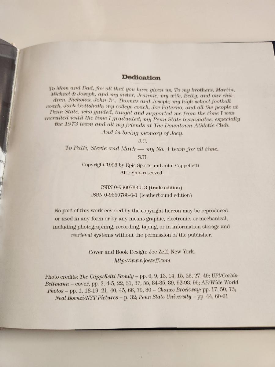 This auction lot is for an as new copy of Cappelletti Penn State's Iron Horse by Steve Halvonik with Cappelletti Autograph. He signed the book with his jersey number and the year. Quite a sports collectible. Both the hardboun book and the dust cover are in very good condition. Published by Epic Sports, 1998. 96 pages.