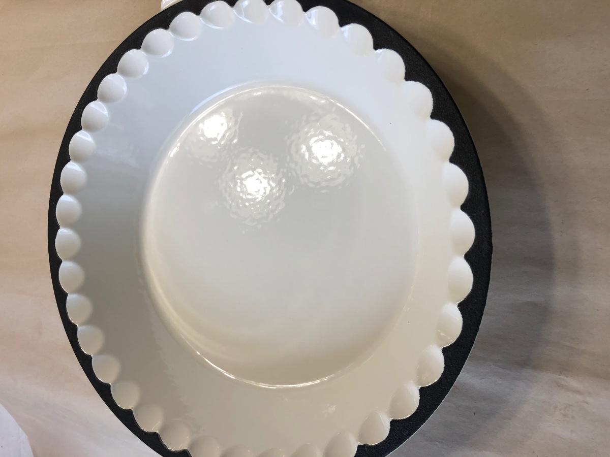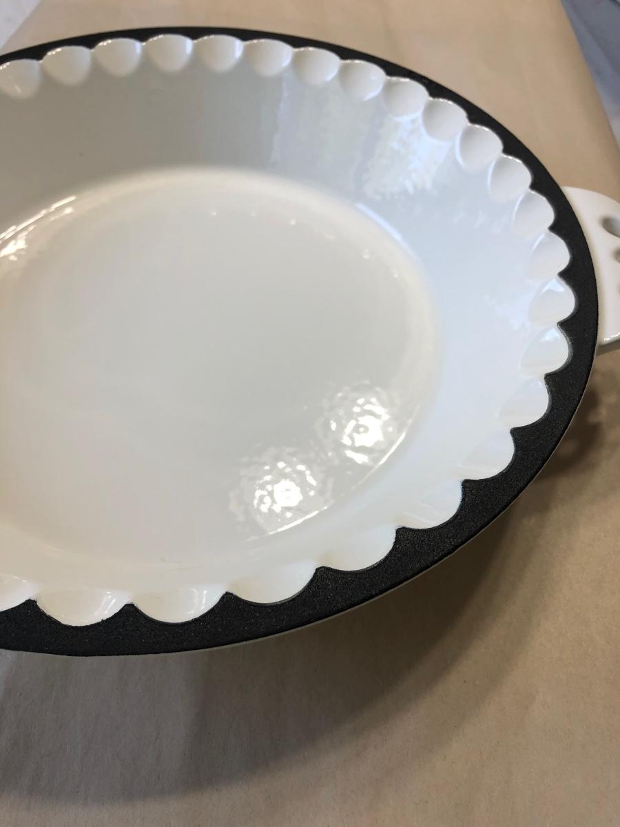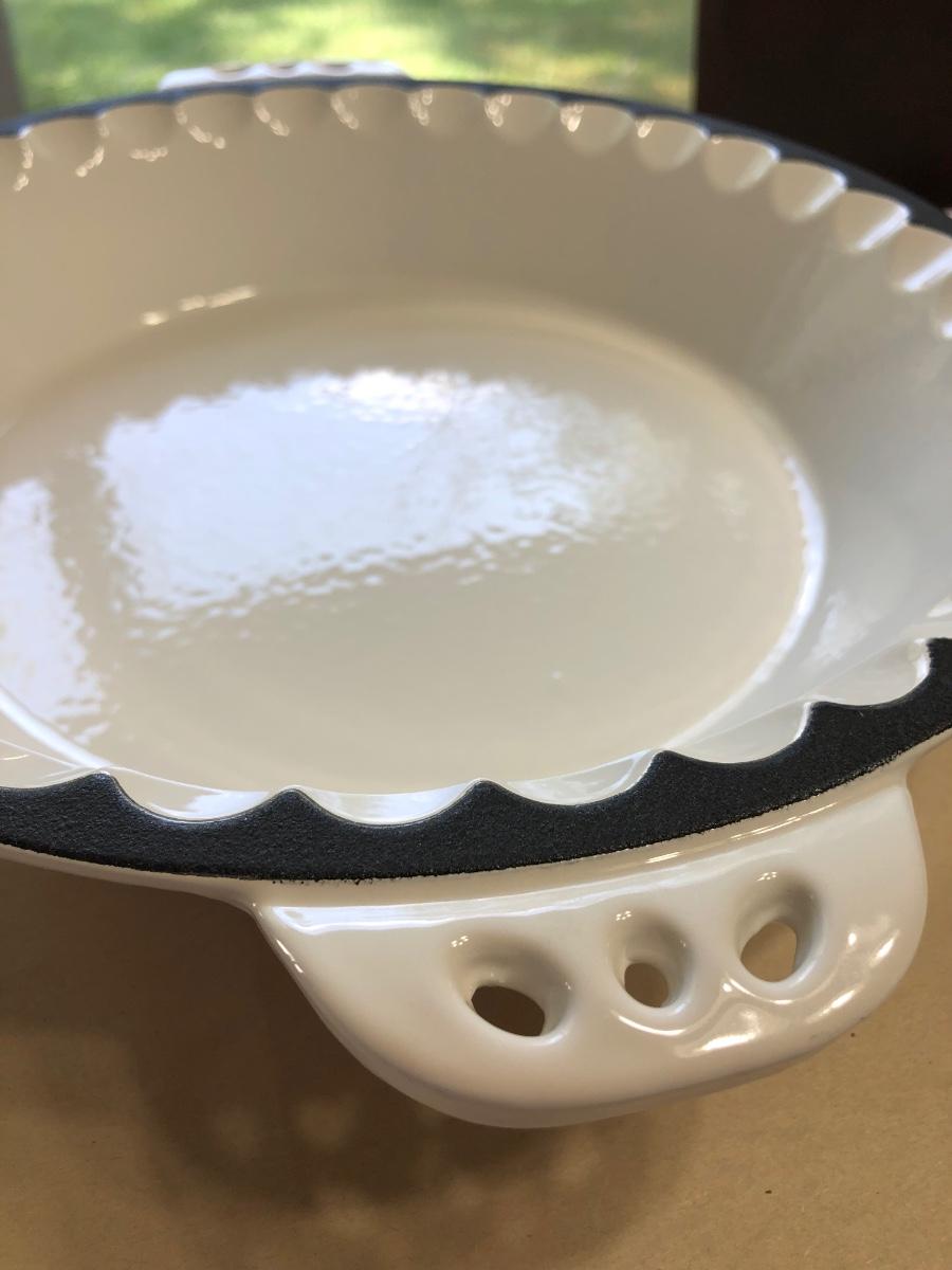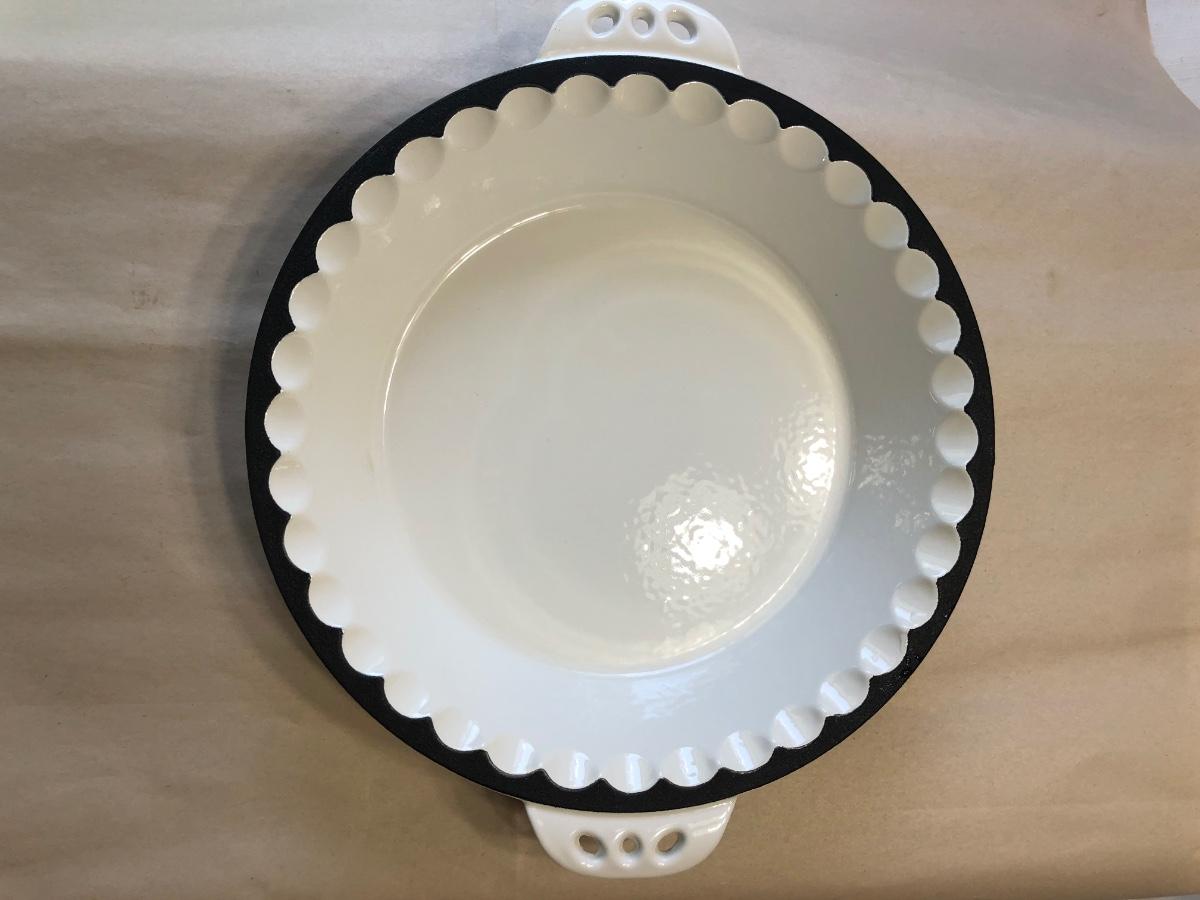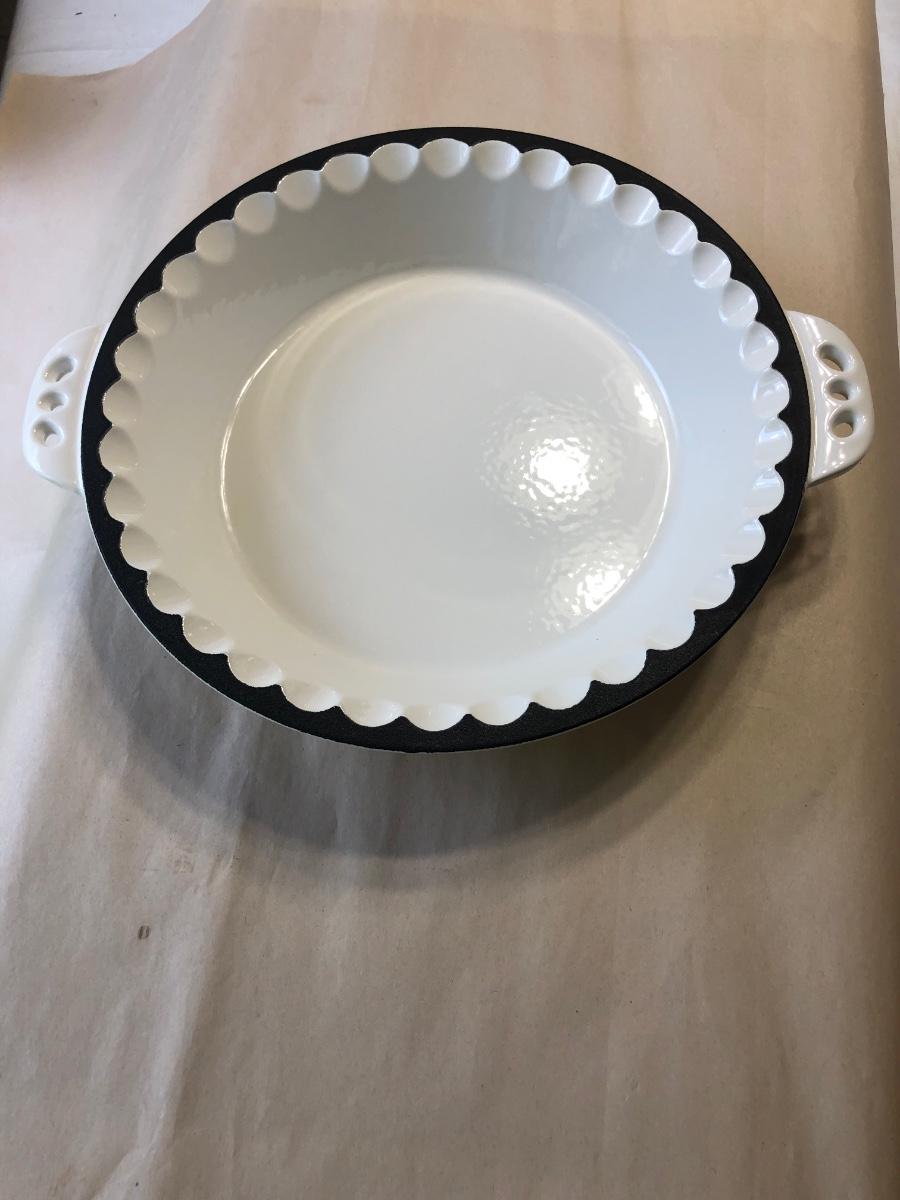 10.5 in. Cast iron with enamel coating. No scratches, marks or wear. Like new.