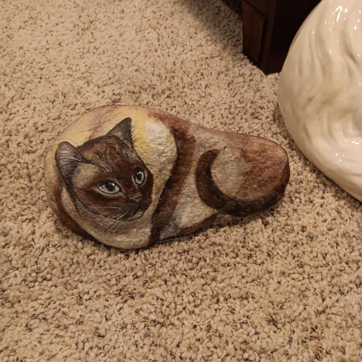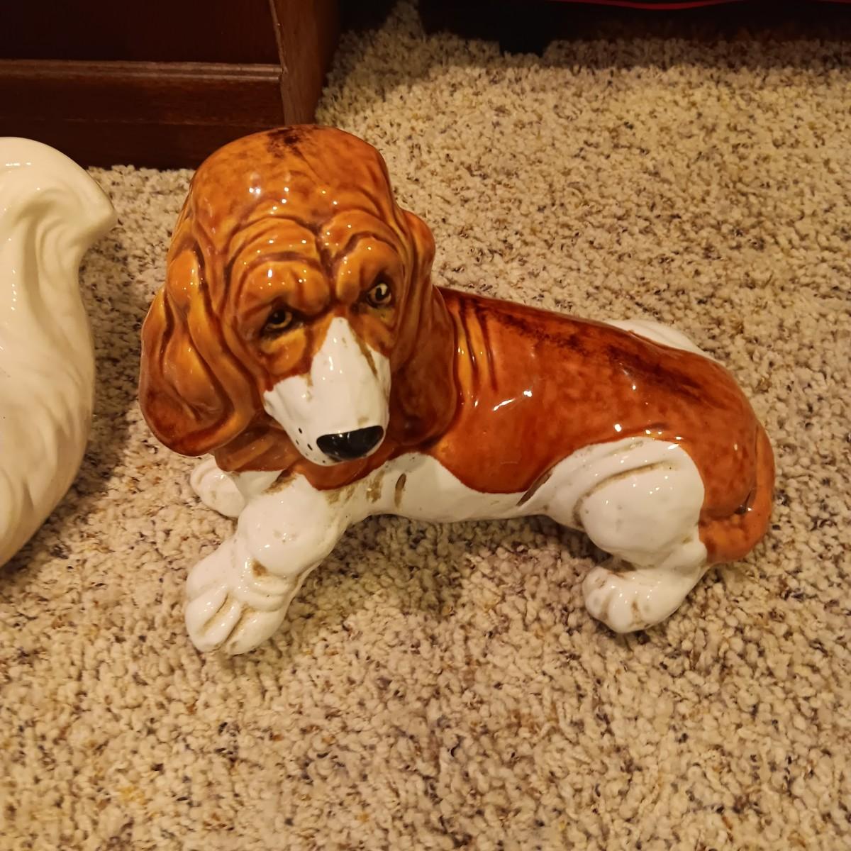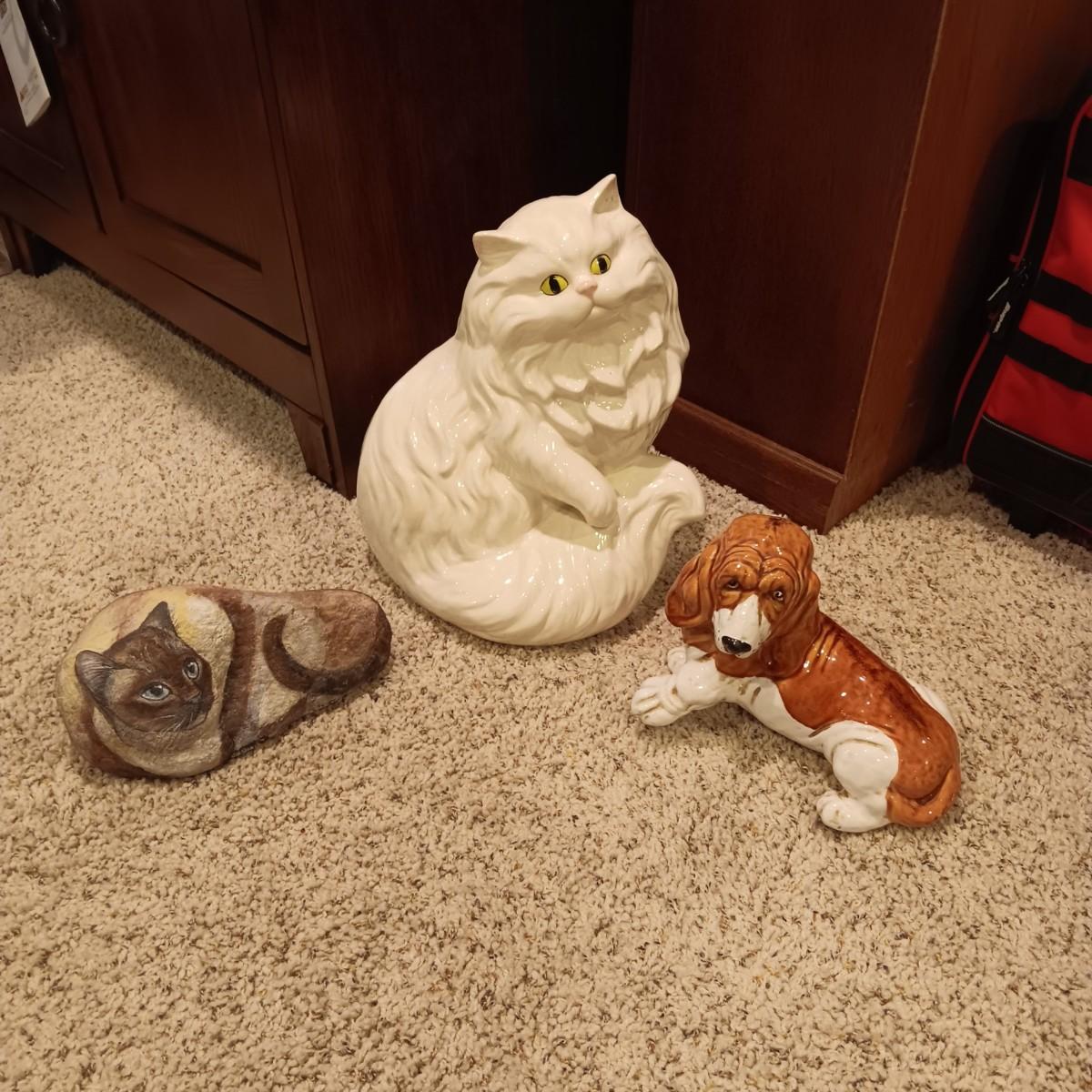 CERAMIC CAT AND BASSET HOUND PUPPY PLUS A HAND PAINTED CAT ON A ROCK