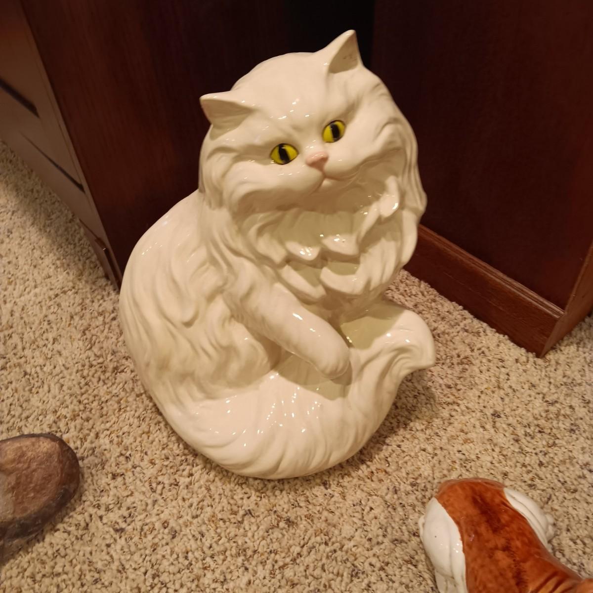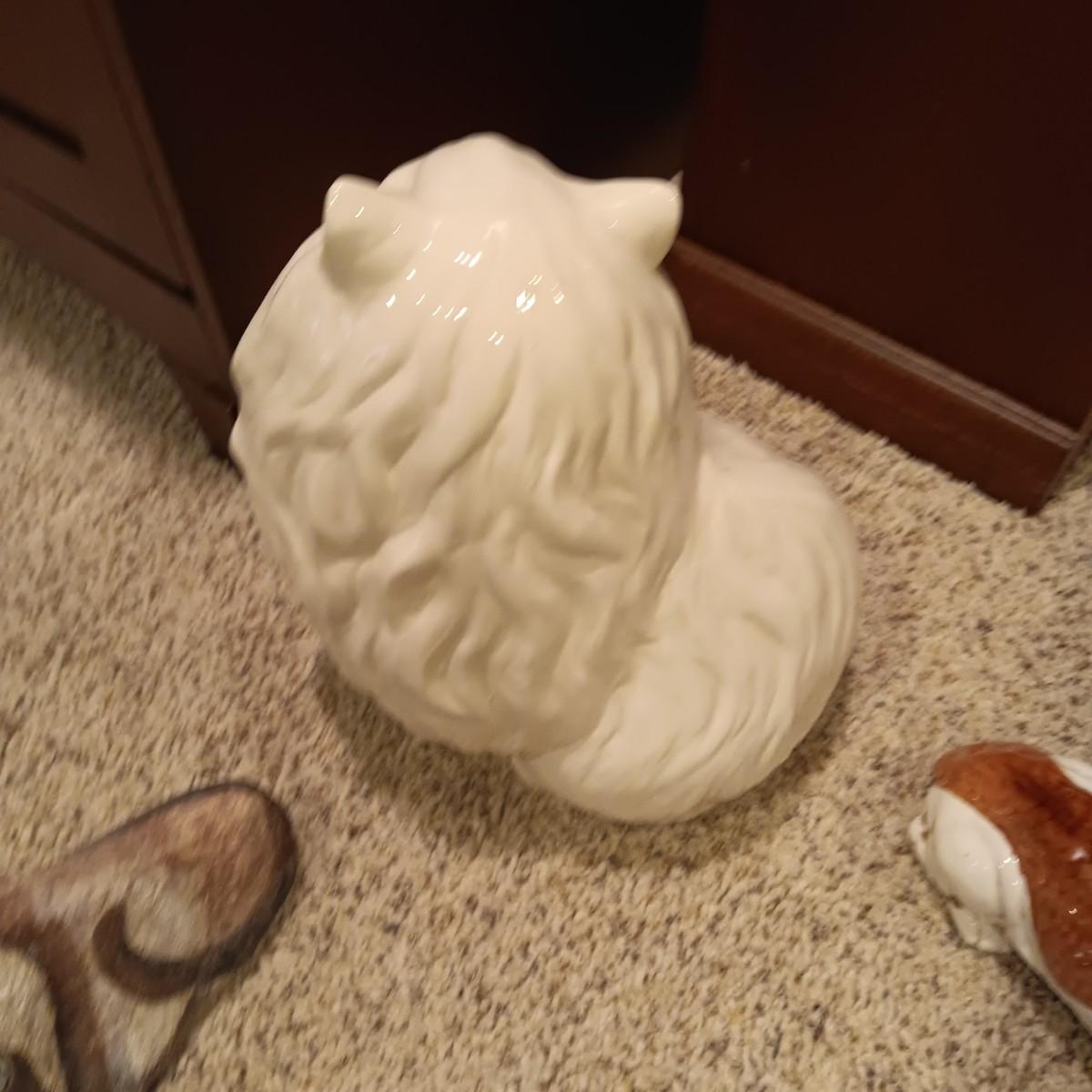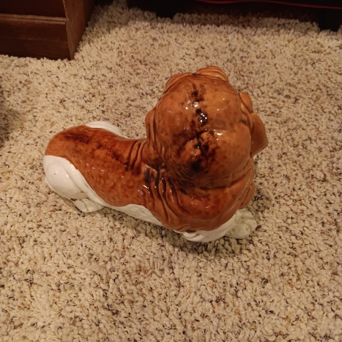 CERAMIC CAT AND BASSET HOUND PUPPY PLUS A HAND PAINTED CAT ON A ROCK
