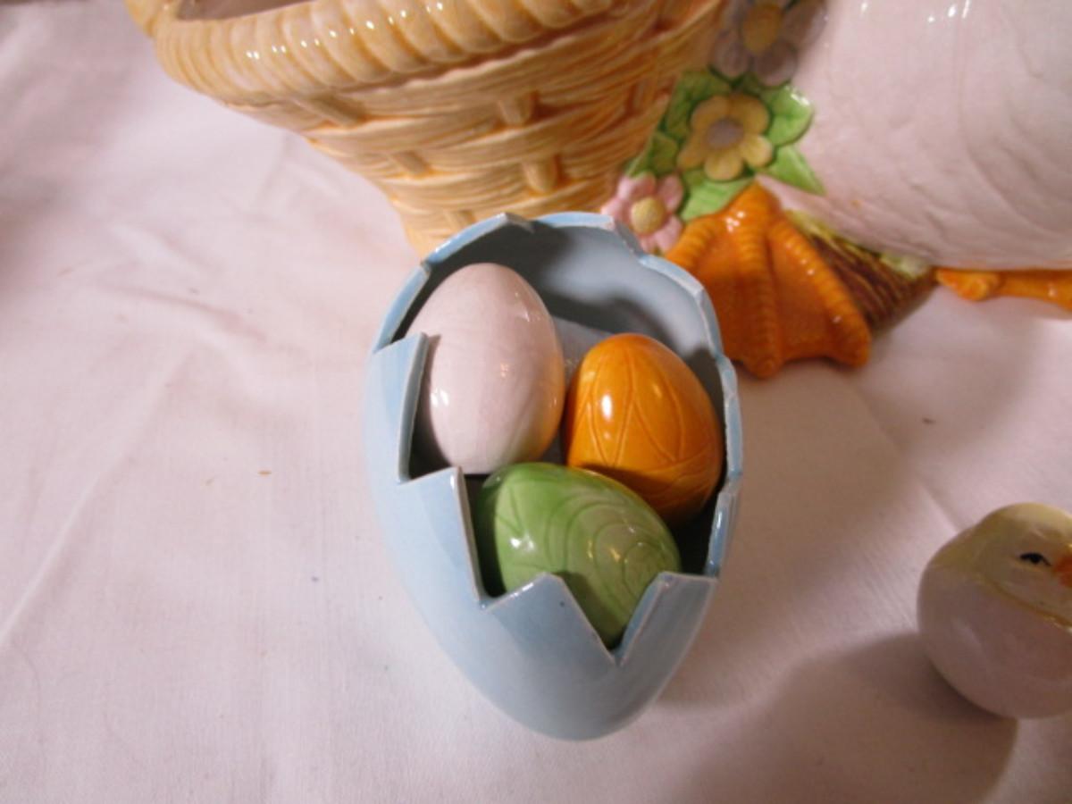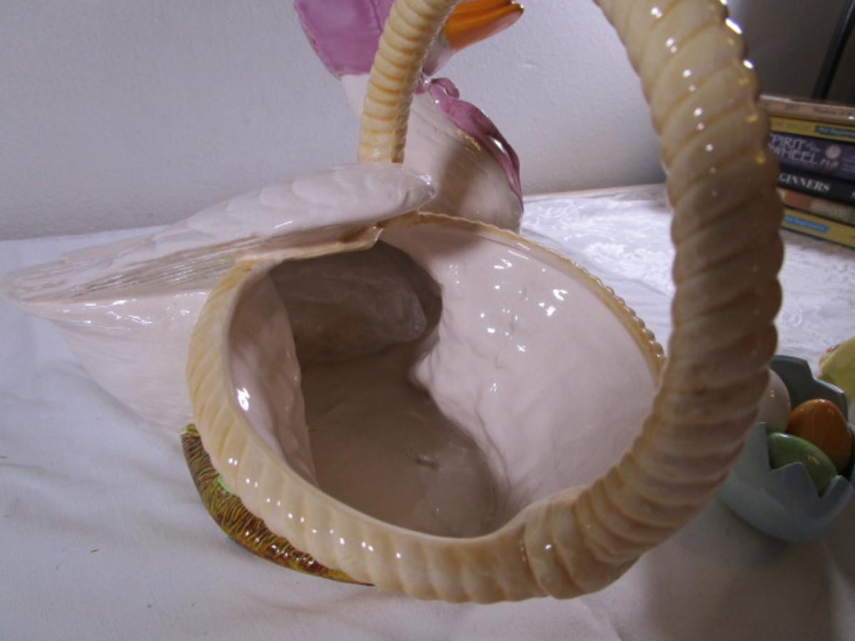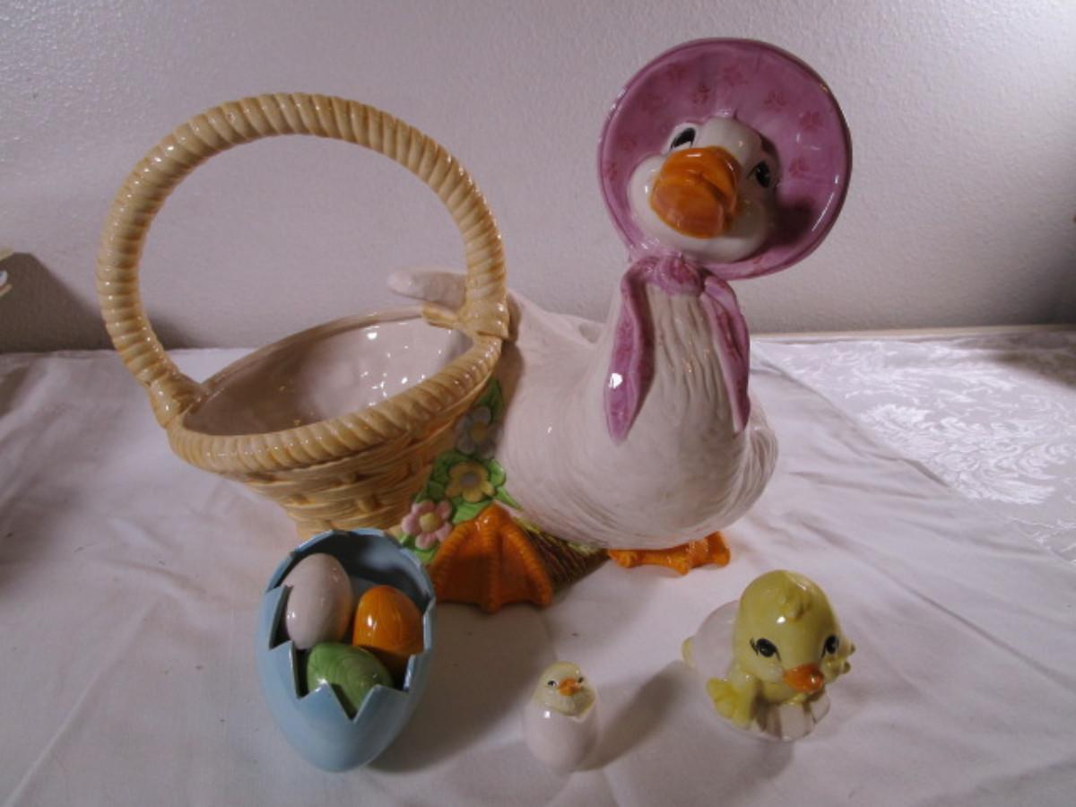 duck with basket 11" wide x 8-1/2" tall; little ceramic duck 2-1/2" tall, little chicken 1-1/4" tall; egg 3-1/4" wide x 2-1/2" tall