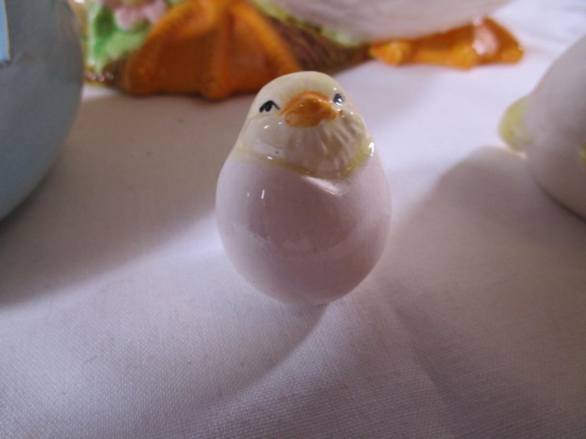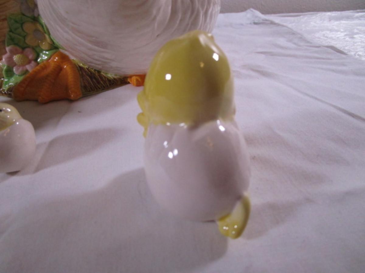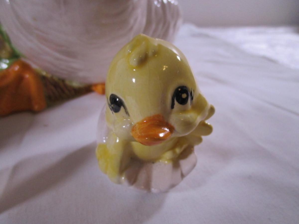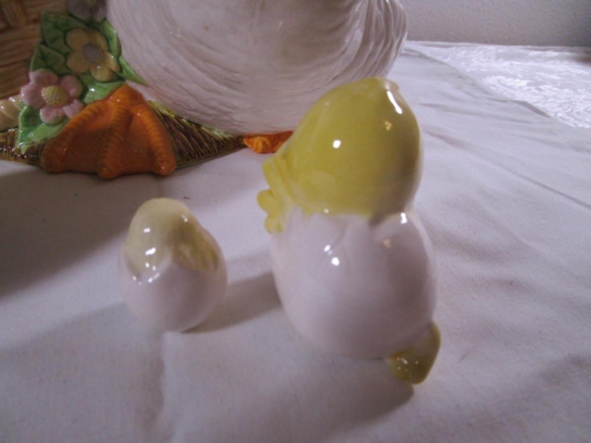 duck with basket 11" wide x 8-1/2" tall; little ceramic duck 2-1/2" tall, little chicken 1-1/4" tall; egg 3-1/4" wide x 2-1/2" tall