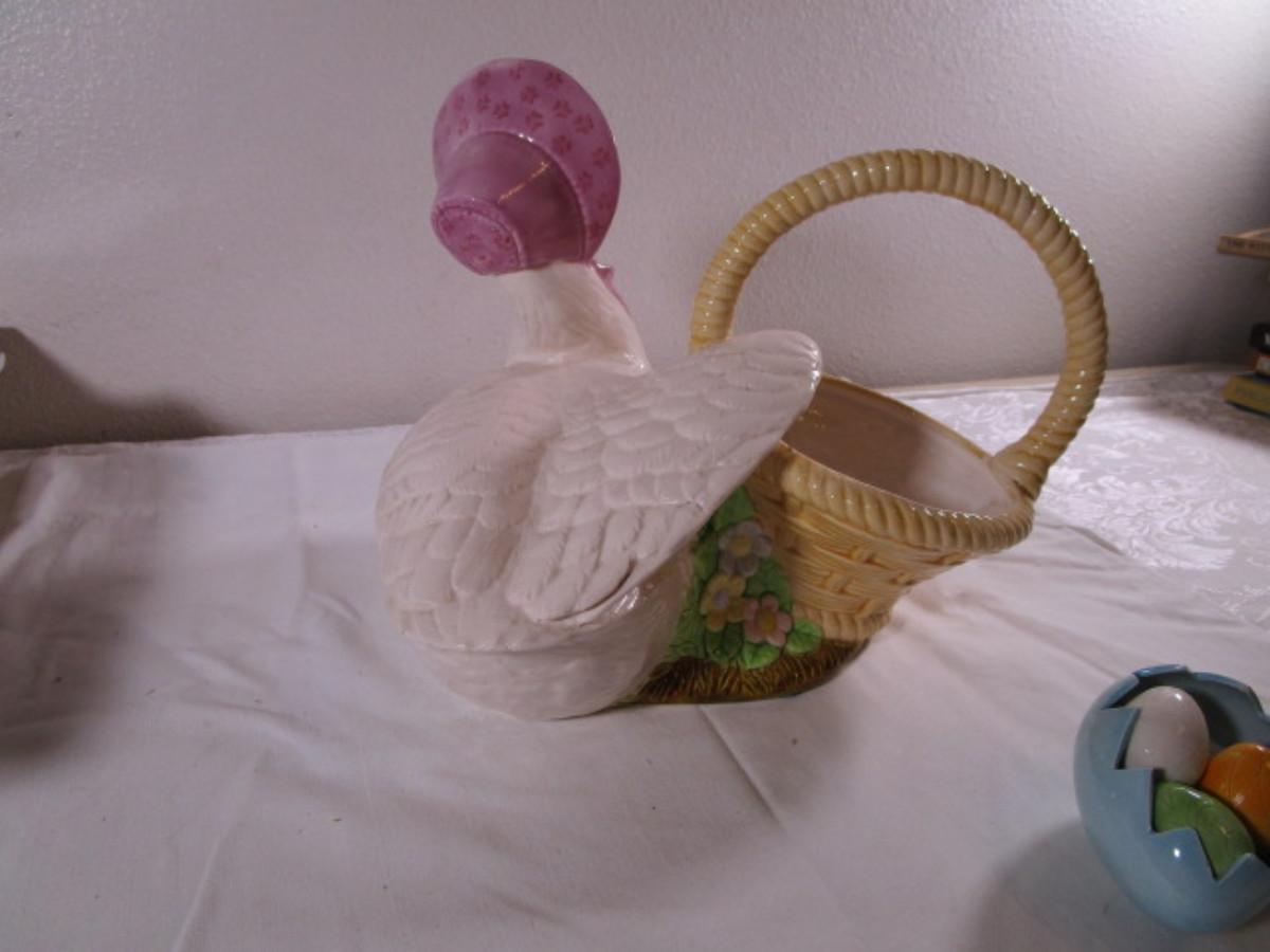 Ceramic duck with basket and bonnet, little duck & chicken & egg