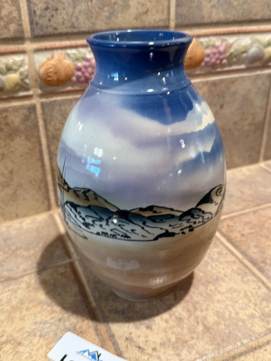 Ceramic hand painted & signed Vase w/mountain theme 8.5”