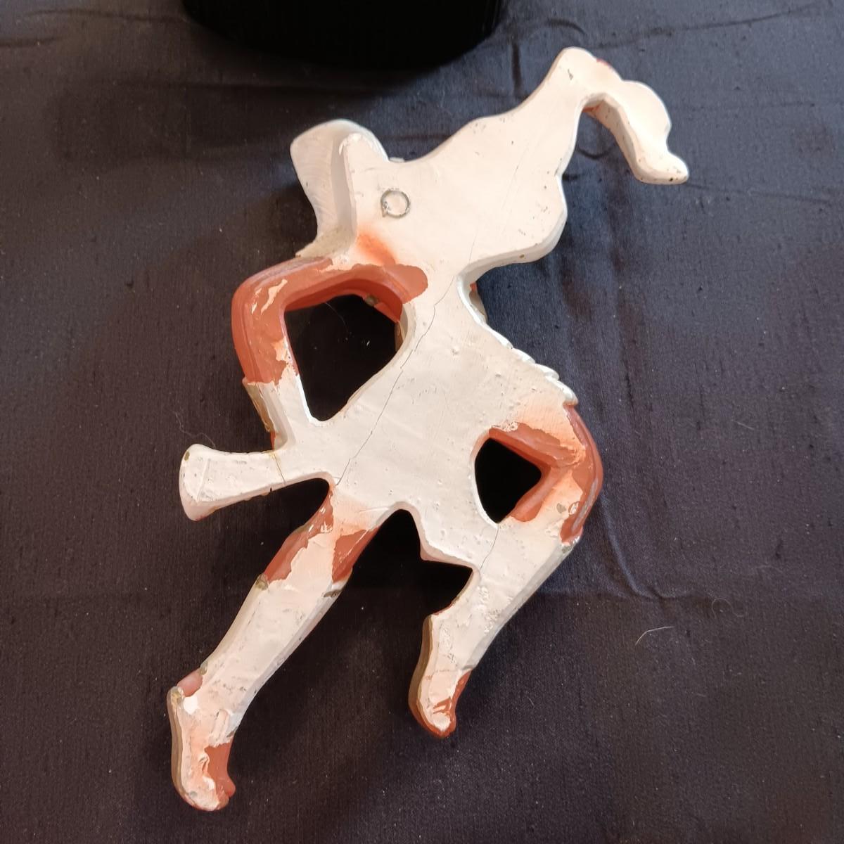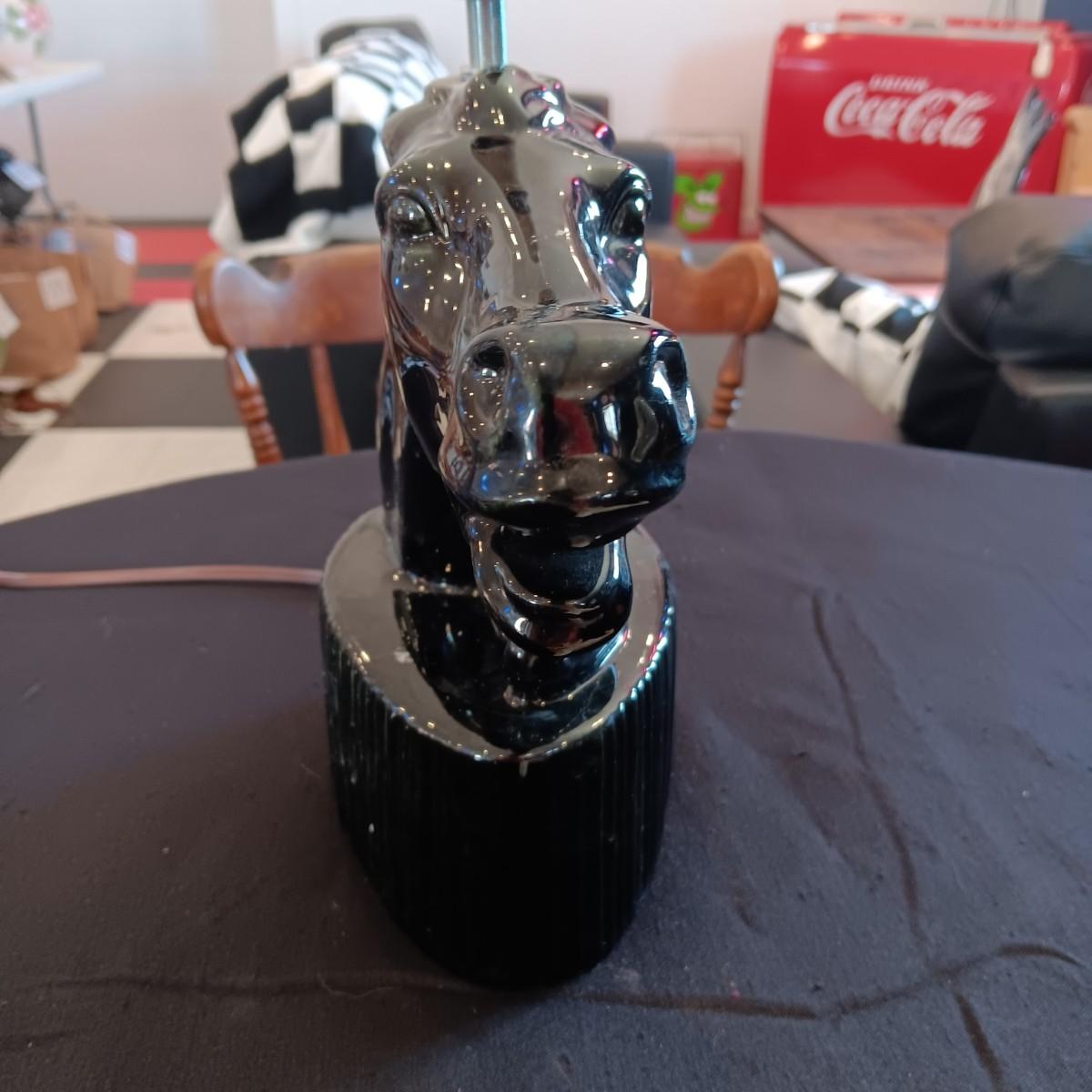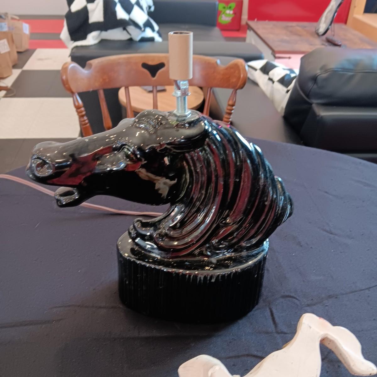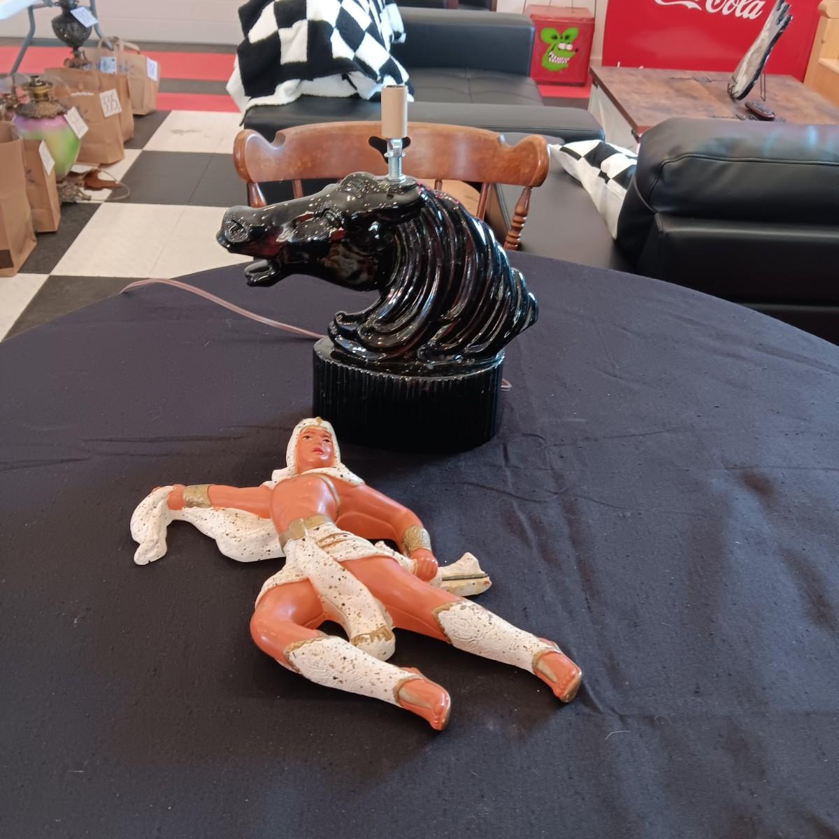 CERAMIC HORSE HEAD LAMP AND A CHALKWARE UNIVERSAL STATUARY WALL HANGING