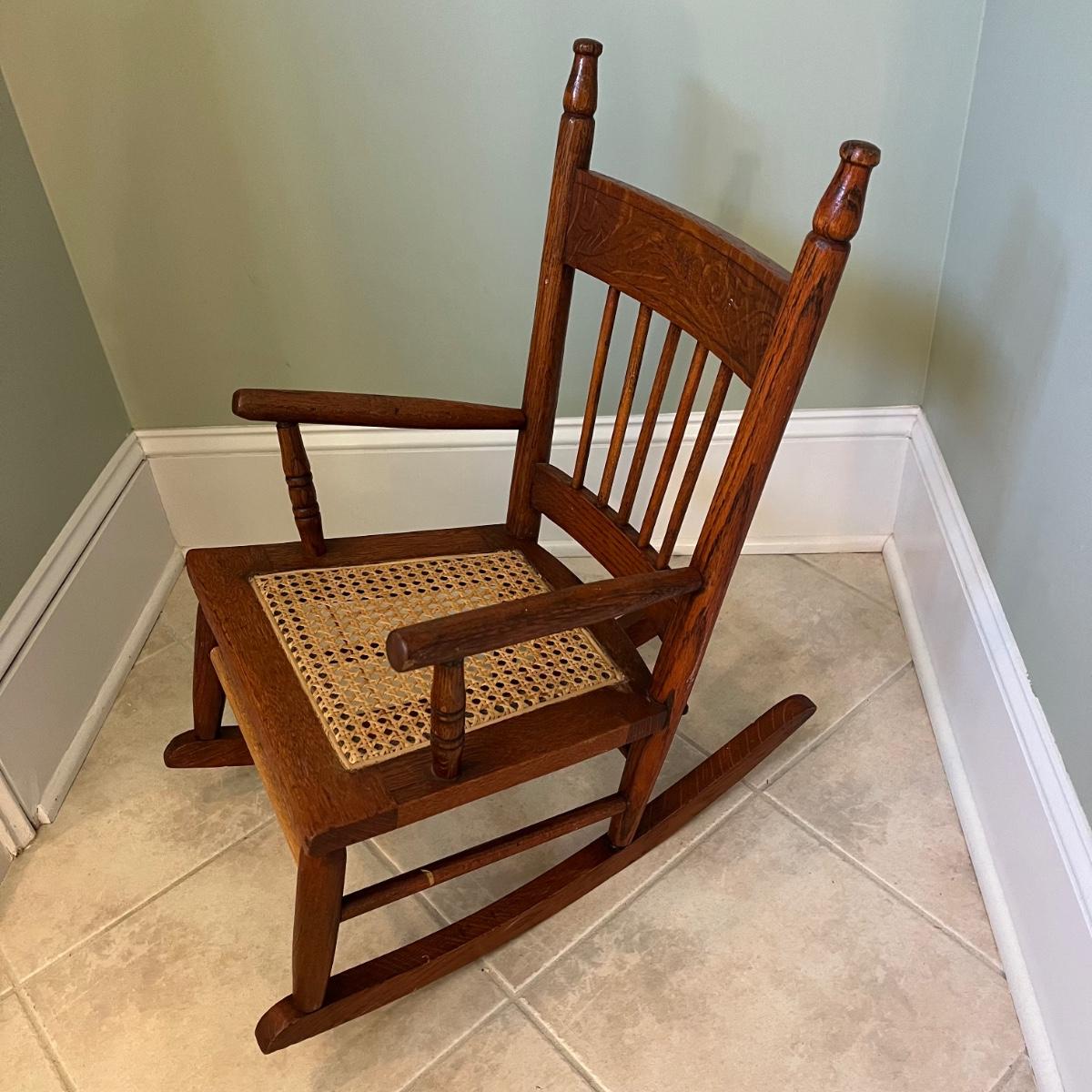 Wooden child’s rocking chair with cane seat and embossed back. Measuring 14” x 22.5” x 24”H. The cane seat appears to be in good shape and the chair overall seems sturdy but the left arm and left rocker need to be tightened with glue.