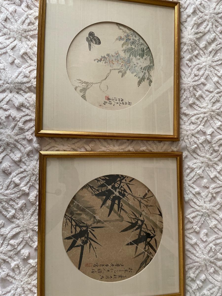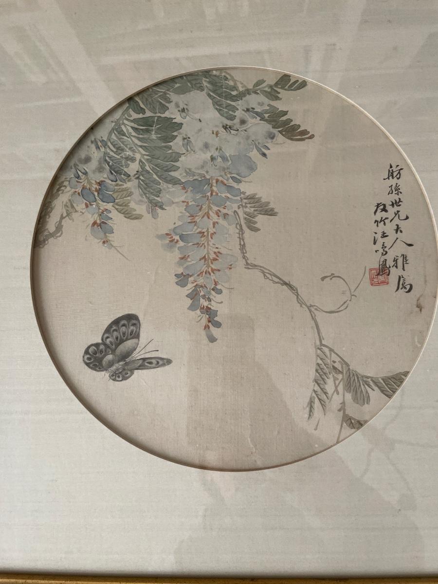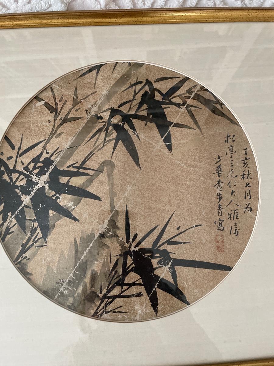 Possibly silk butterfly print and rice paper bamboo. Approx 15” square frame