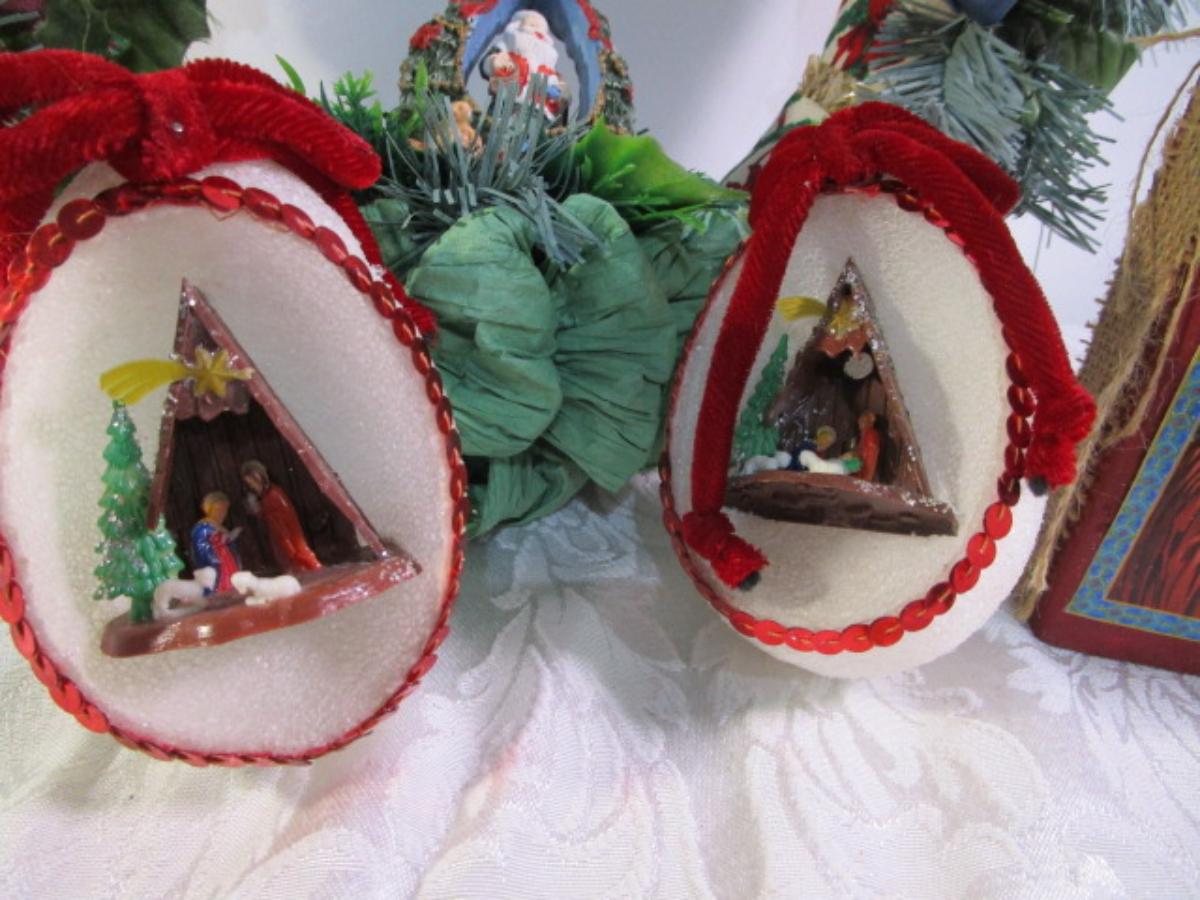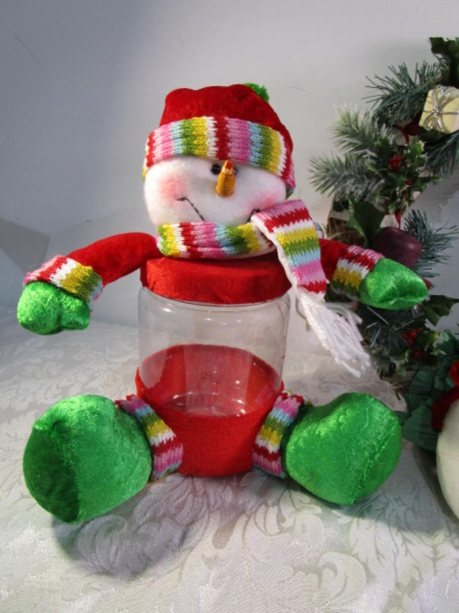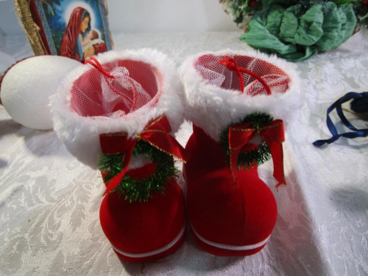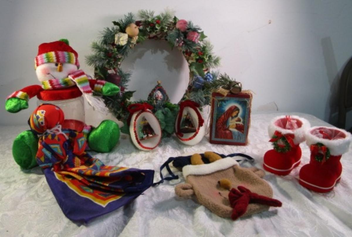 Snowman jar, 2 nativity ornaments, Mother & child decoration, 2 Santa boots, Snowman bag, wreath