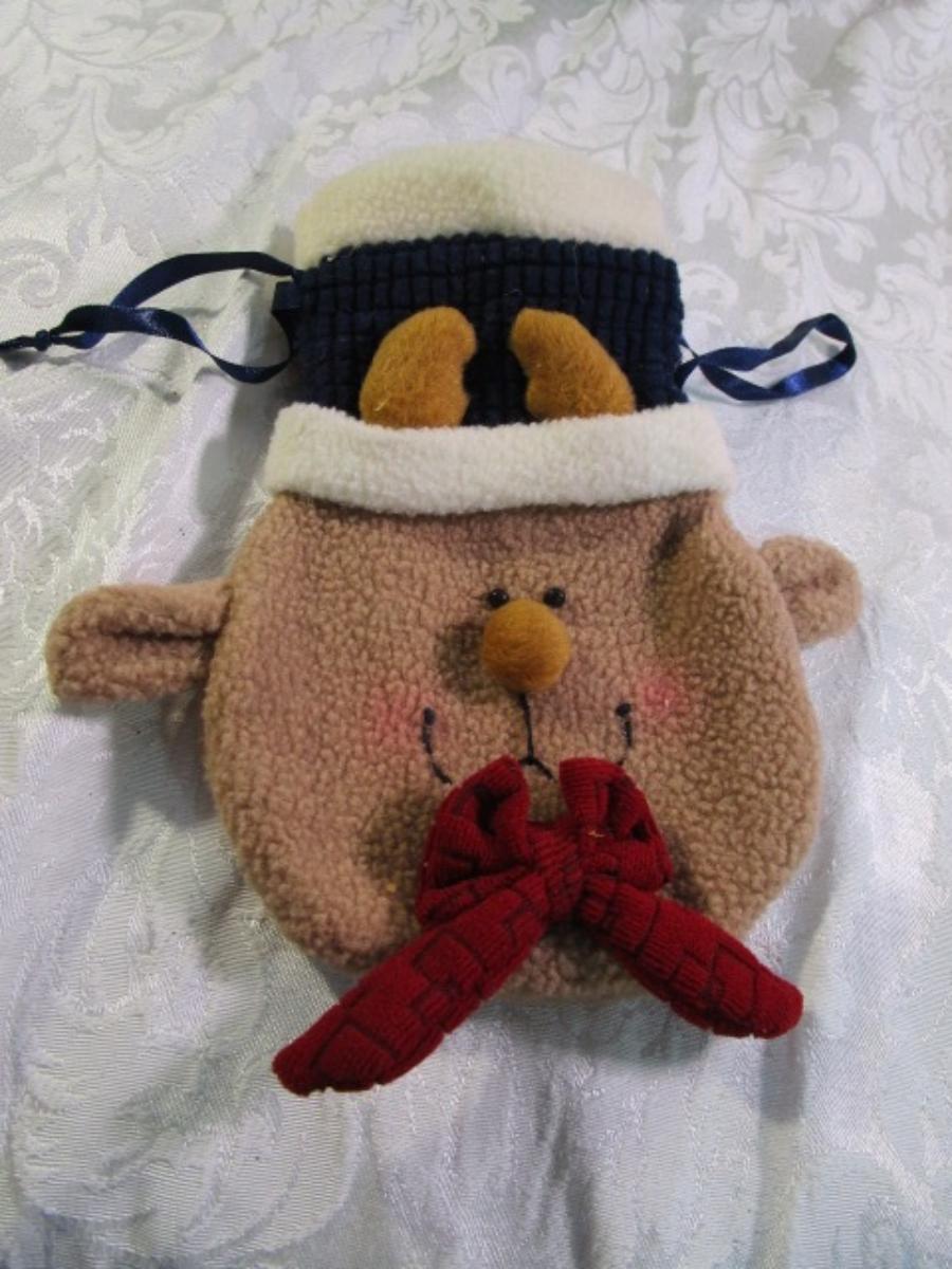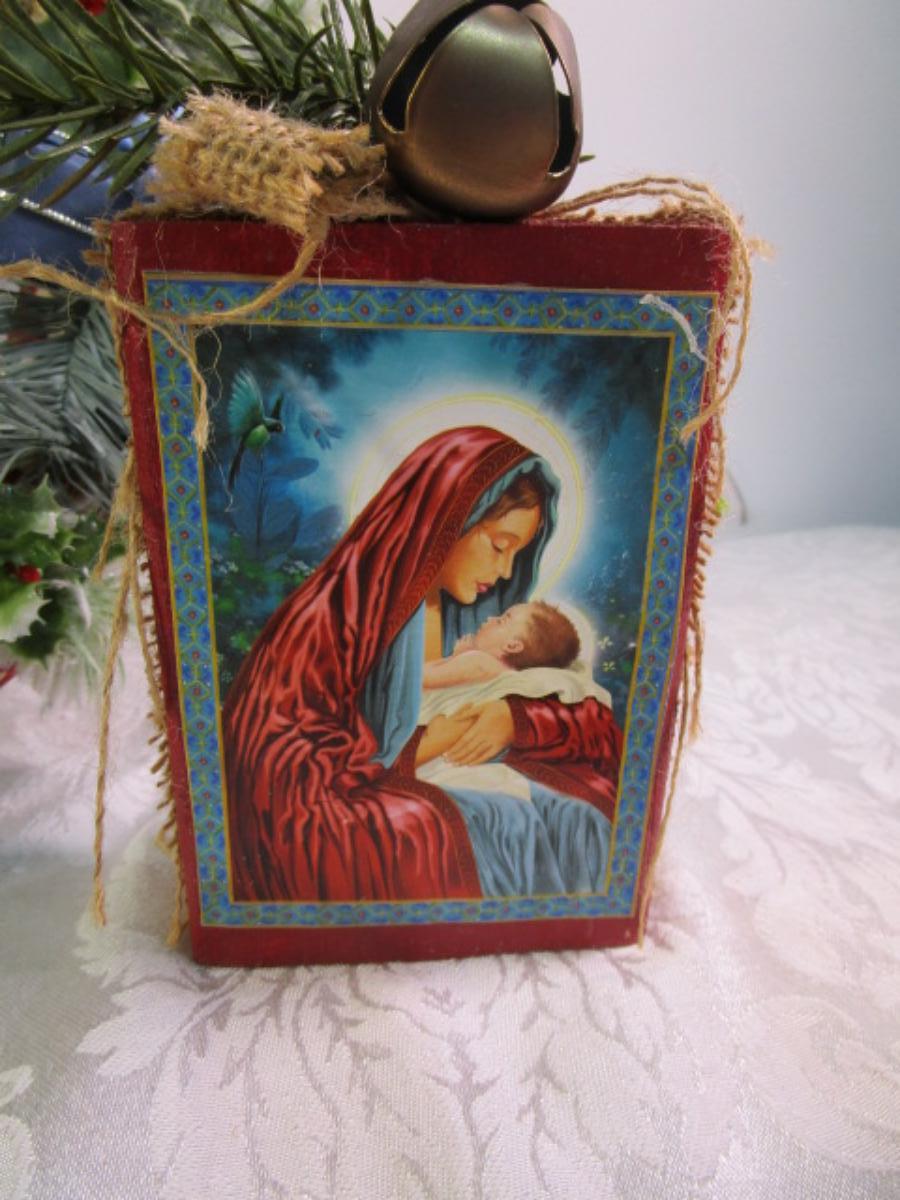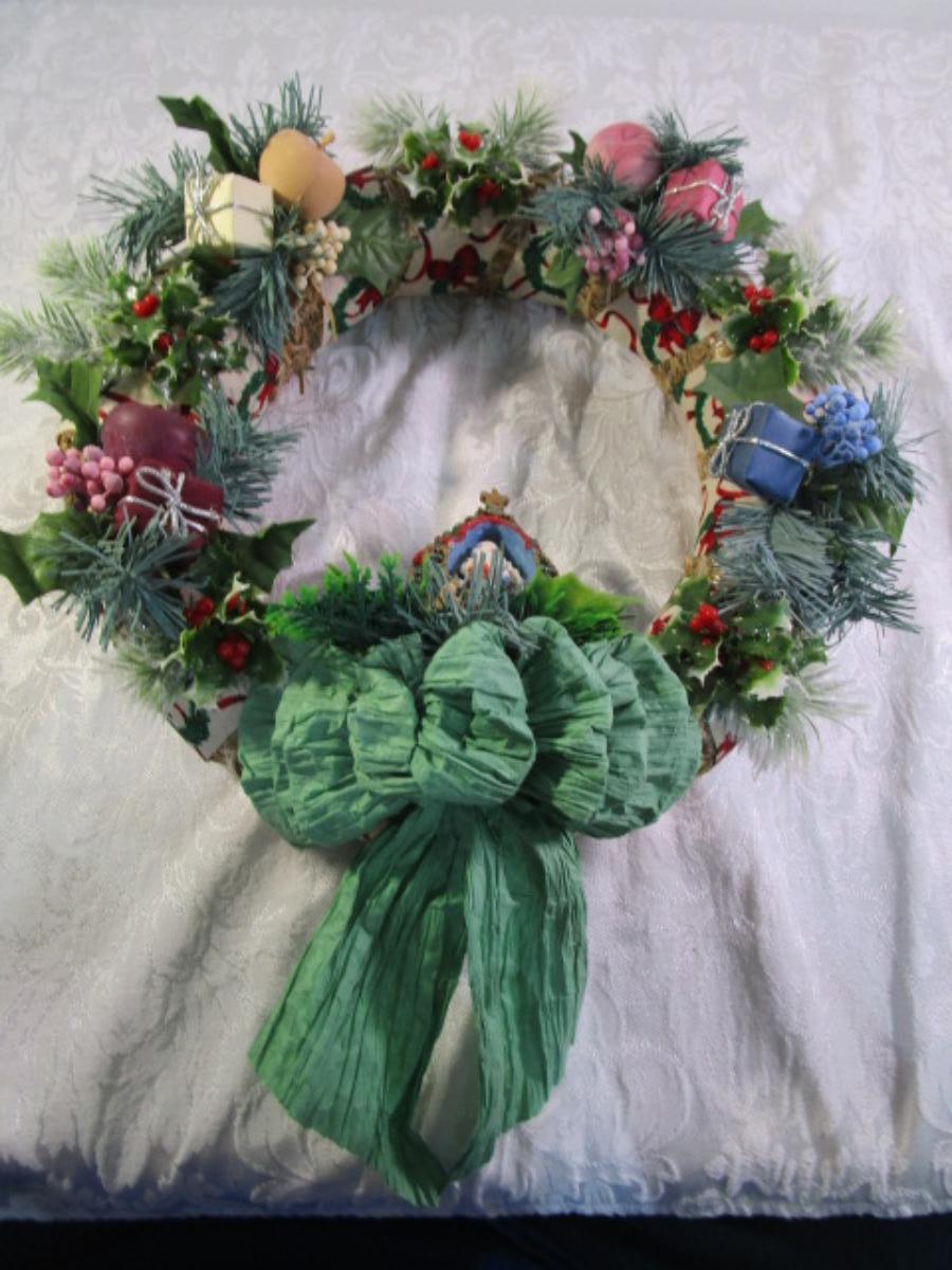 Snowman jar, 2 nativity ornaments, Mother & child decoration, 2 Santa boots, Snowman bag, wreath