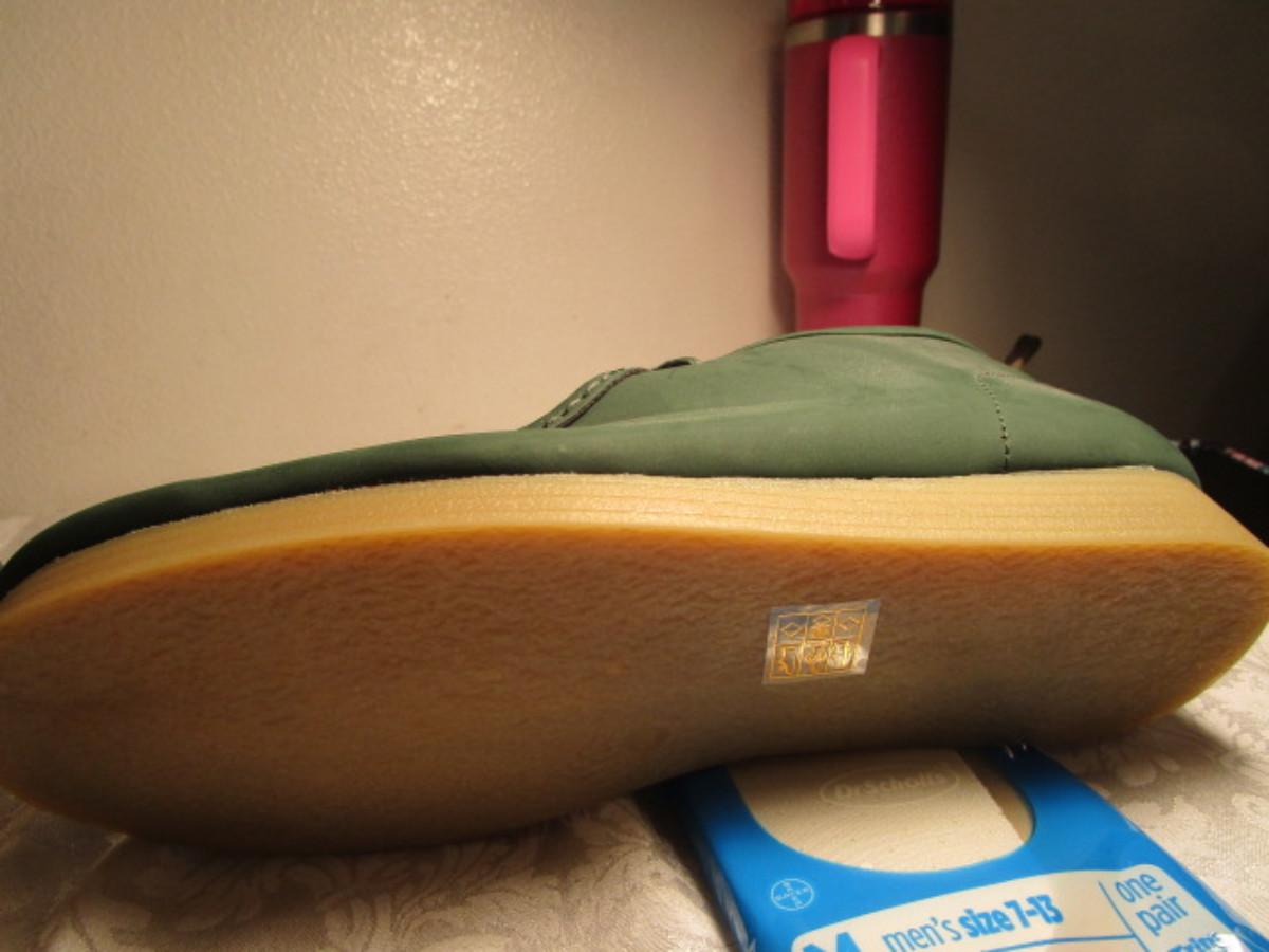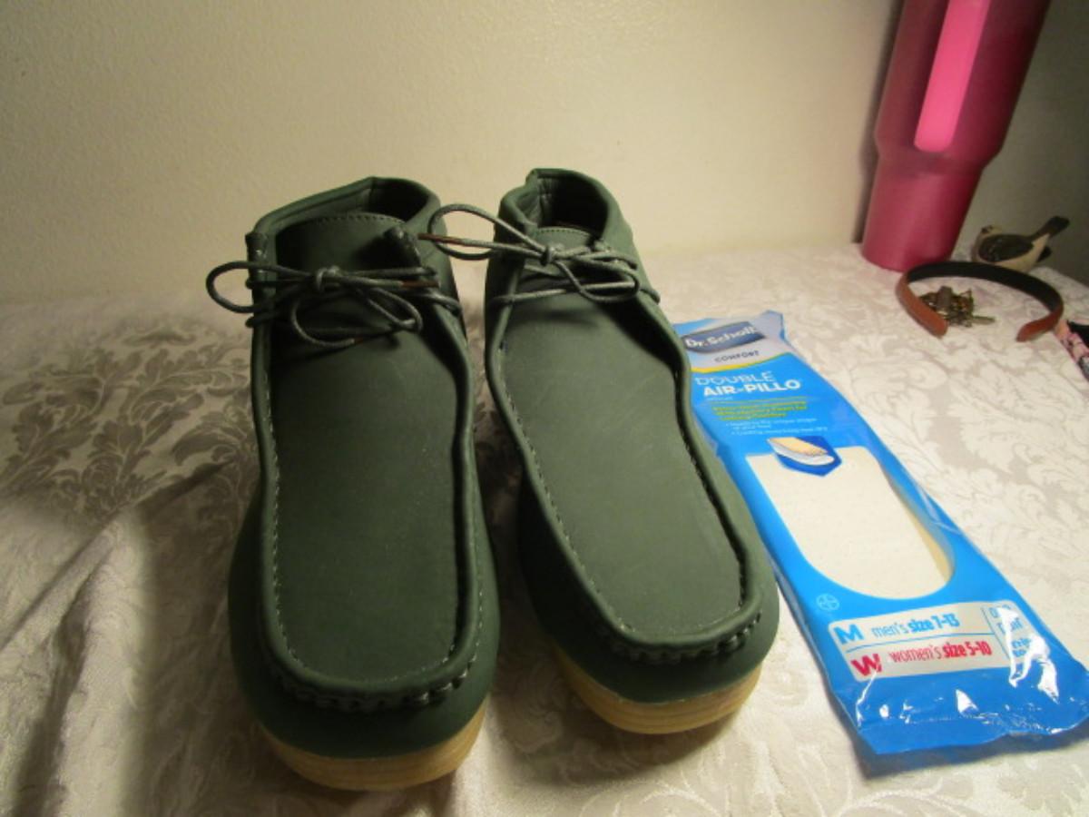 Chukka Boots men's size 14, green, and 1 pkg Dr. Scholl's insoles