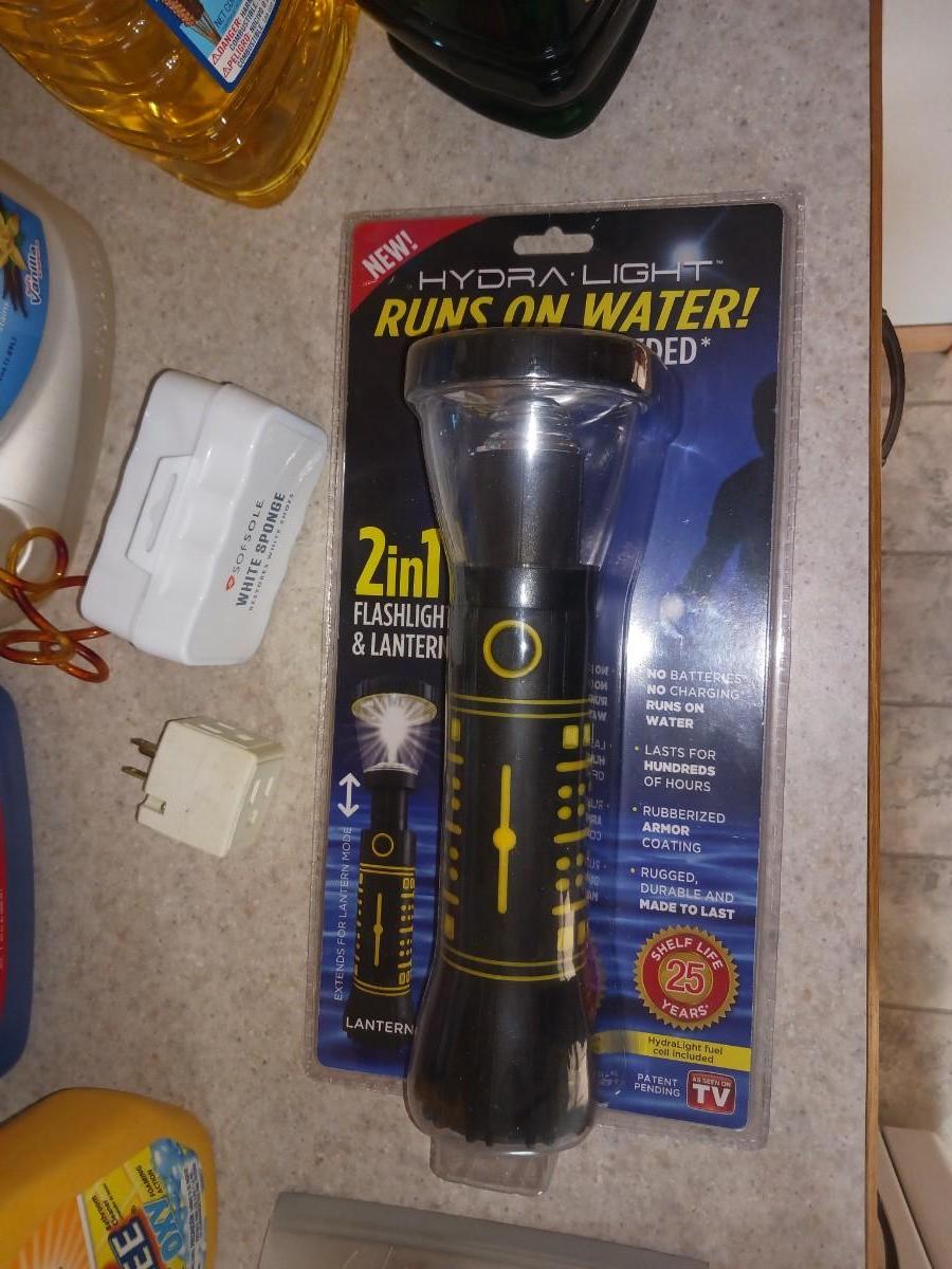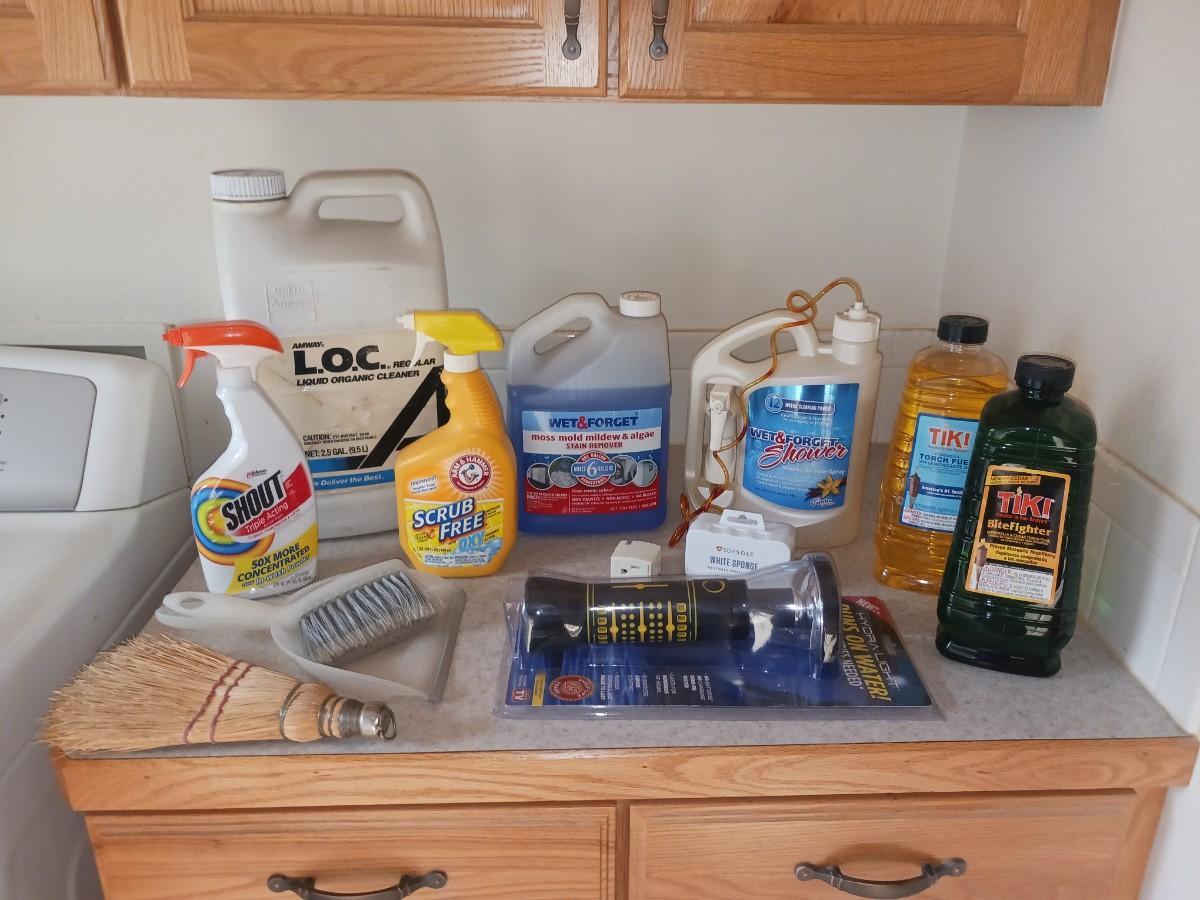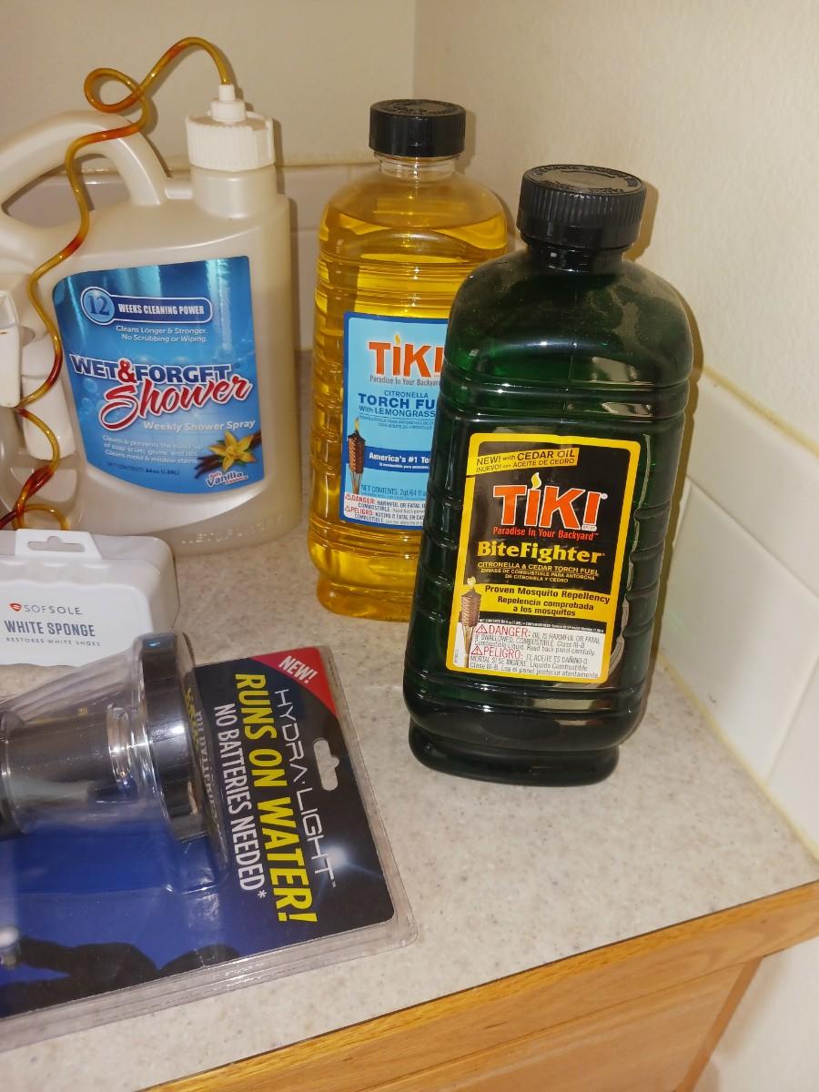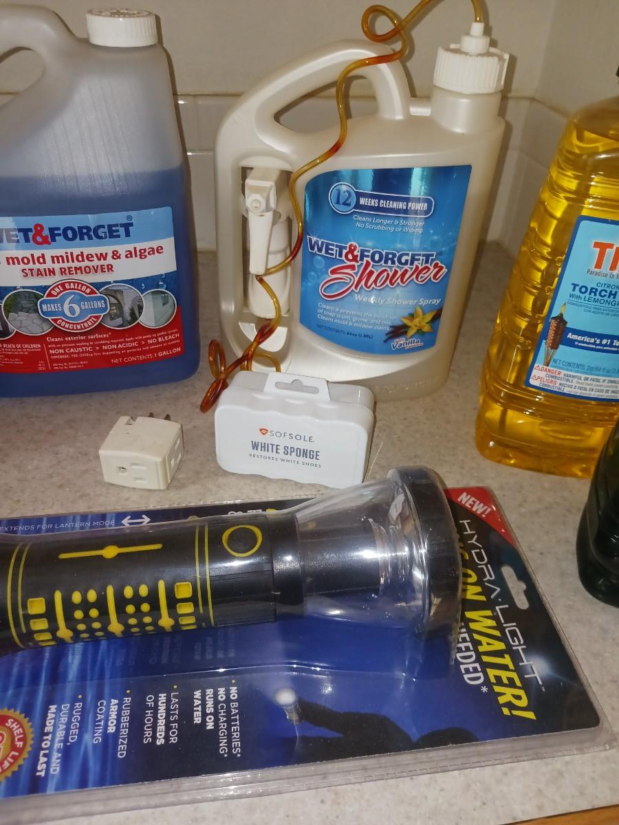 CLEANING SUPPLIES, FLASHLIGHT THAT RUNS ON WATER AND TIKI TORCH FUEL