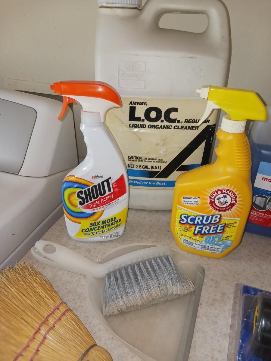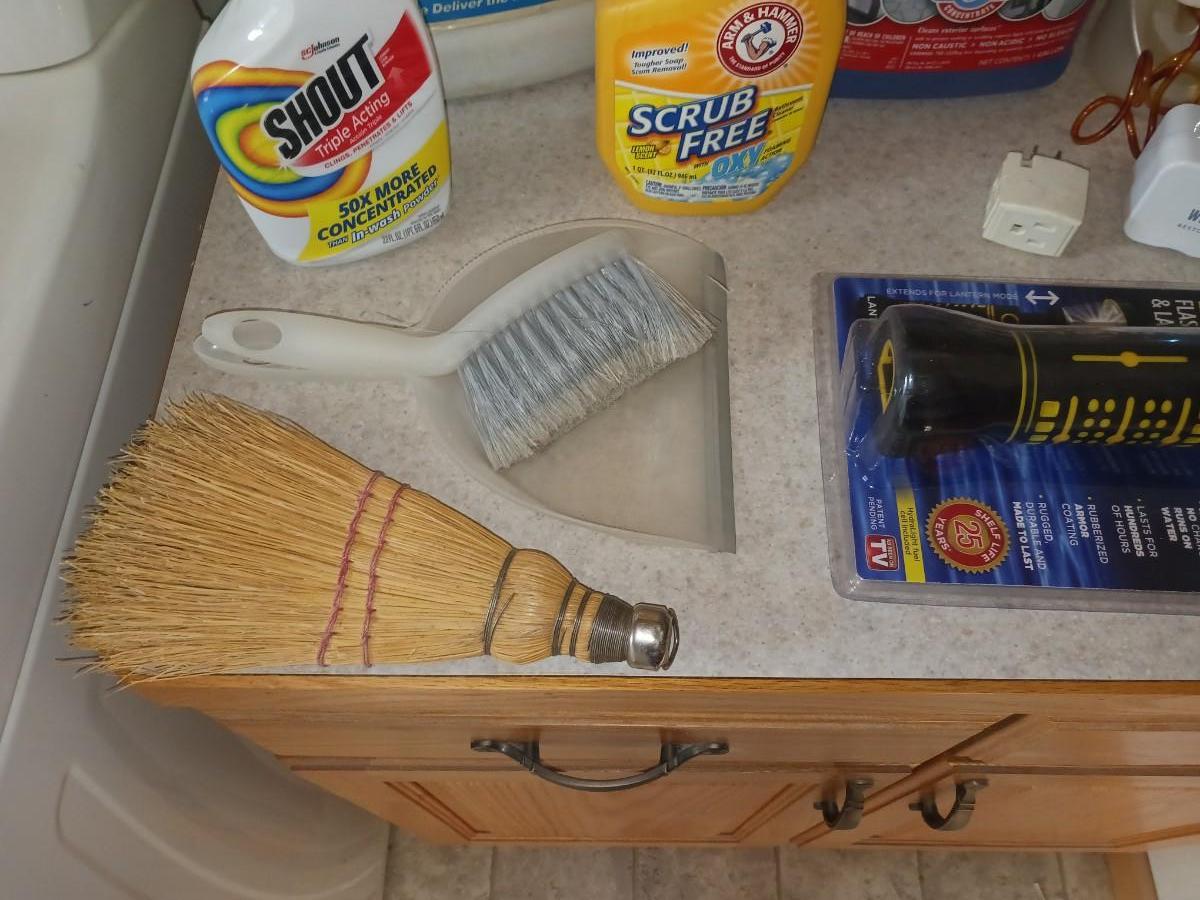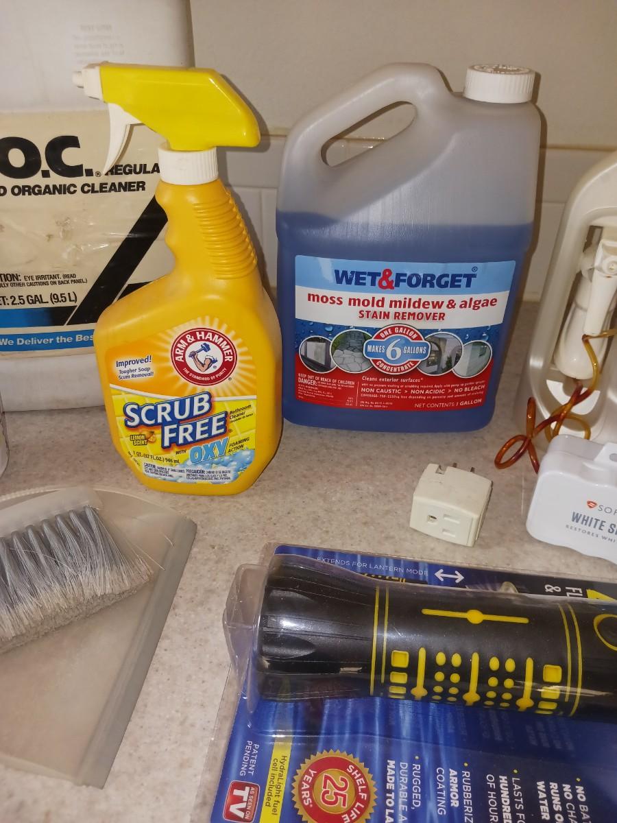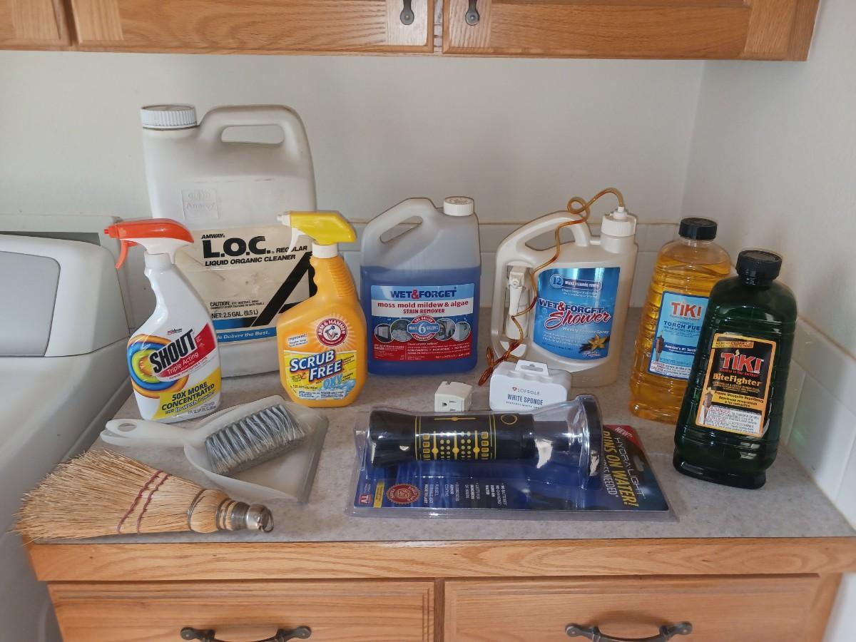 CLEANING SUPPLIES, FLASHLIGHT THAT RUNS ON WATER AND TIKI TORCH FUEL