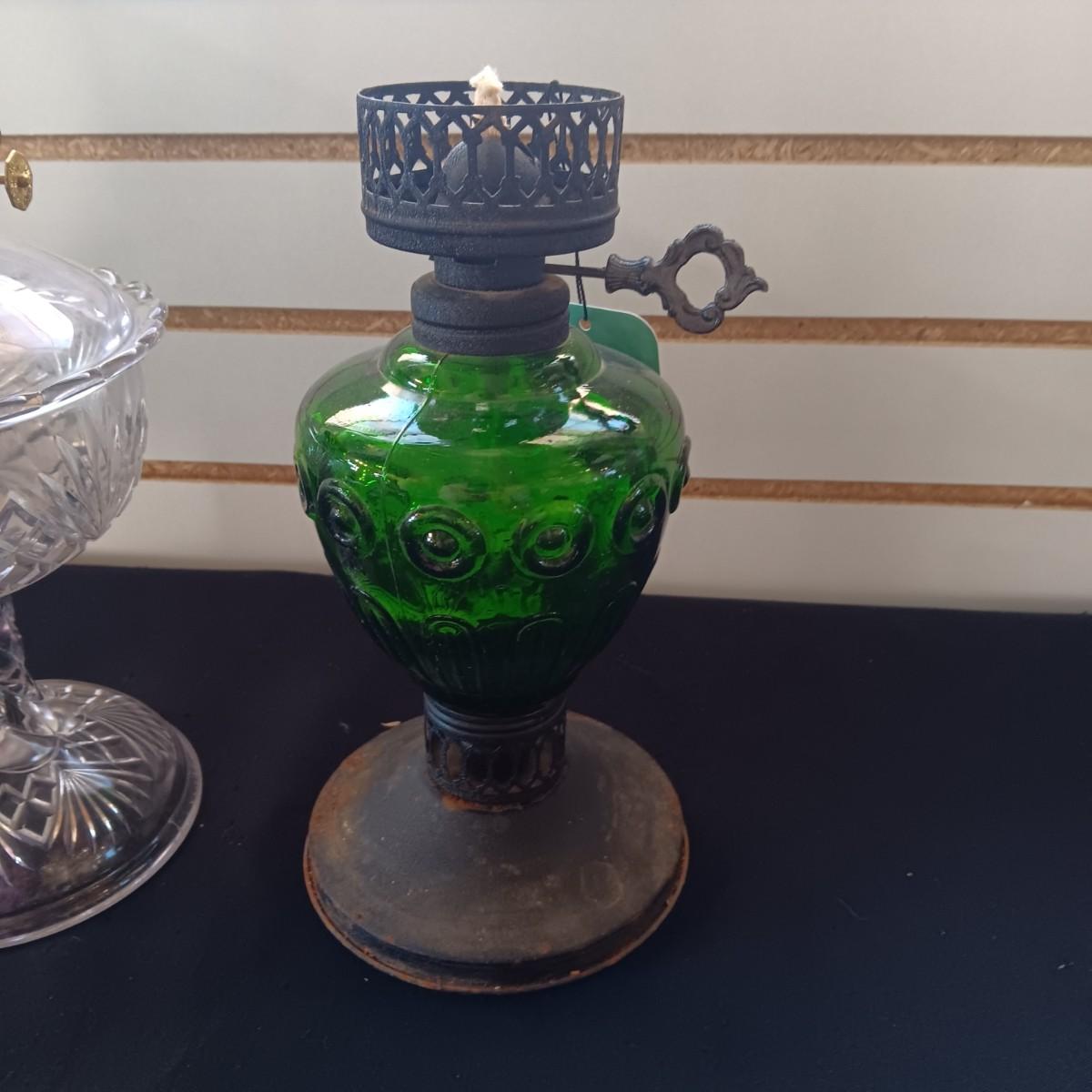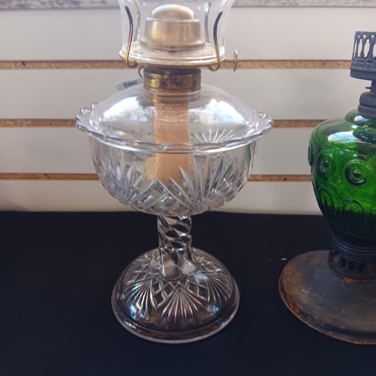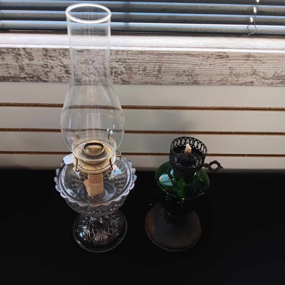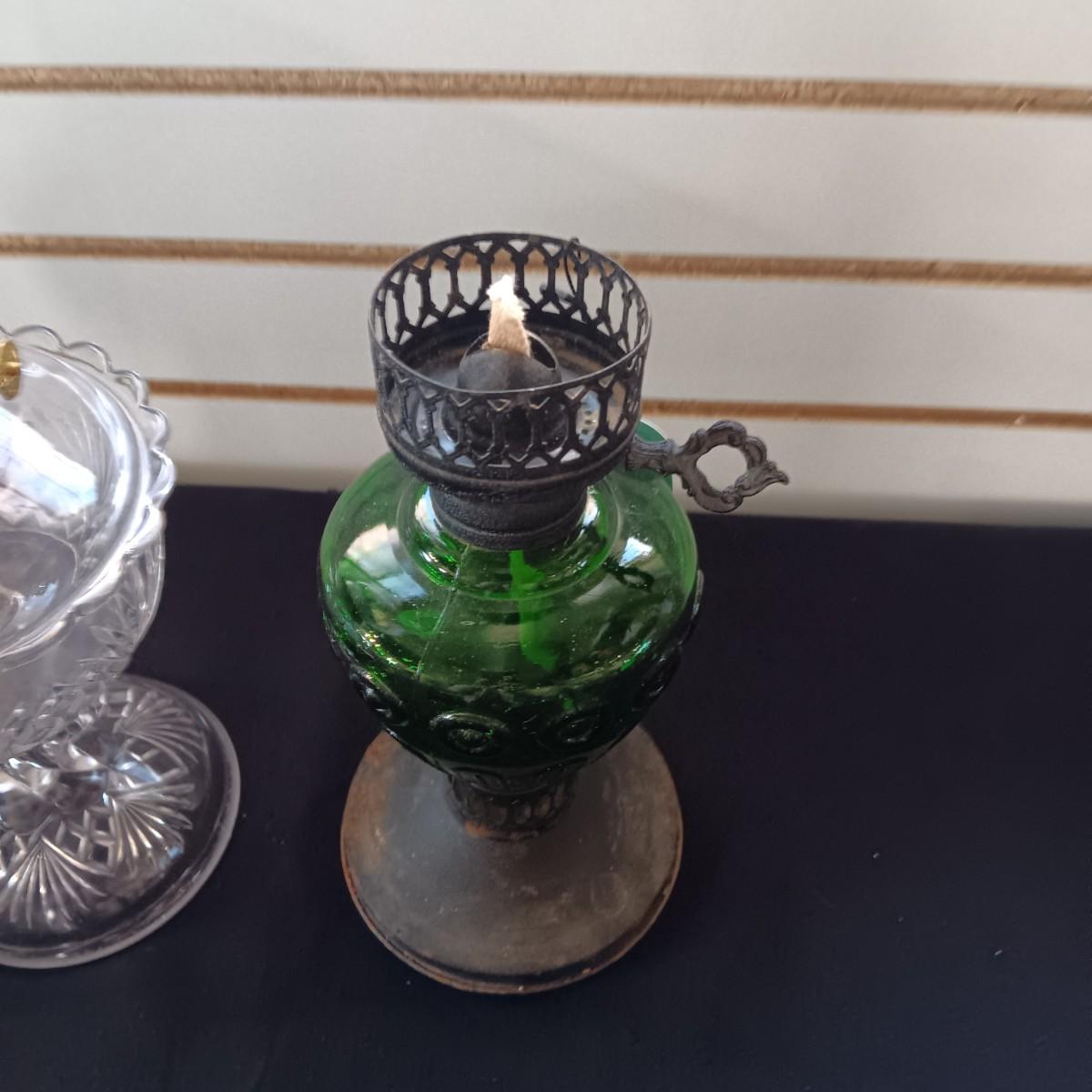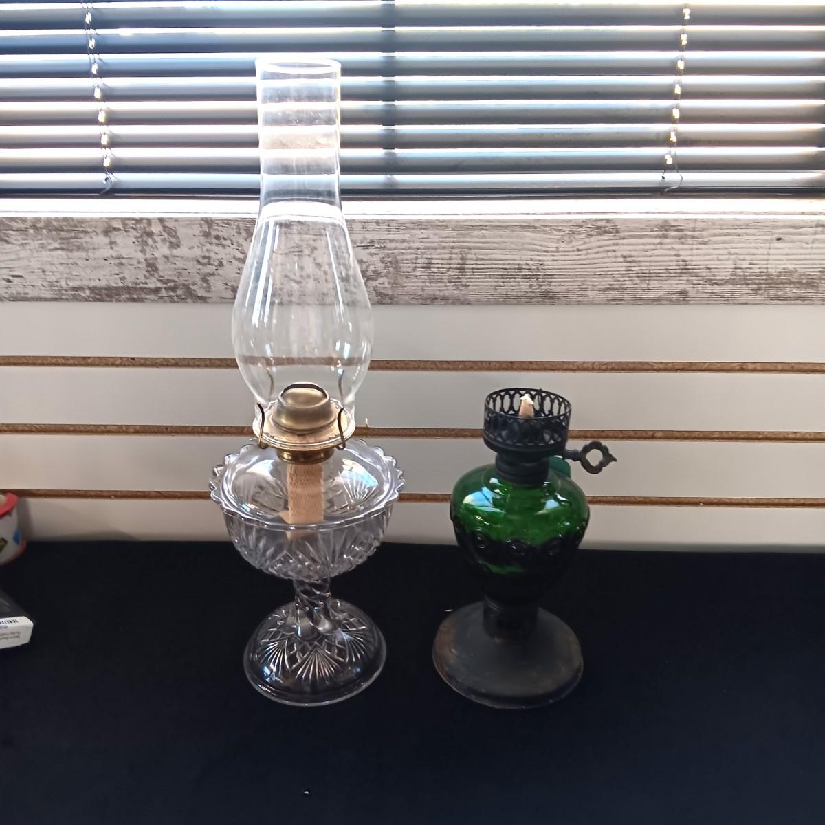 CLEAR FILIGREE AND GREEN GLASS OIL LAMPS