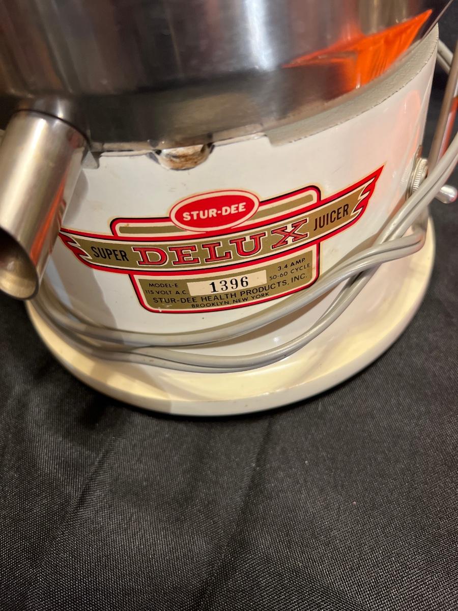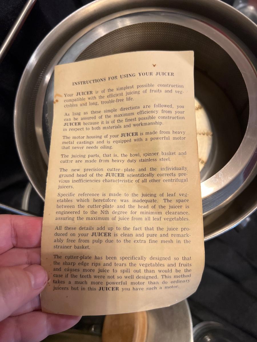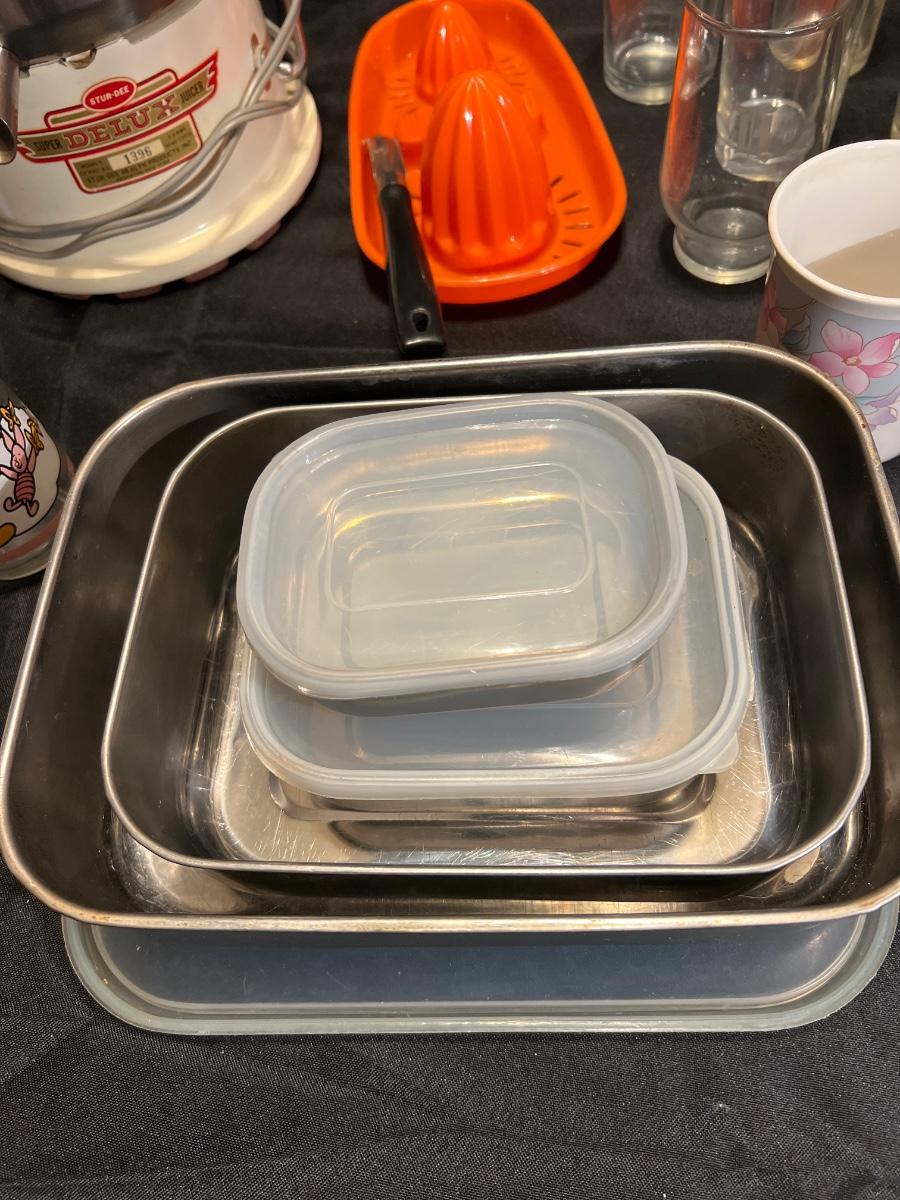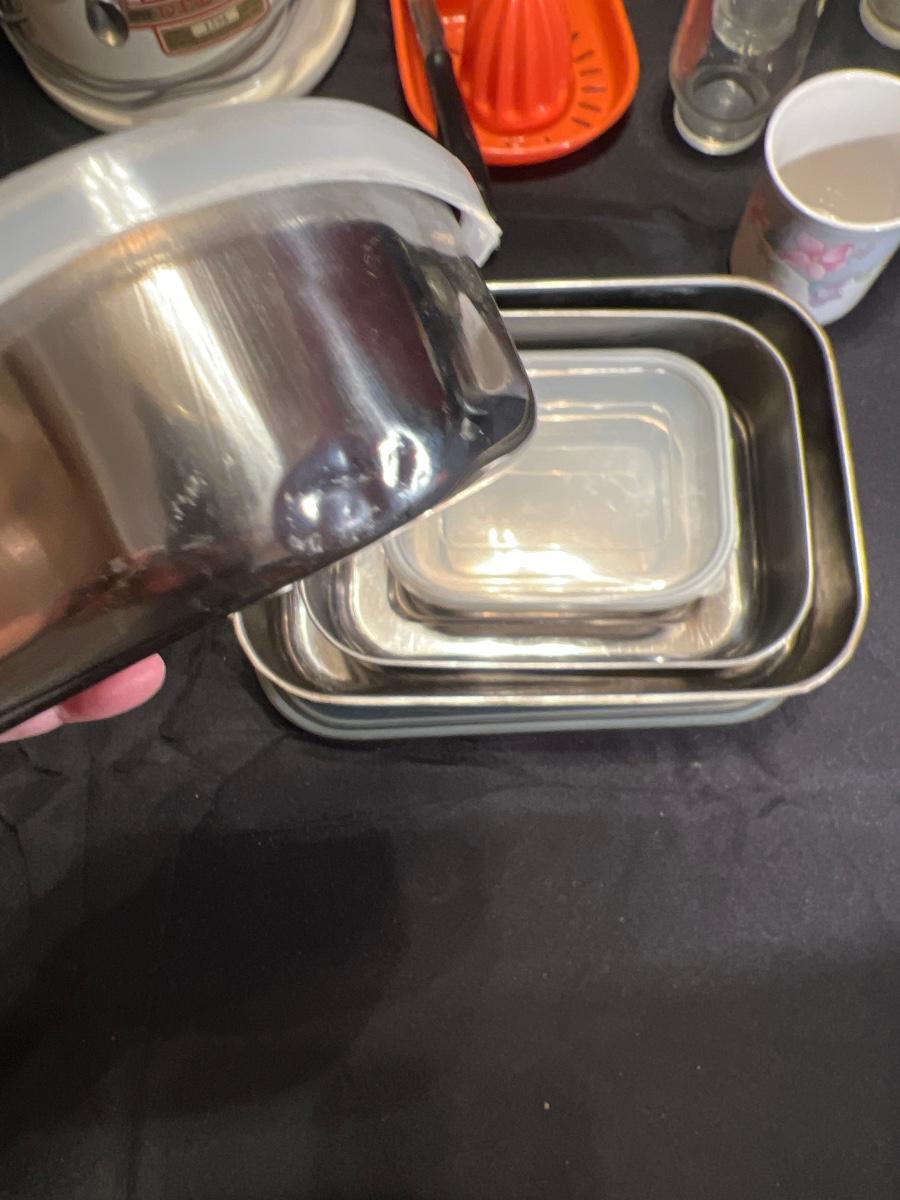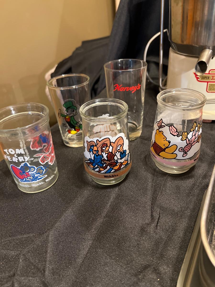 Working Vintage 1940’s juicer, vintage jelly jar glasses, and set of 4 storage containers (one missing lid) and one dent in one.