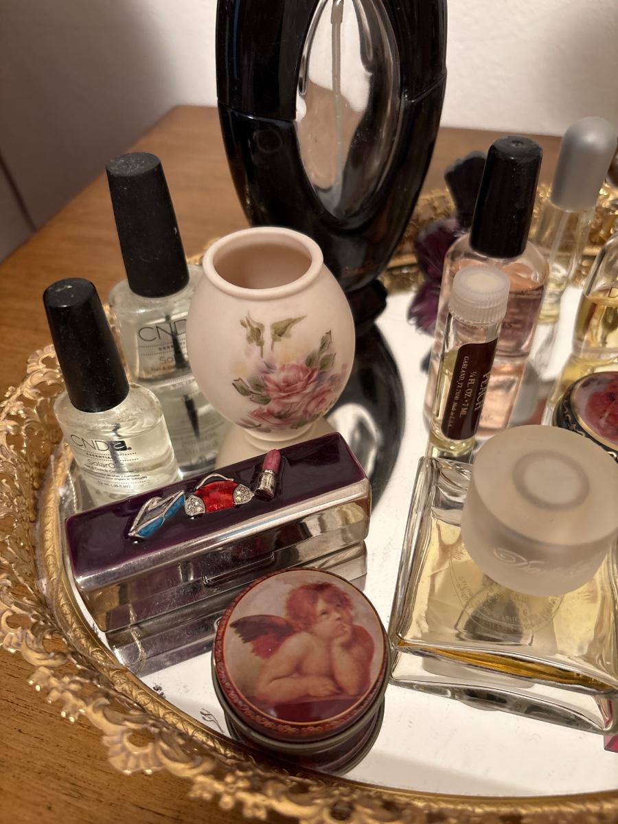 Great collectible mini perfume bottles, Mirrored display tray with gold colored edge and mirror stand