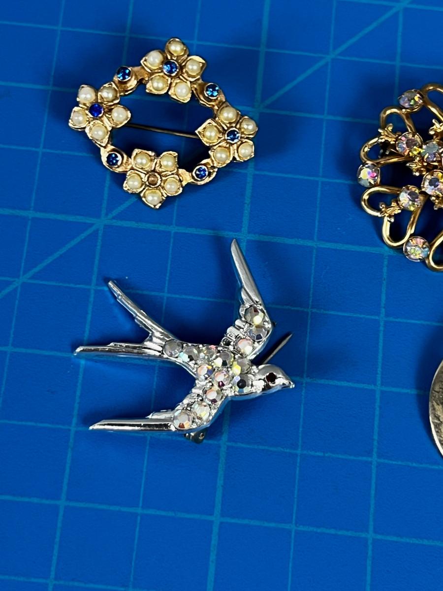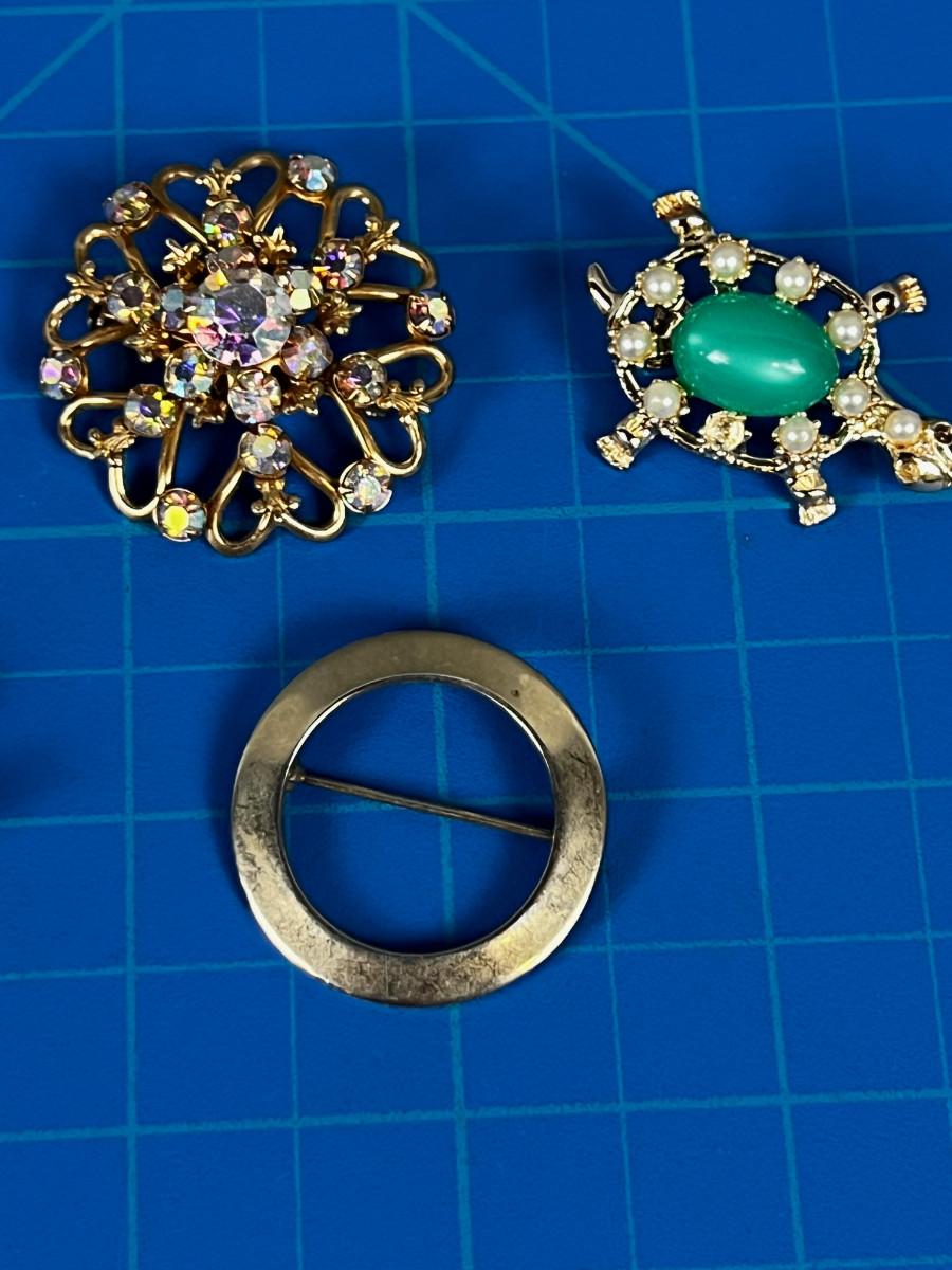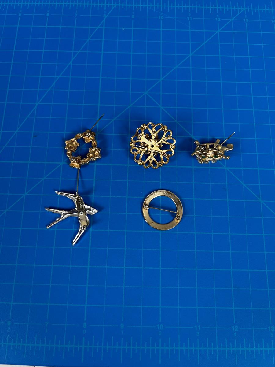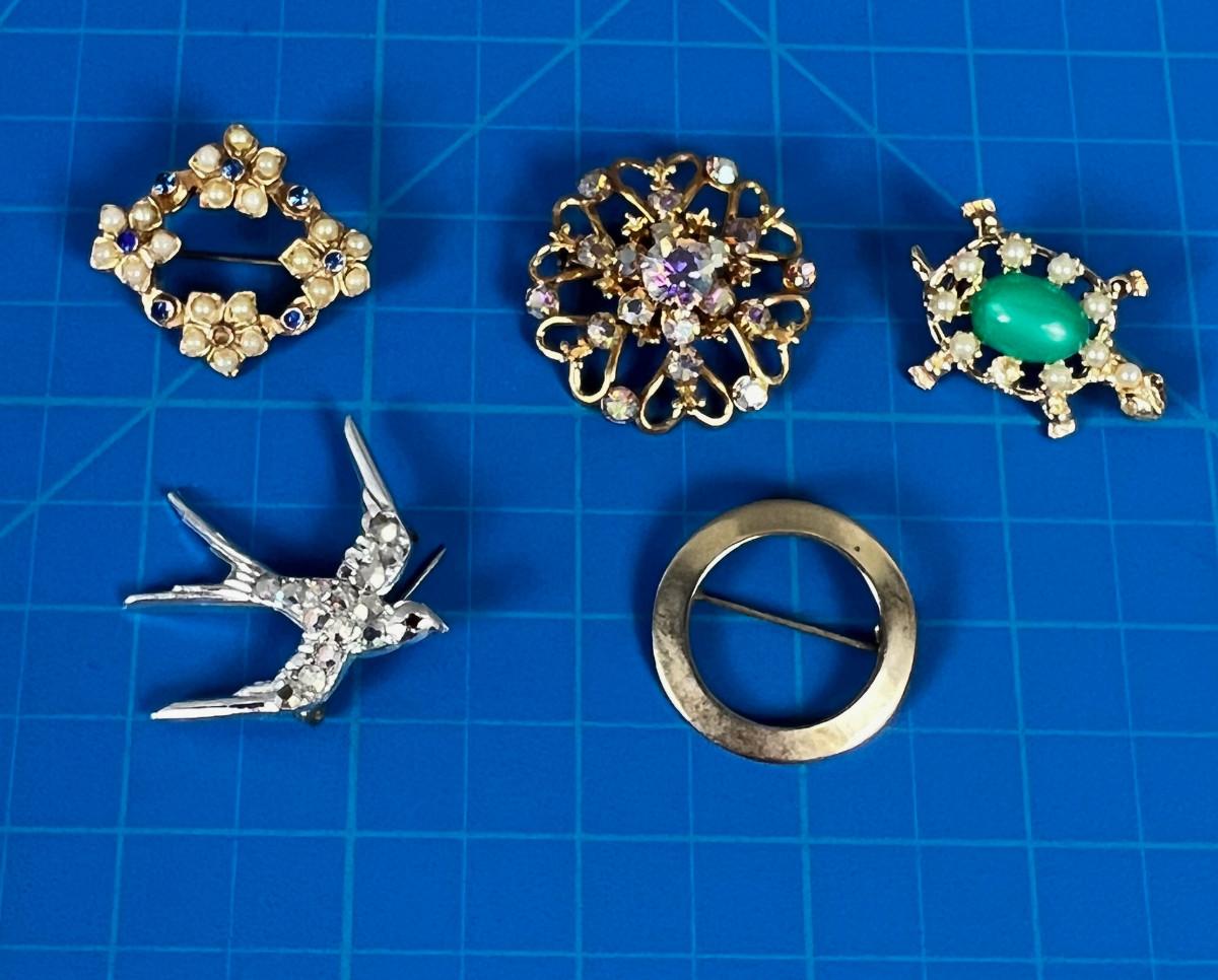 Collection of (5)Broches: Rhinestones, Turtle, Bird Etc.