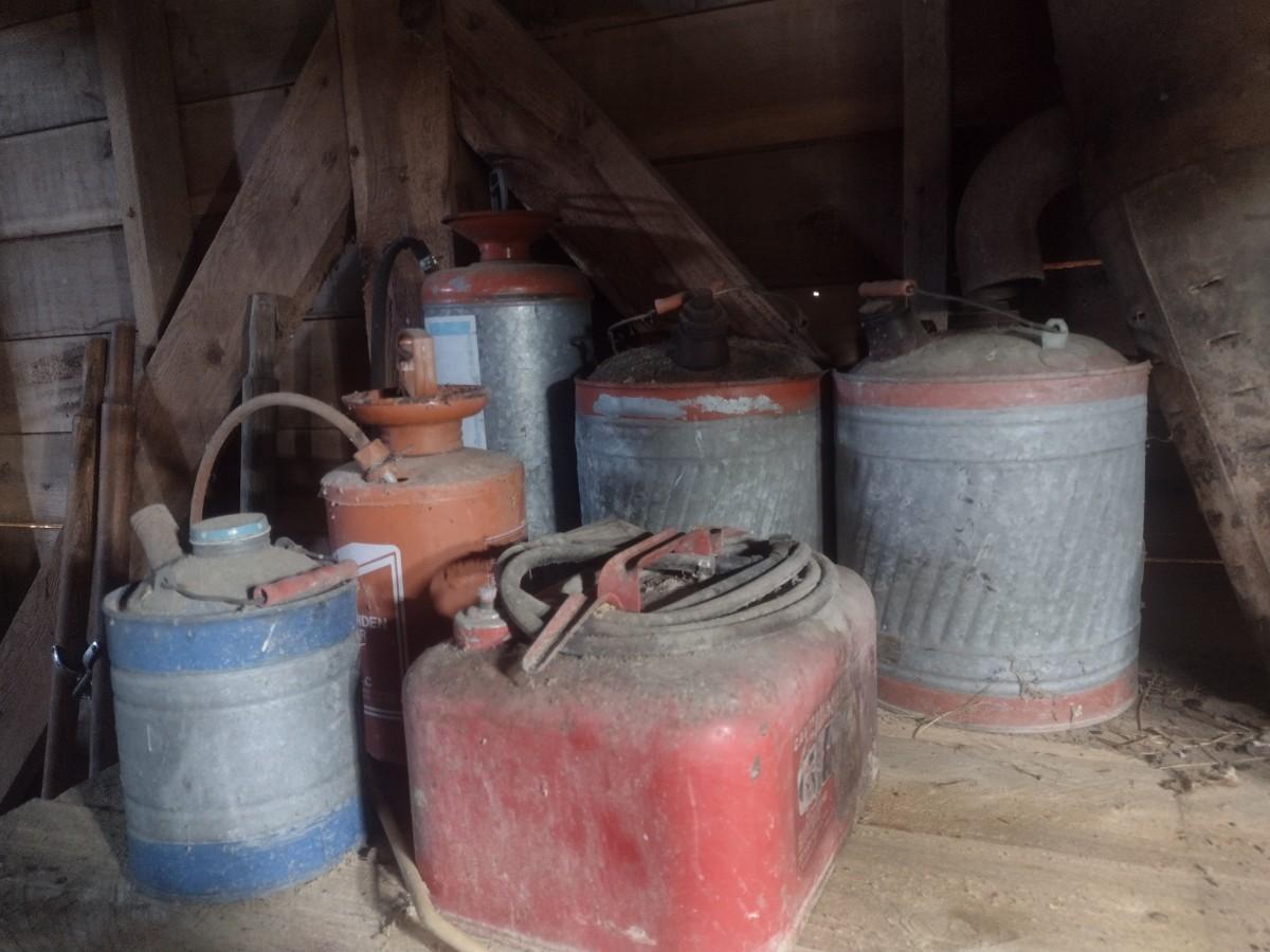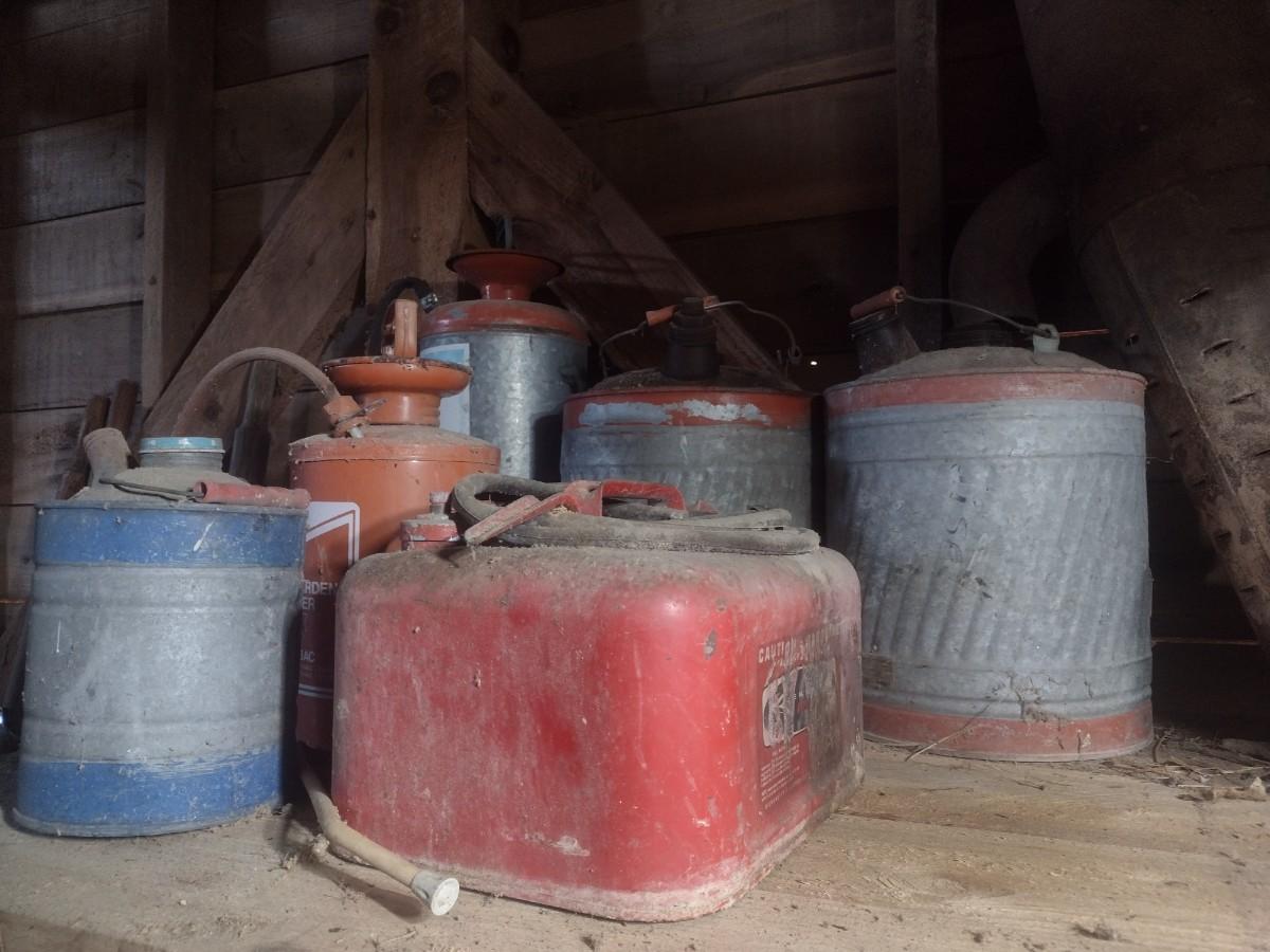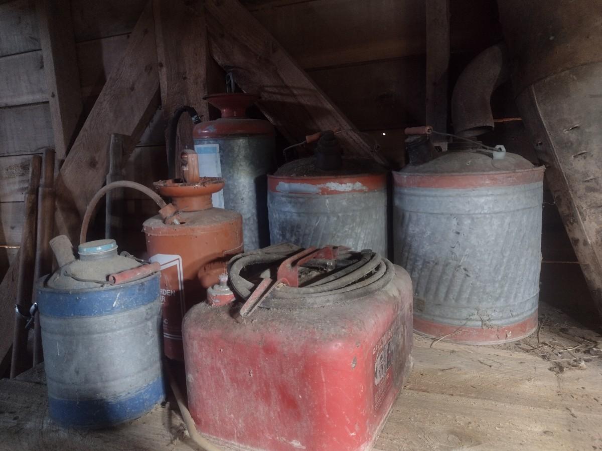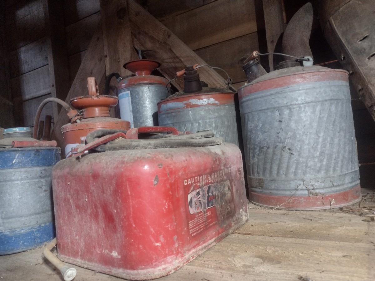 Collection of Vintage Metal and Galvanized Fuel Cans and Other Choice A