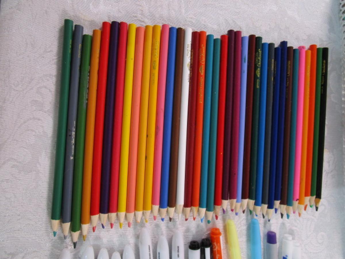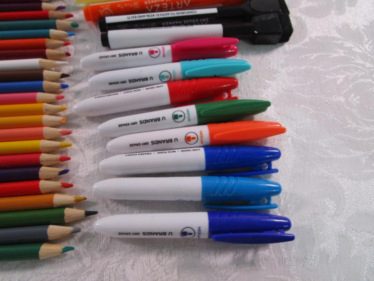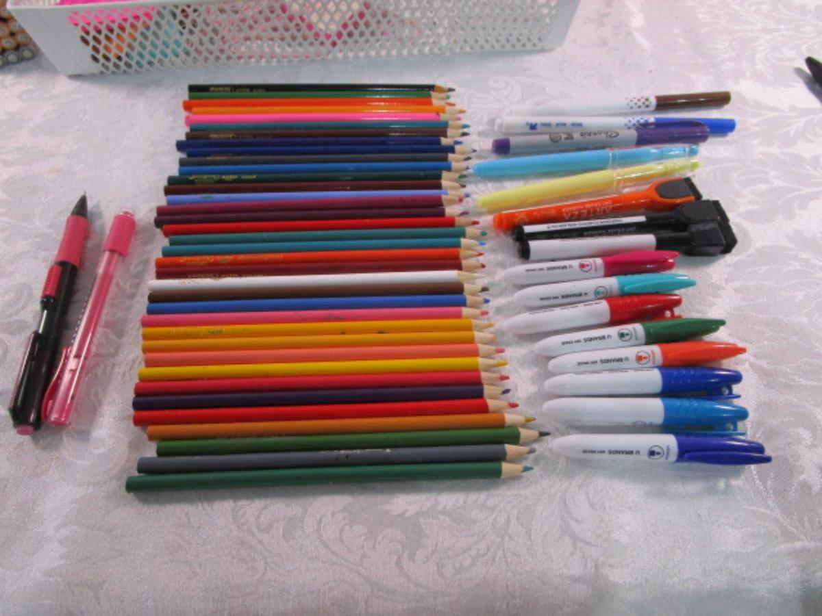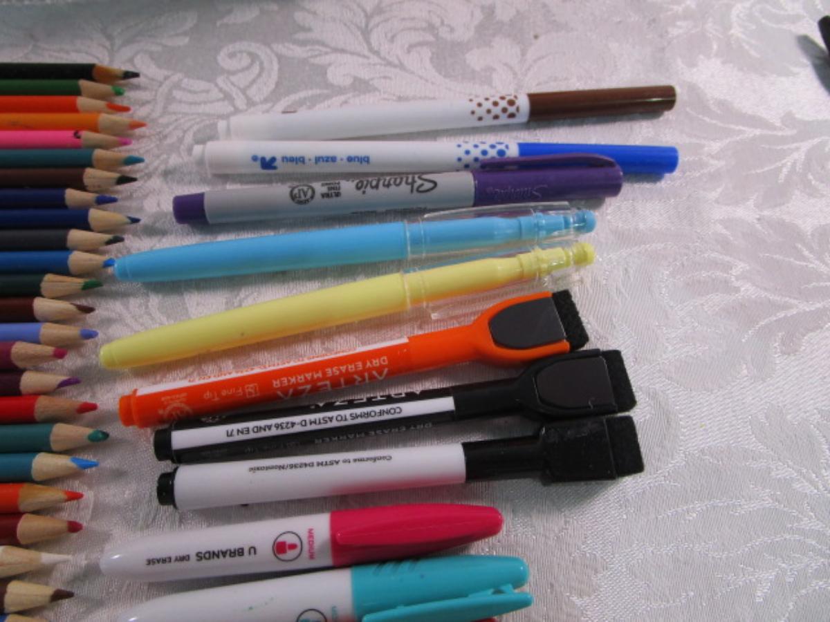 Colored pencils, markers, highlighters, expo markers, Pentel pencil & eraser