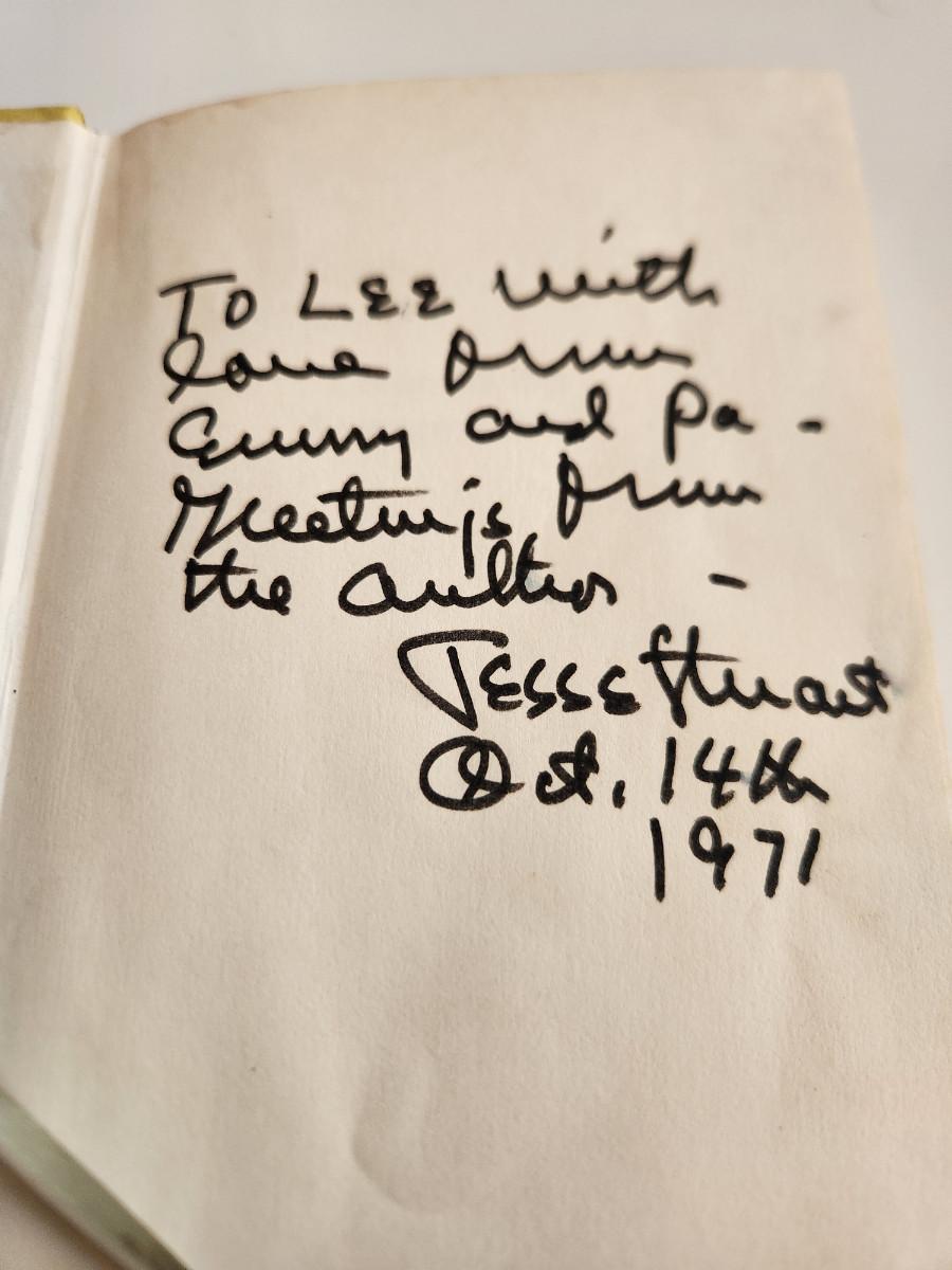 This auction lot is a First Edition copy of the book Come To My Tomorrowland by Jesse Stuart - Autographed by the author. This hardbound book is in good condition, the dust jacket is in OK condition with some minor tearing and taping of same with very light moisture damage on the bottom. The book has 196 pages and was published by Aurora in 1971