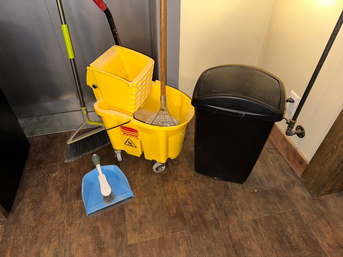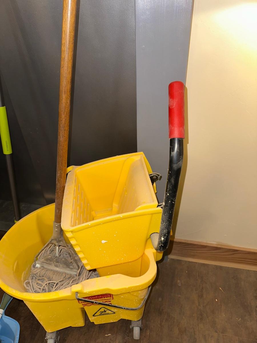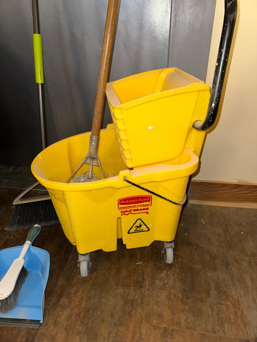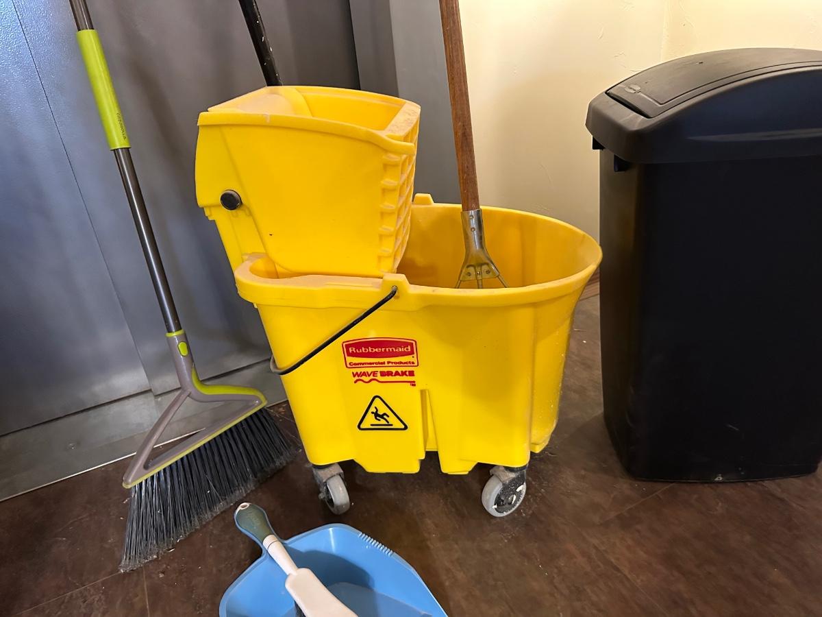 COMMERCIAL MOP BUCKET, MOP, WASTE CAN AND BROOM