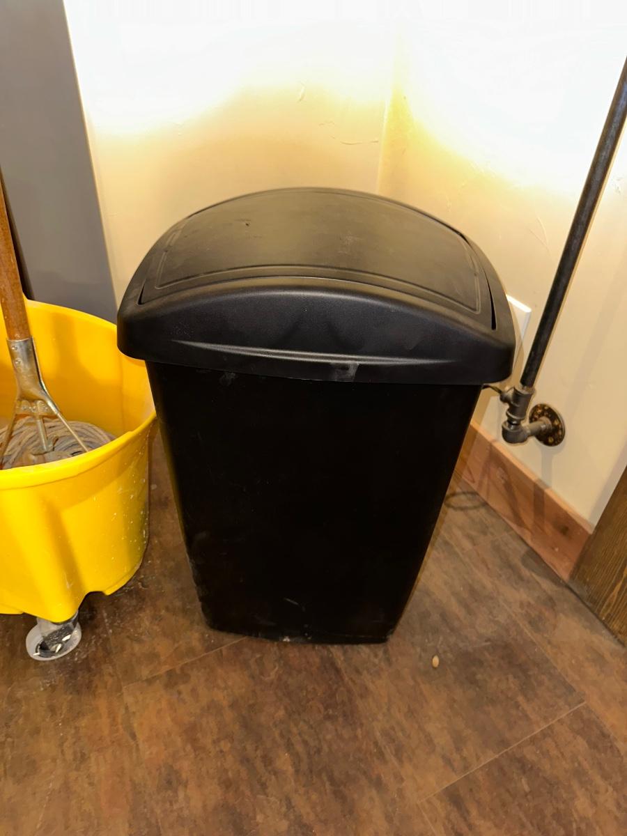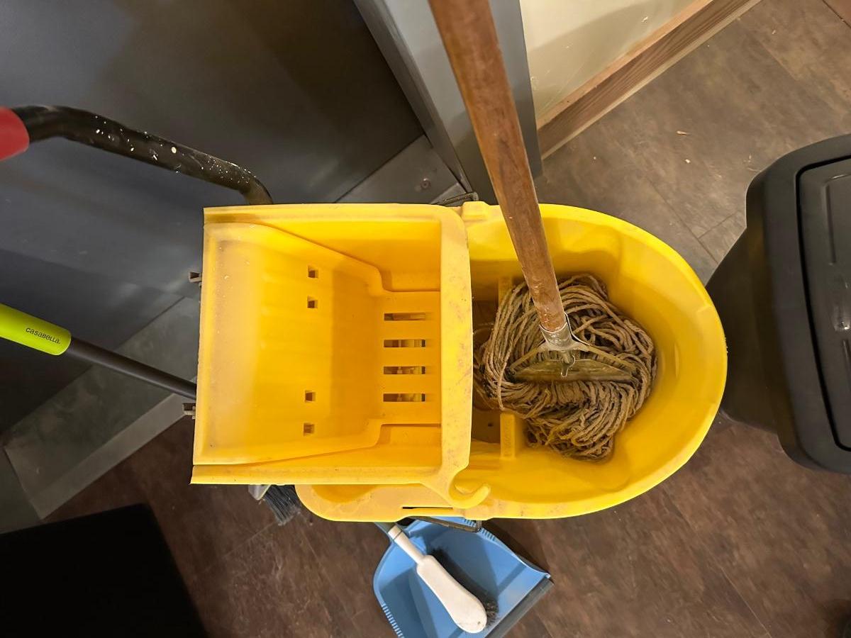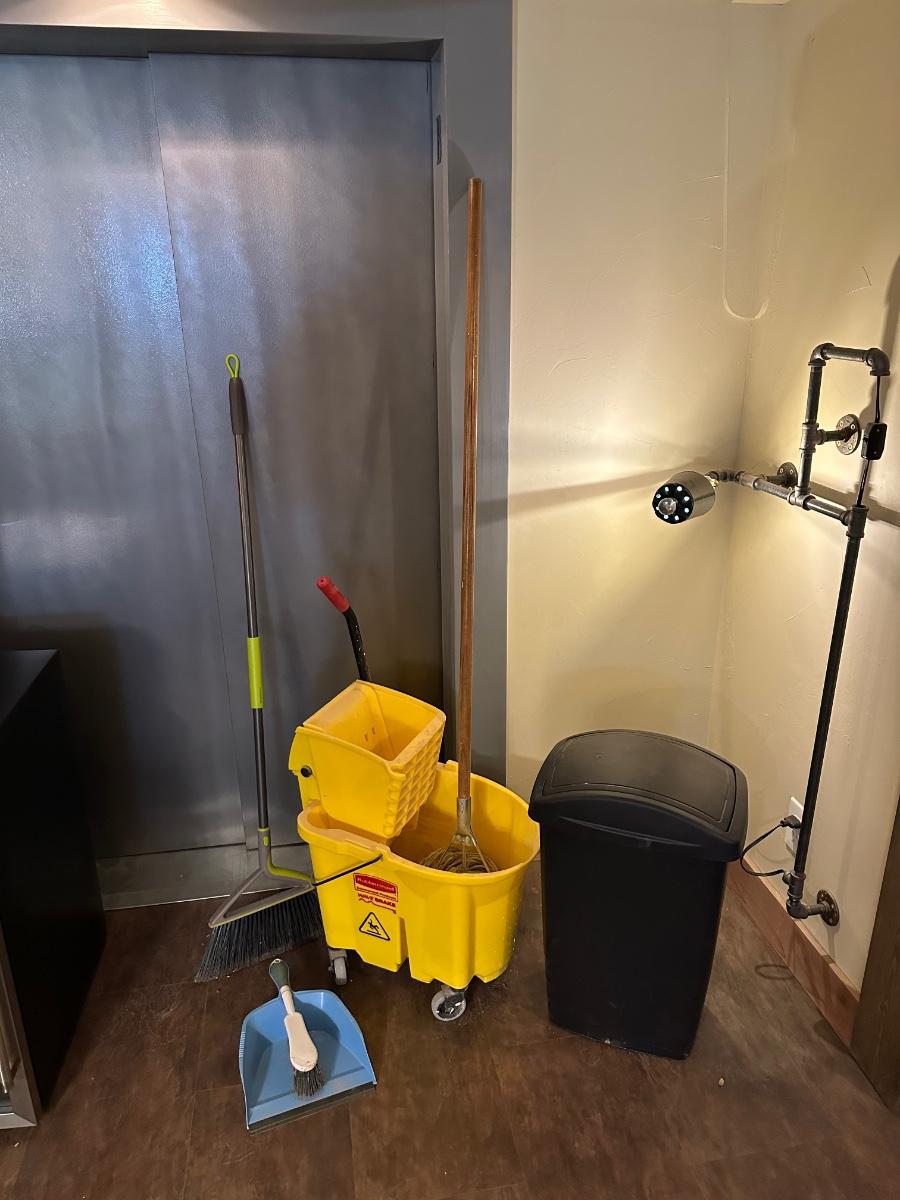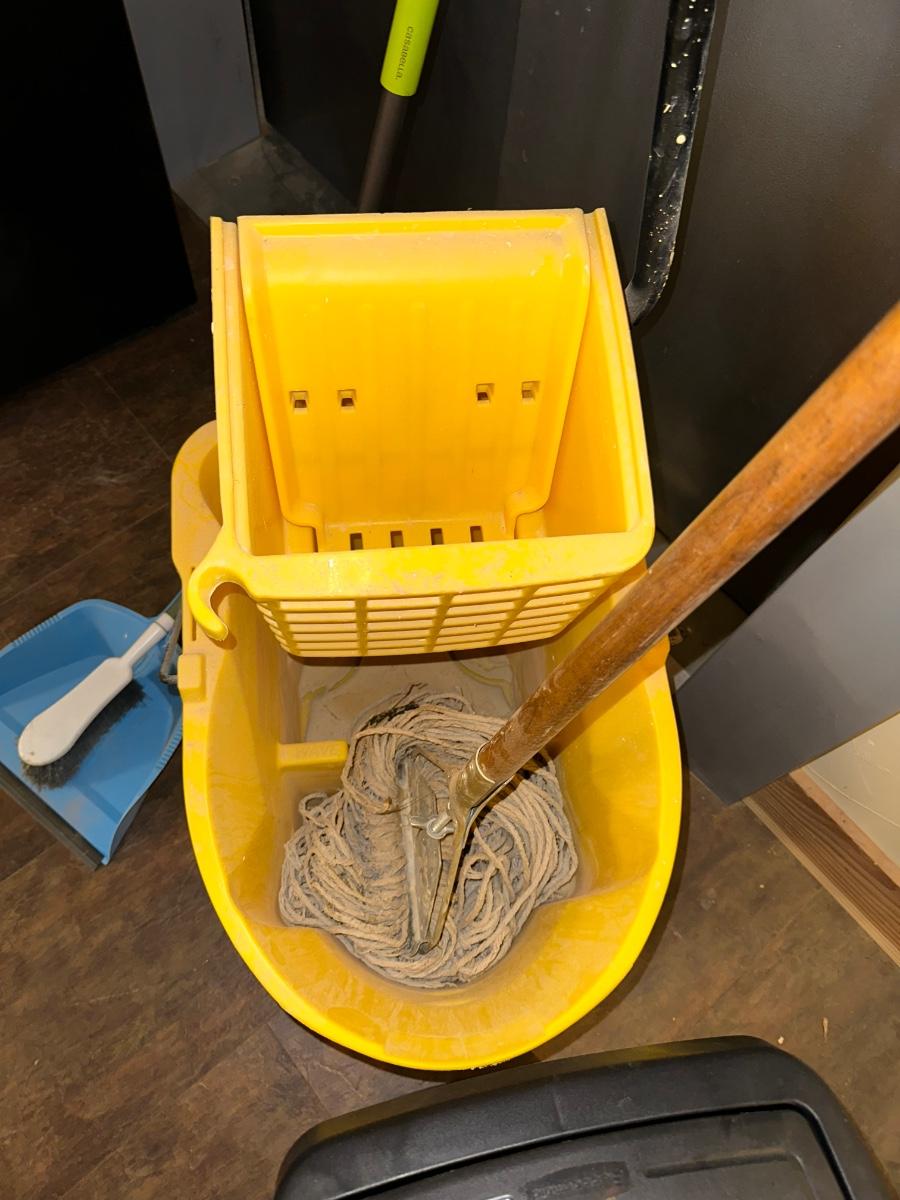 COMMERCIAL MOP BUCKET, MOP, WASTE CAN AND BROOM