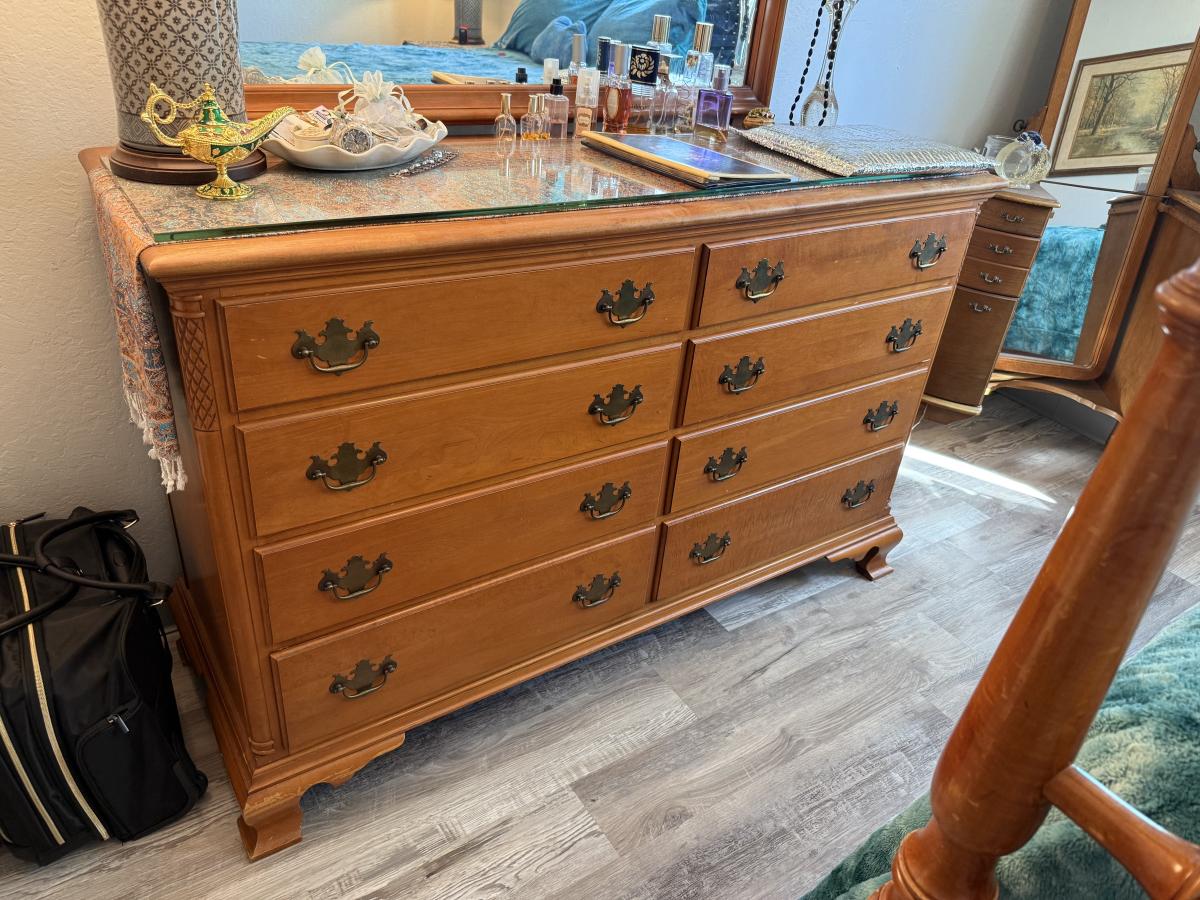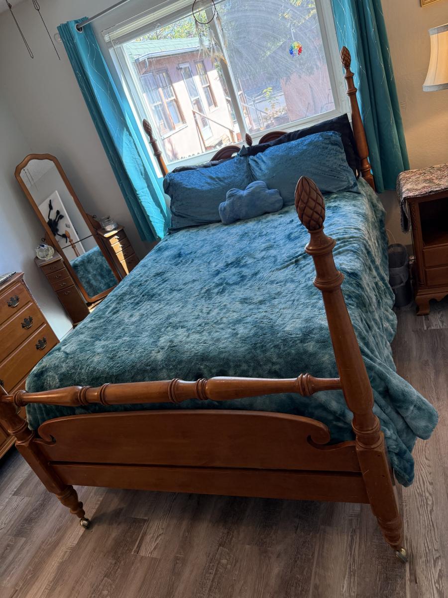 Beautiful matching wooden bedroom set featuring a classic four-poster full/queen bed with carved pineapple finials, a large eight-drawer dresser with framed mirror, and a two-drawer nightstand. Timeless design with brass hardware and solid craftsmanship – a complete set to furnish your bedroom in style.