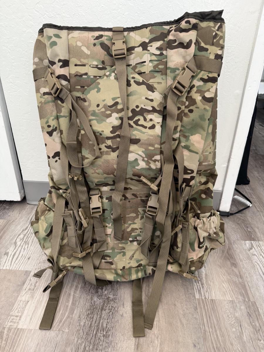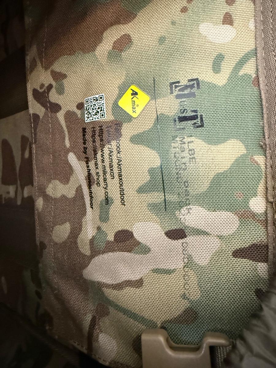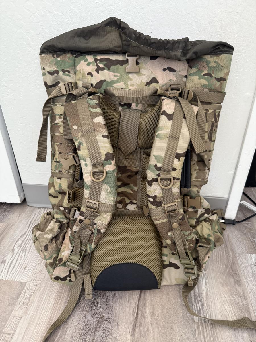 Heavy-duty AKmax Outdoor rucksack system in multicam pattern with multiple attachments. Includes large framed rucksack, hydration carrier, detachable utility pouch, padded hip belt, and additional modular pieces. Built for rugged use, camping, hiking, or survival setups. Durable construction with plenty of storage and adjustable straps. A full set ready to go!