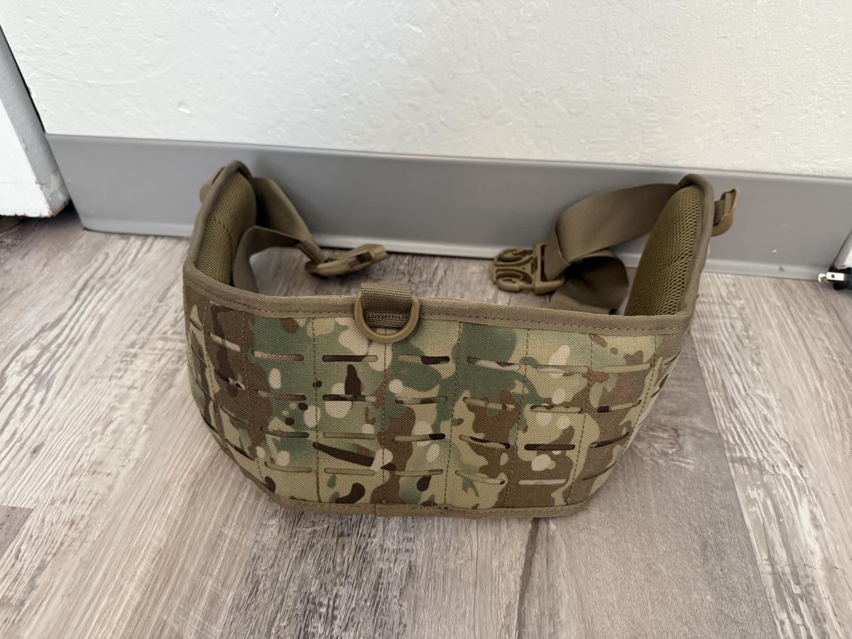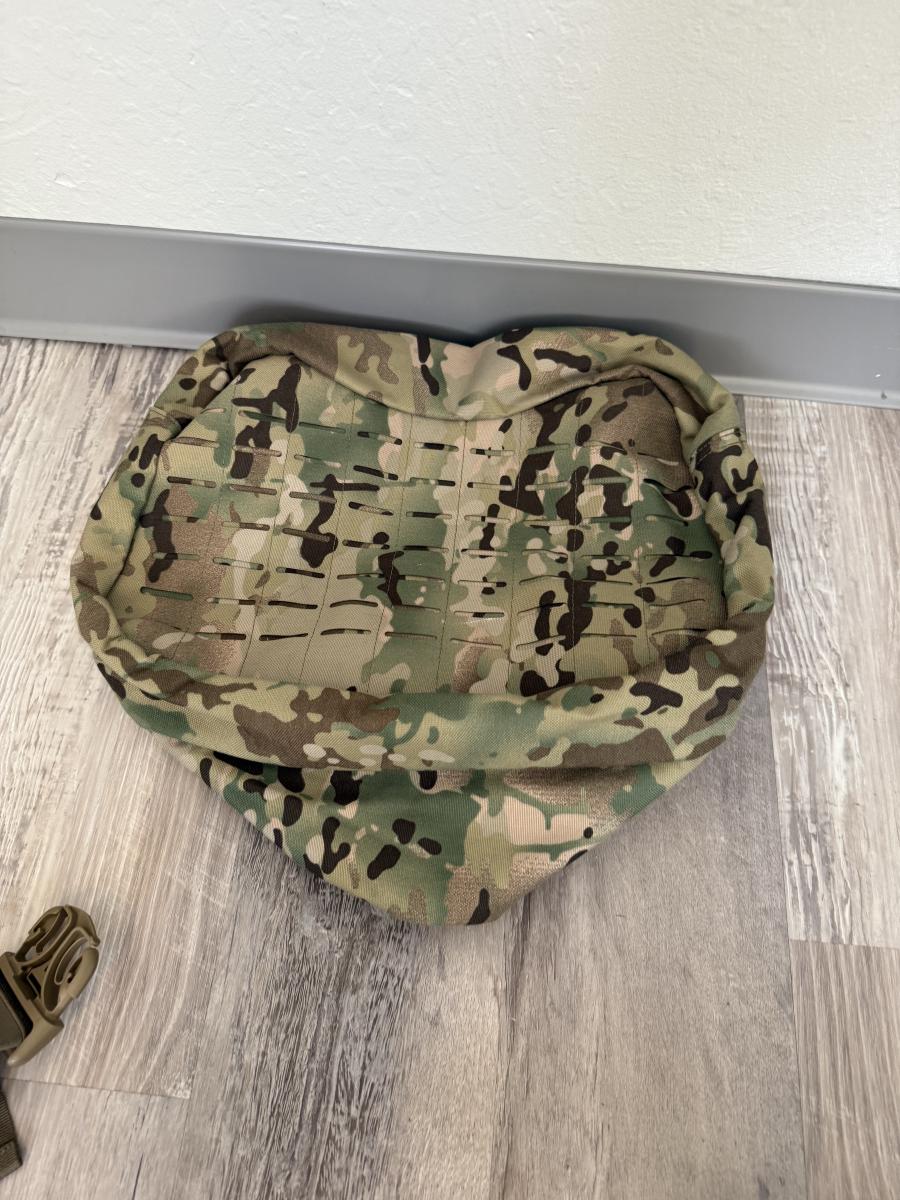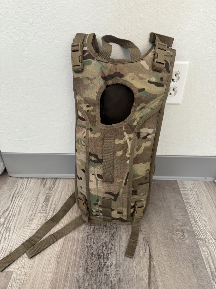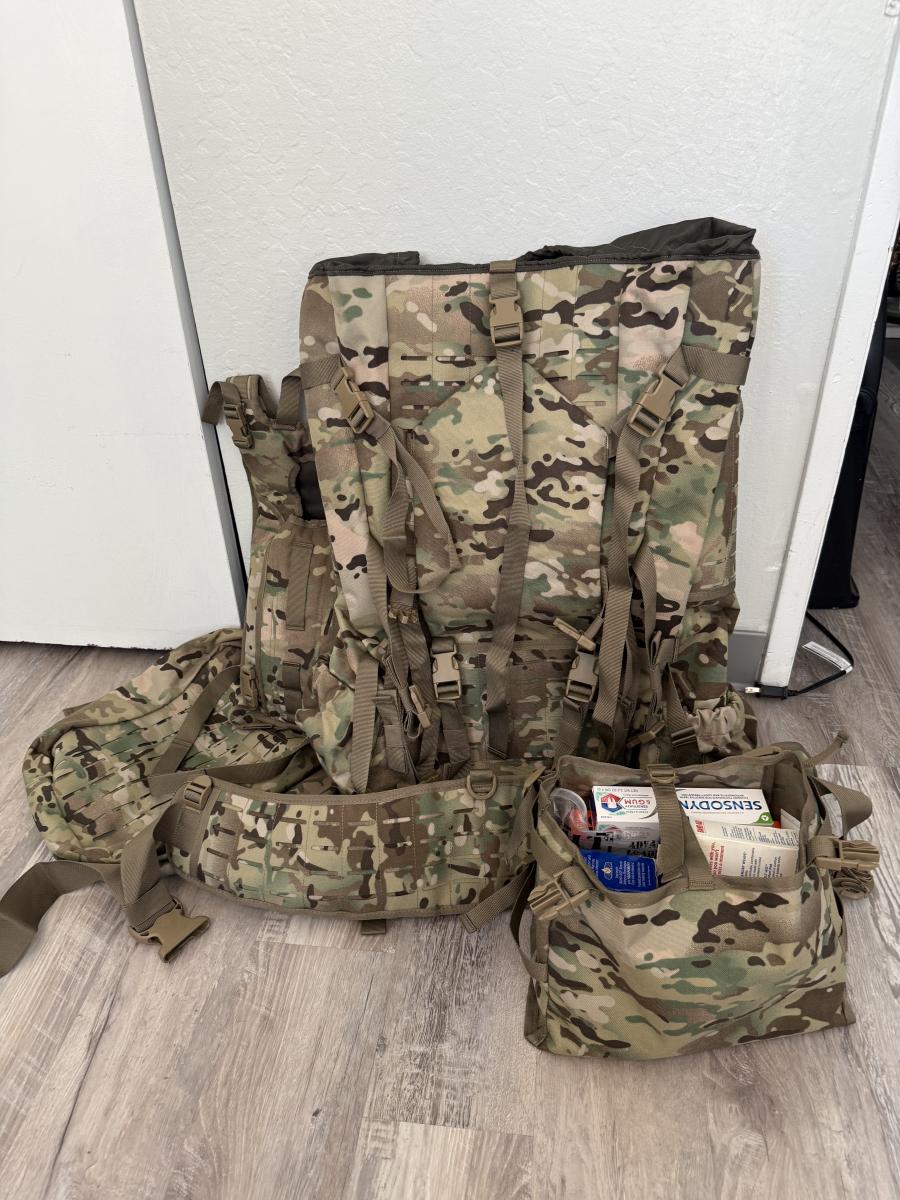 Heavy-duty AKmax Outdoor rucksack system in multicam pattern with multiple attachments. Includes large framed rucksack, hydration carrier, detachable utility pouch, padded hip belt, and additional modular pieces. Built for rugged use, camping, hiking, or survival setups. Durable construction with plenty of storage and adjustable straps. A full set ready to go!