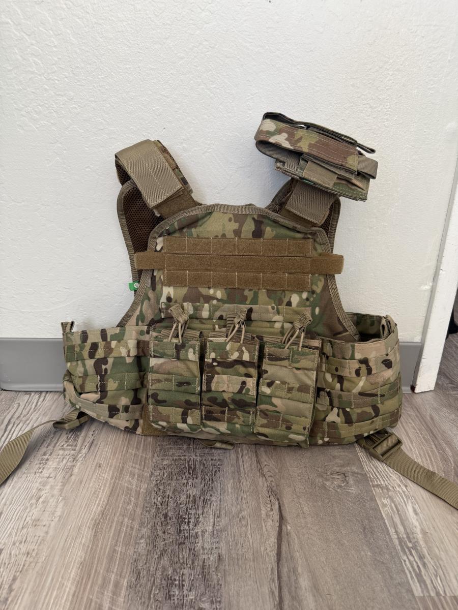 Durable Condor Outdoor tactical vest in multicam camo pattern. Features multiple front magazine/utility pouches, padded shoulder straps, adjustable fit, and breathable mesh lining for comfort