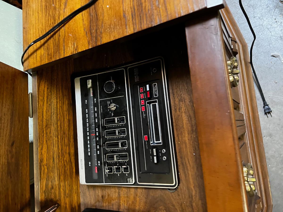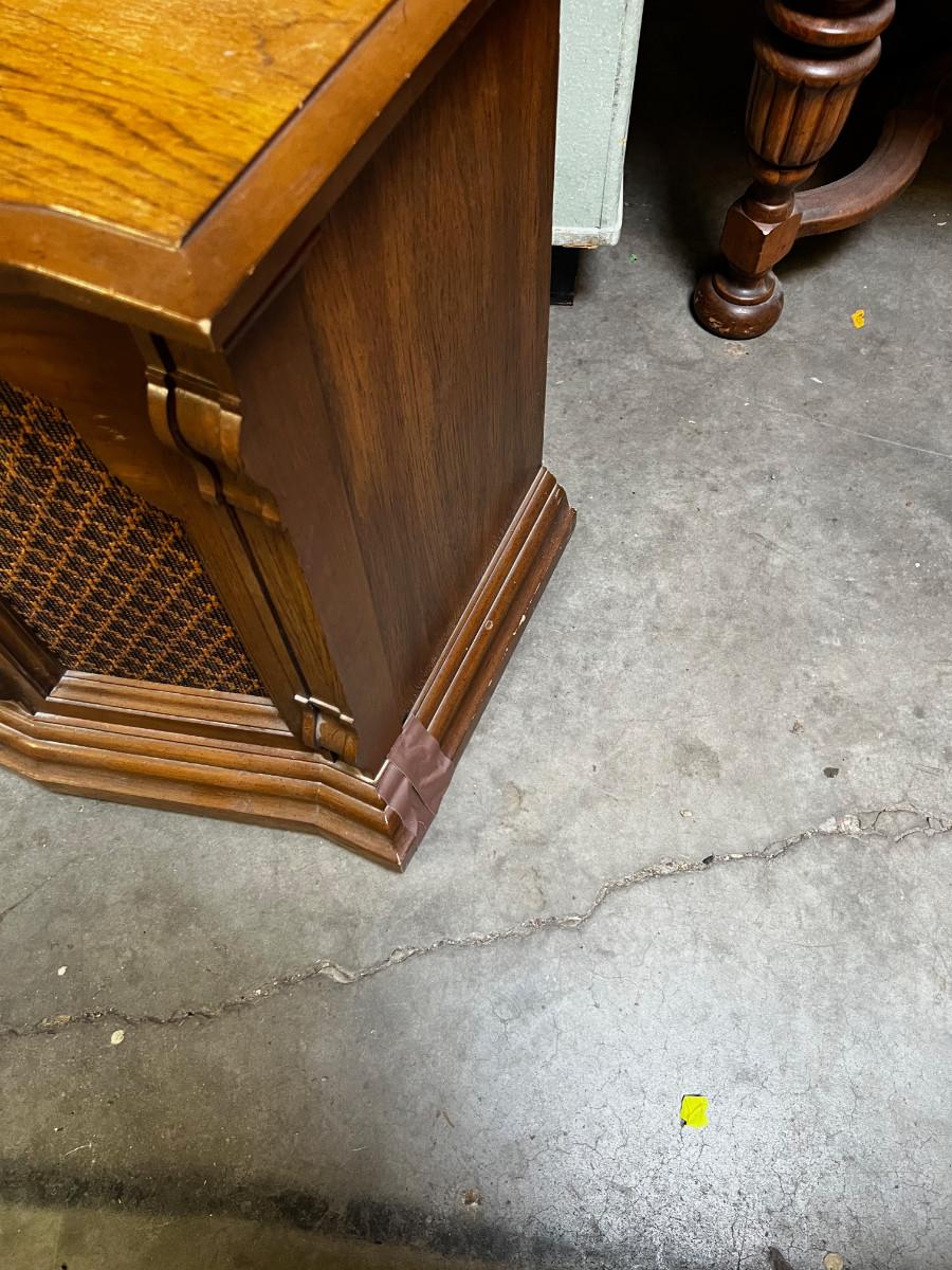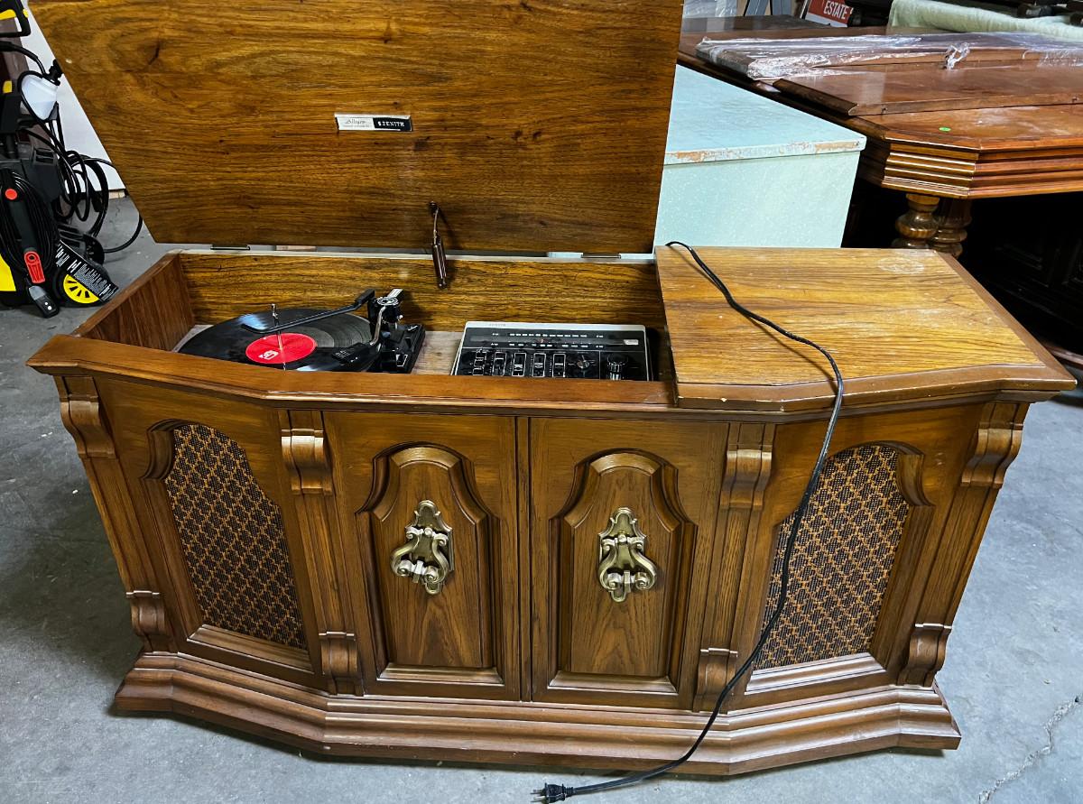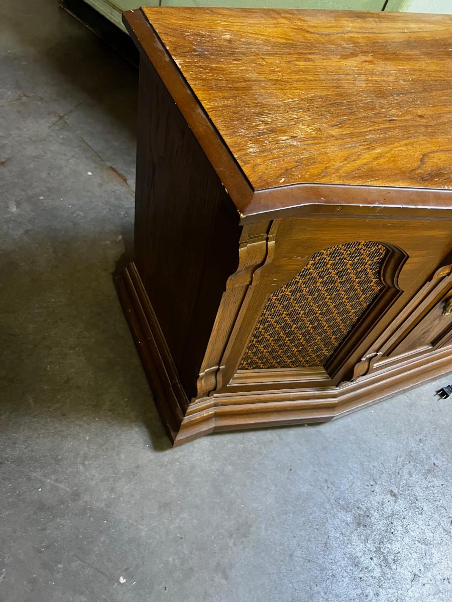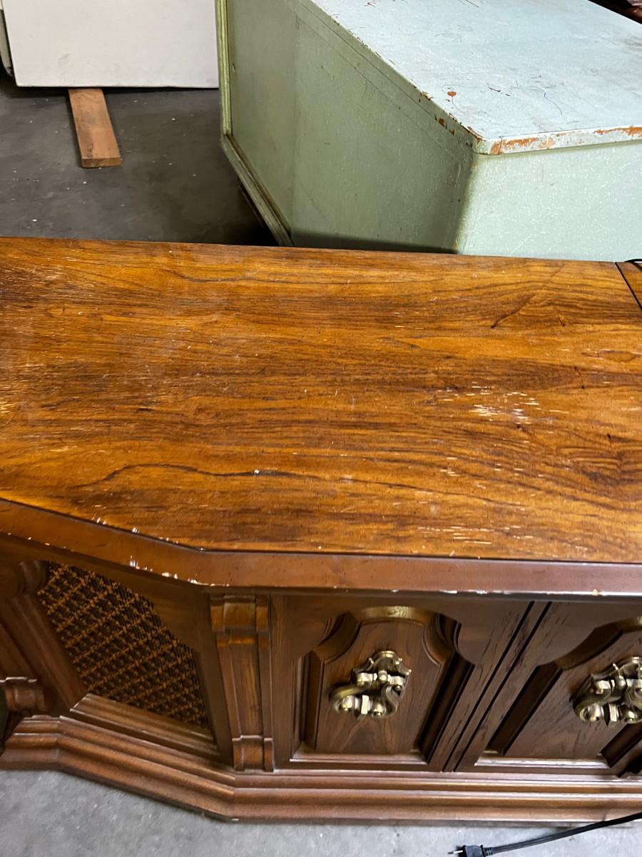 USED - Functional, Show Wear. THE TURN TABLE DOES NOT WORK BUT IS INCLUDED, Measures: No Shipping NOTE ** Must Bring 2 Strong Adults to move this item. It is ground Floor of warehouse.-No Stairs but you will need a truck and this is very heavy!!!! We do not have Loading help for these furniture items!