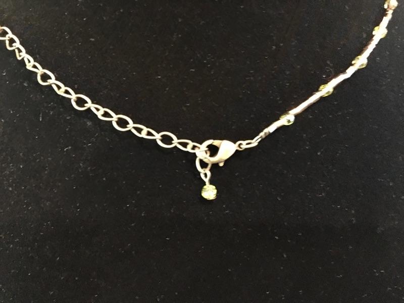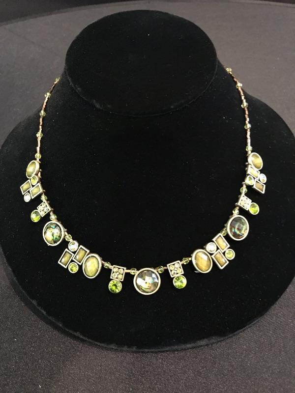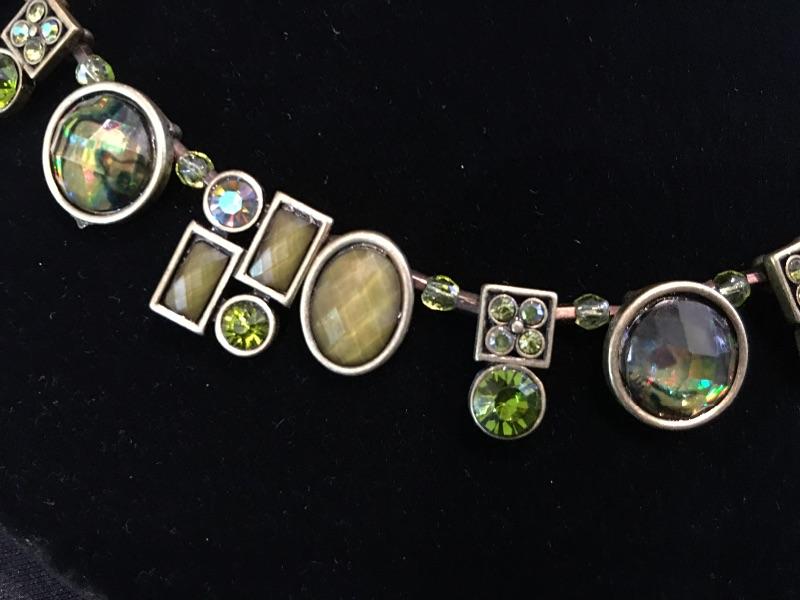 Contemporary Green Crystal w/ Golden Forms Necklace 15-18”L  Item #51