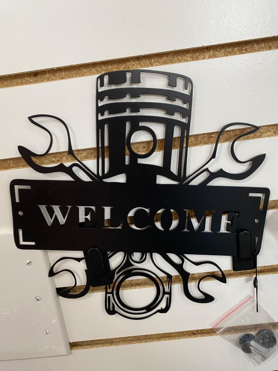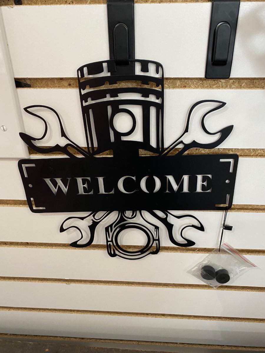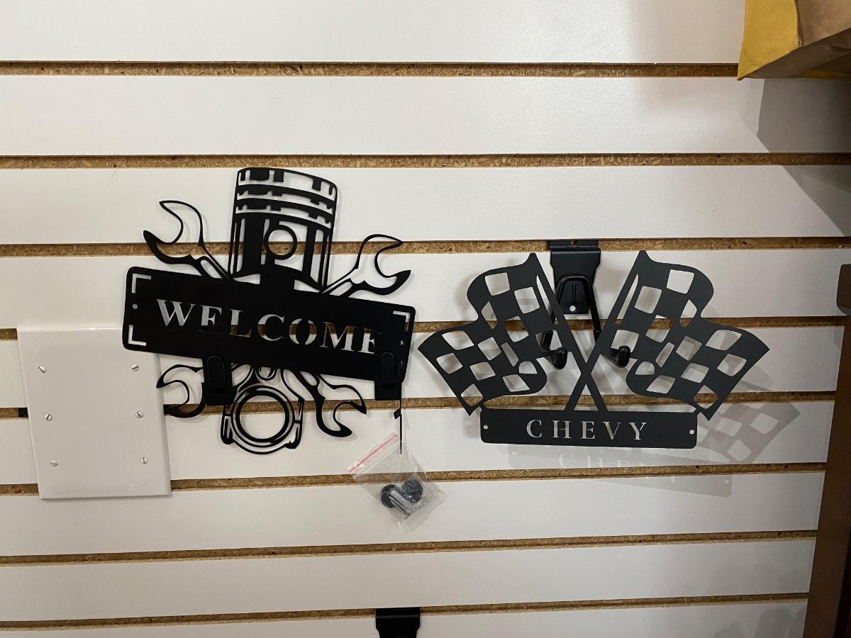 COOL BLACK STAMPED METAL CHEVY W/CHECKERED FLAG SIGN AND WELCOME SIGN WITH PISTON AND WRENCHES