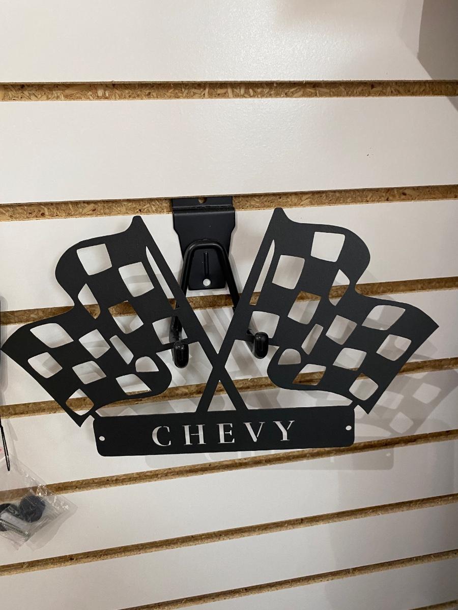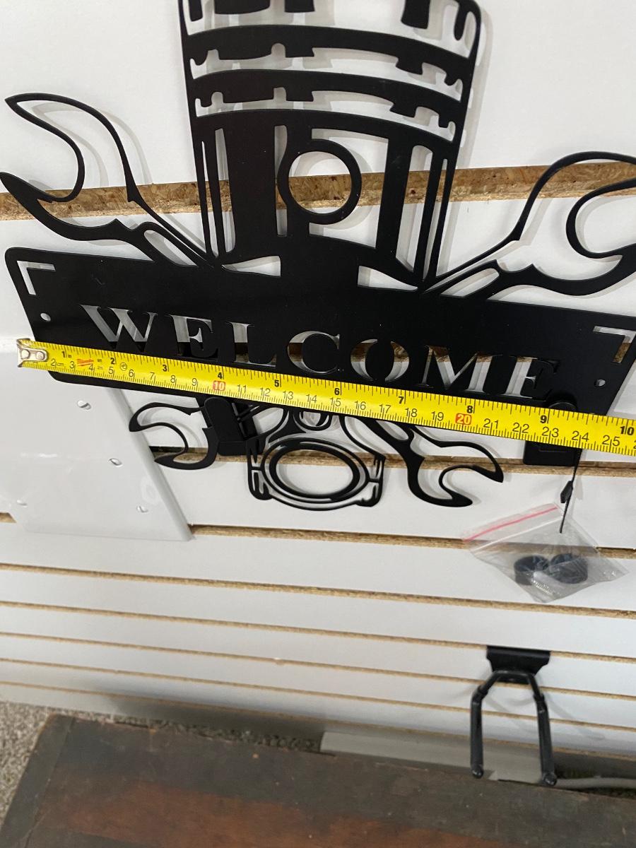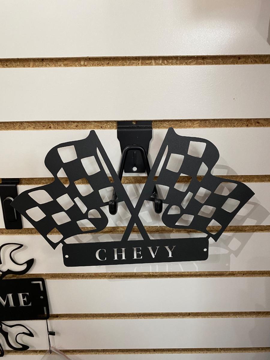 COOL BLACK STAMPED METAL CHEVY W/CHECKERED FLAG SIGN AND WELCOME SIGN WITH PISTON AND WRENCHES