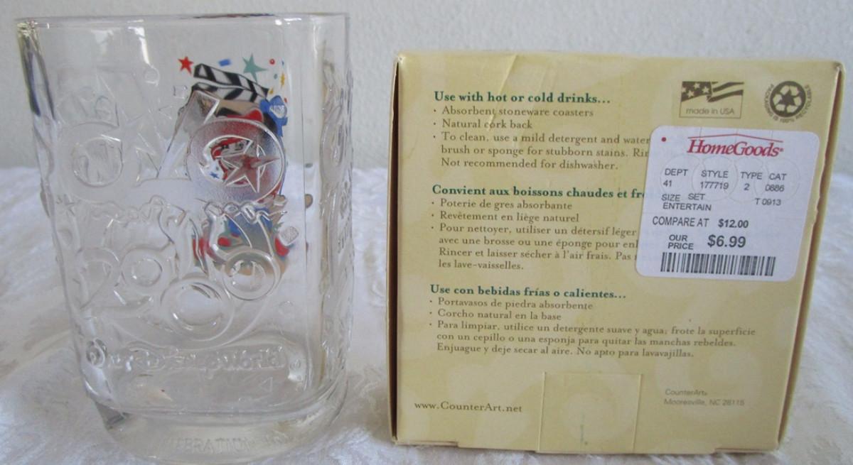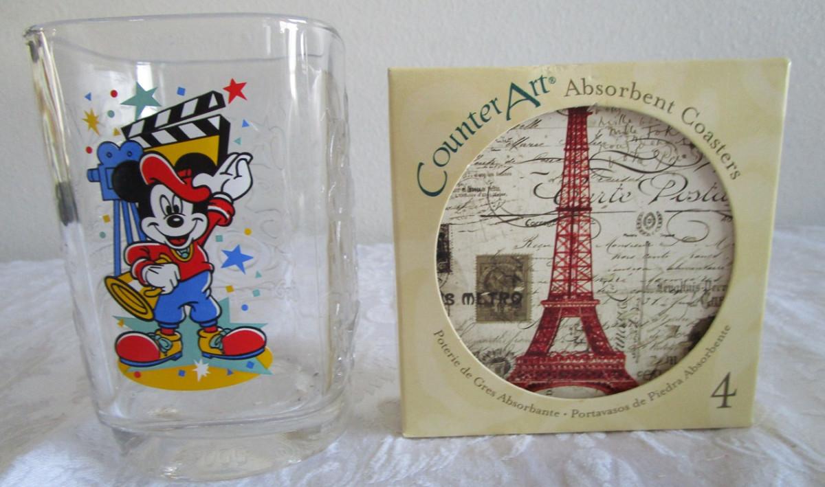 Counter art absorbent coasters, and Mickey Mouse cup - Disneyland 2000 McDonald's