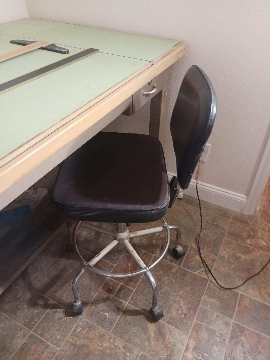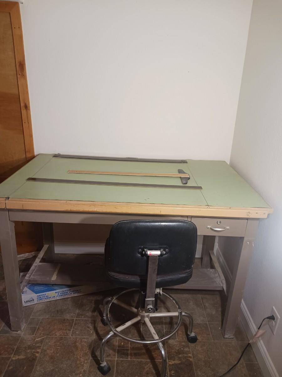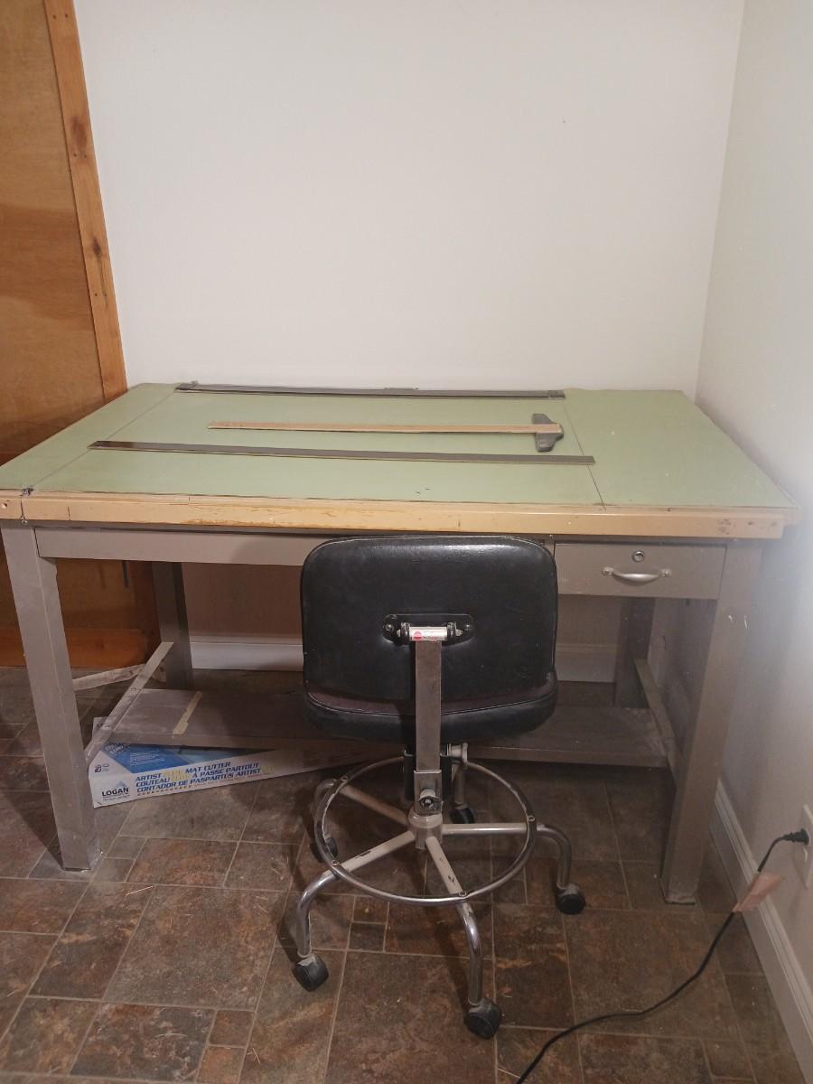 DRAFTING TABLE W/ CHAIR, TOOLS AND LARGE SHEETS OF PAPER