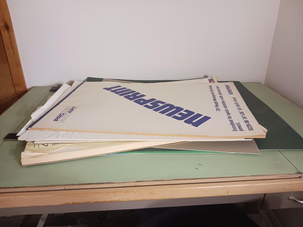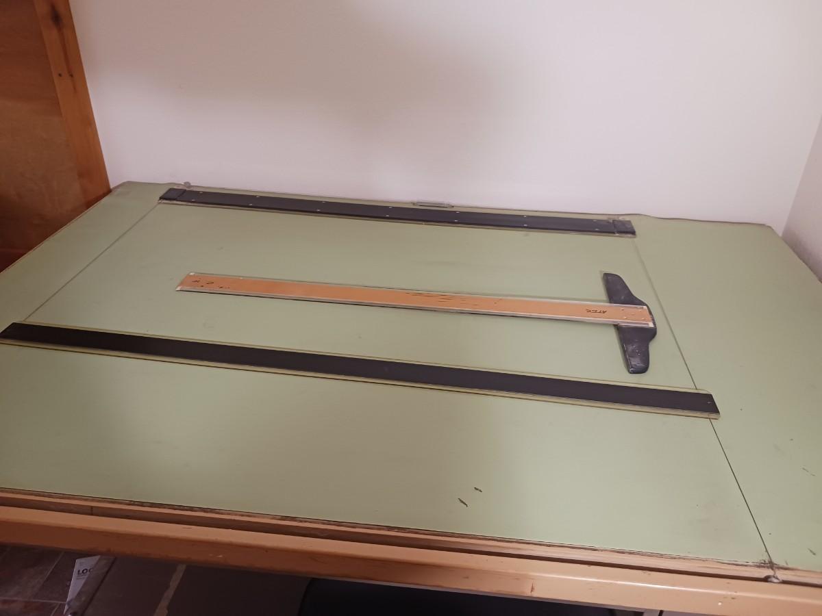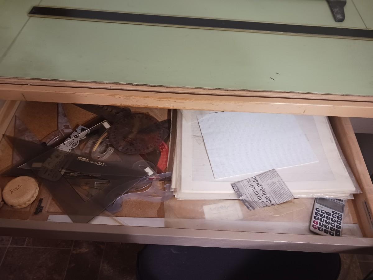 DRAFTING TABLE W/ CHAIR, TOOLS AND LARGE SHEETS OF PAPER
