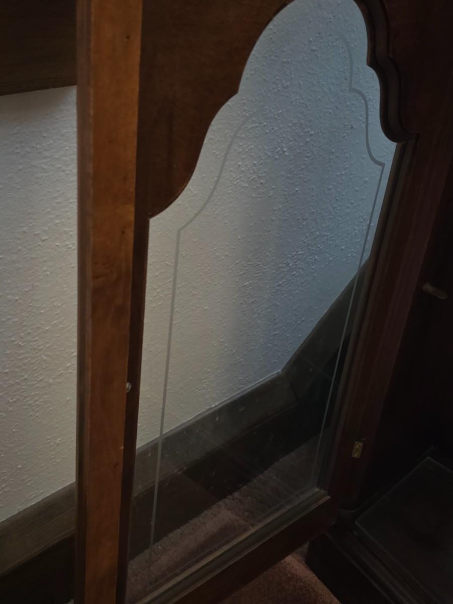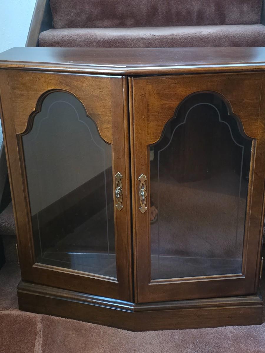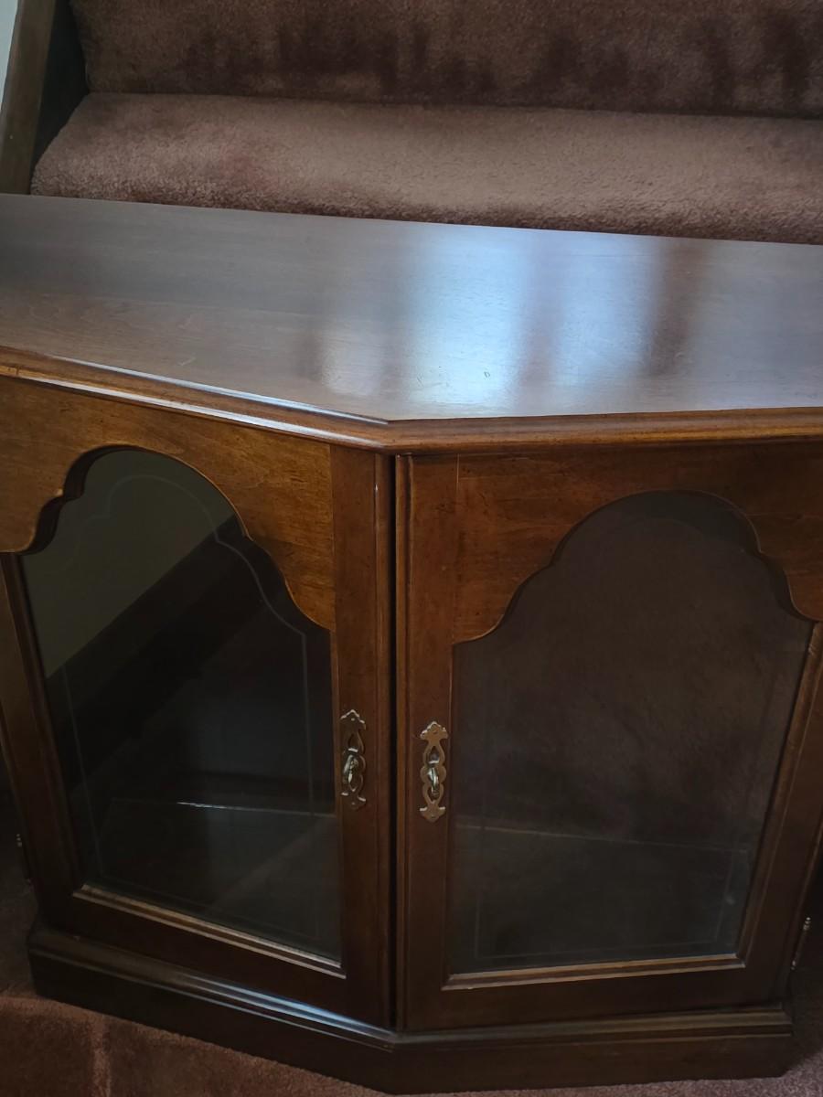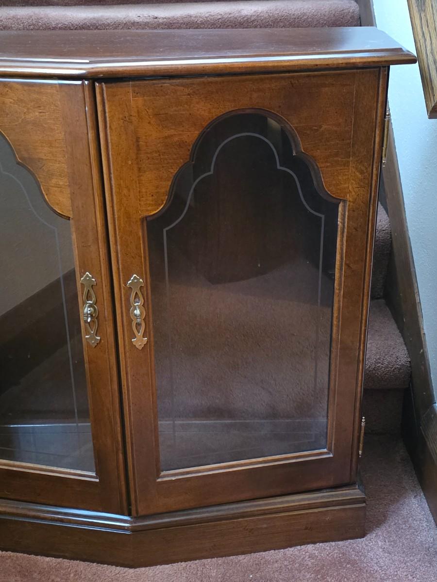Beautifully designed, unique shape curio cabinet with light. Two door with glass shelf, plate rail. Measures 32" W 22" deep, 32" H. 9" D each side. Located on main floor, bring help to remove