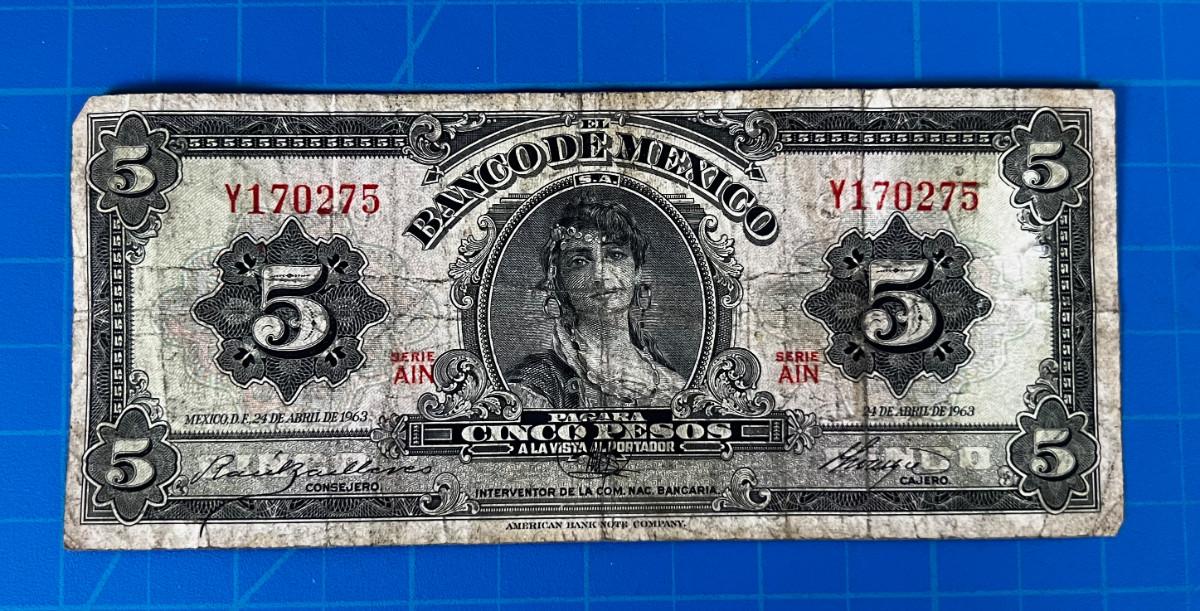 Currency 1963 Mexican 5 Peso Note