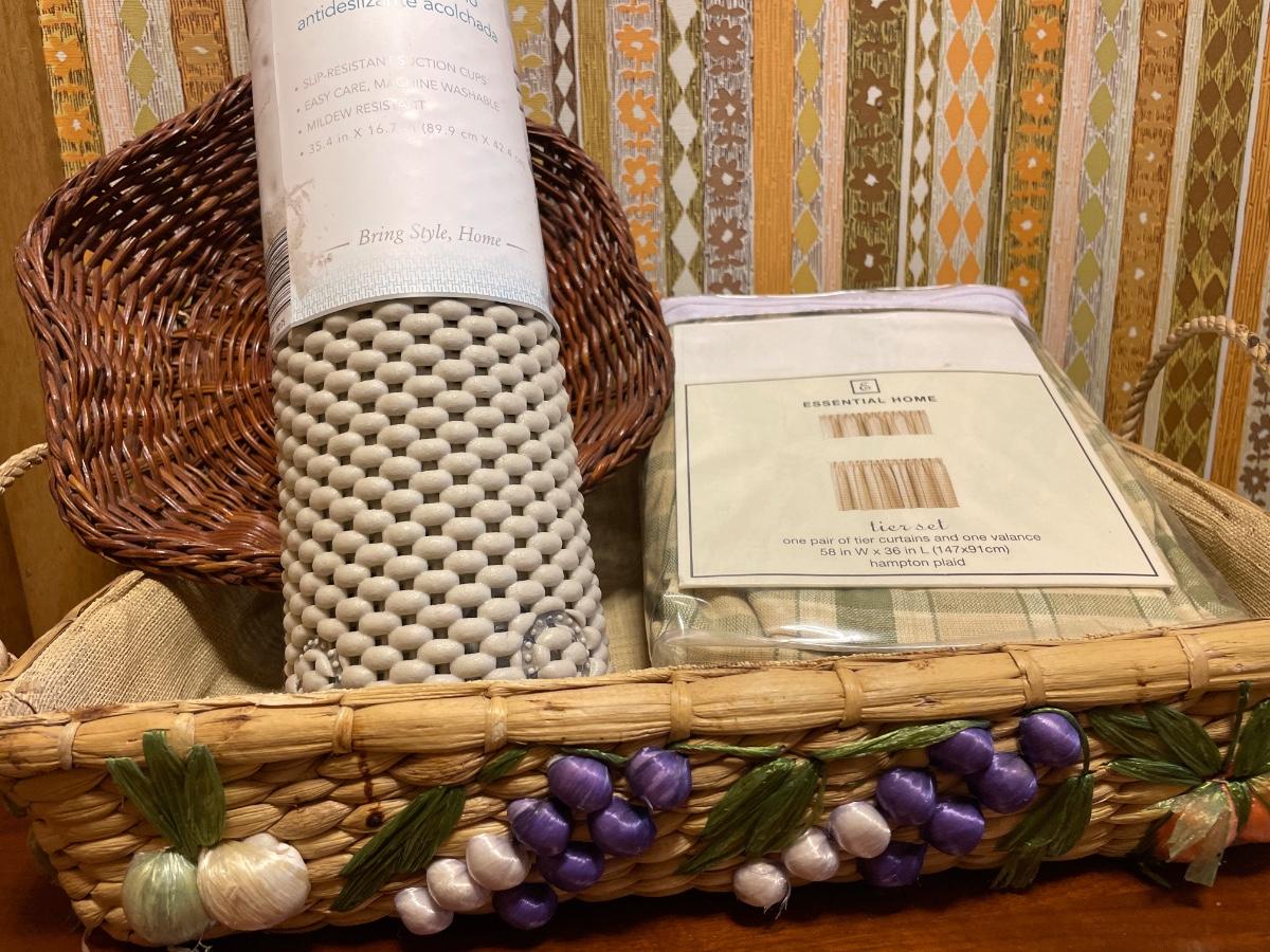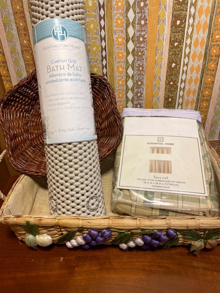 Curtains, bath mat and casserole holder