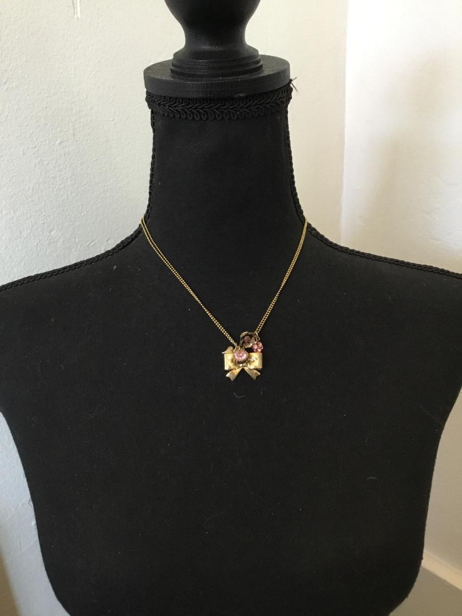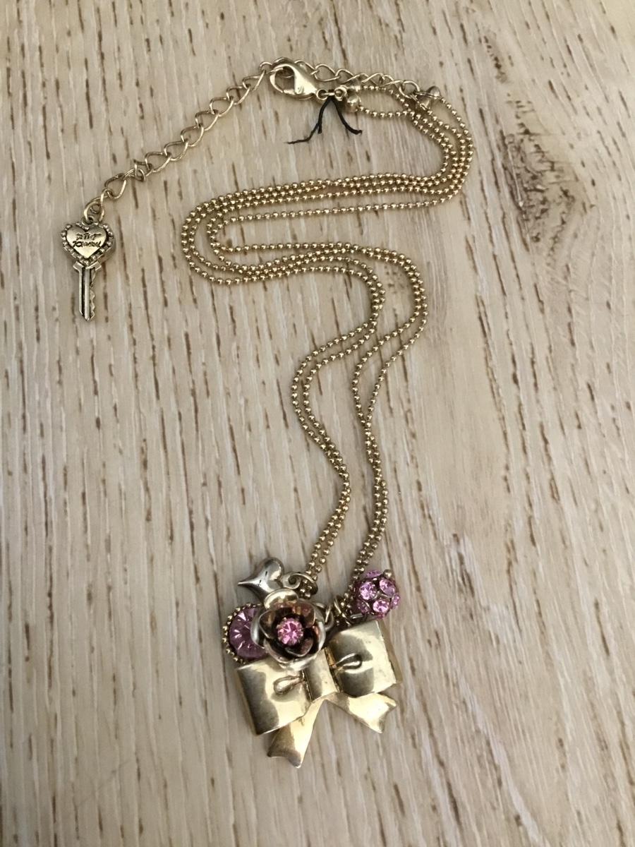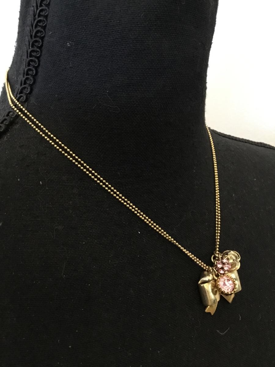 Cute betsey Johnson, gold tone, pink rhinestone bow charms, flower charms, necklace