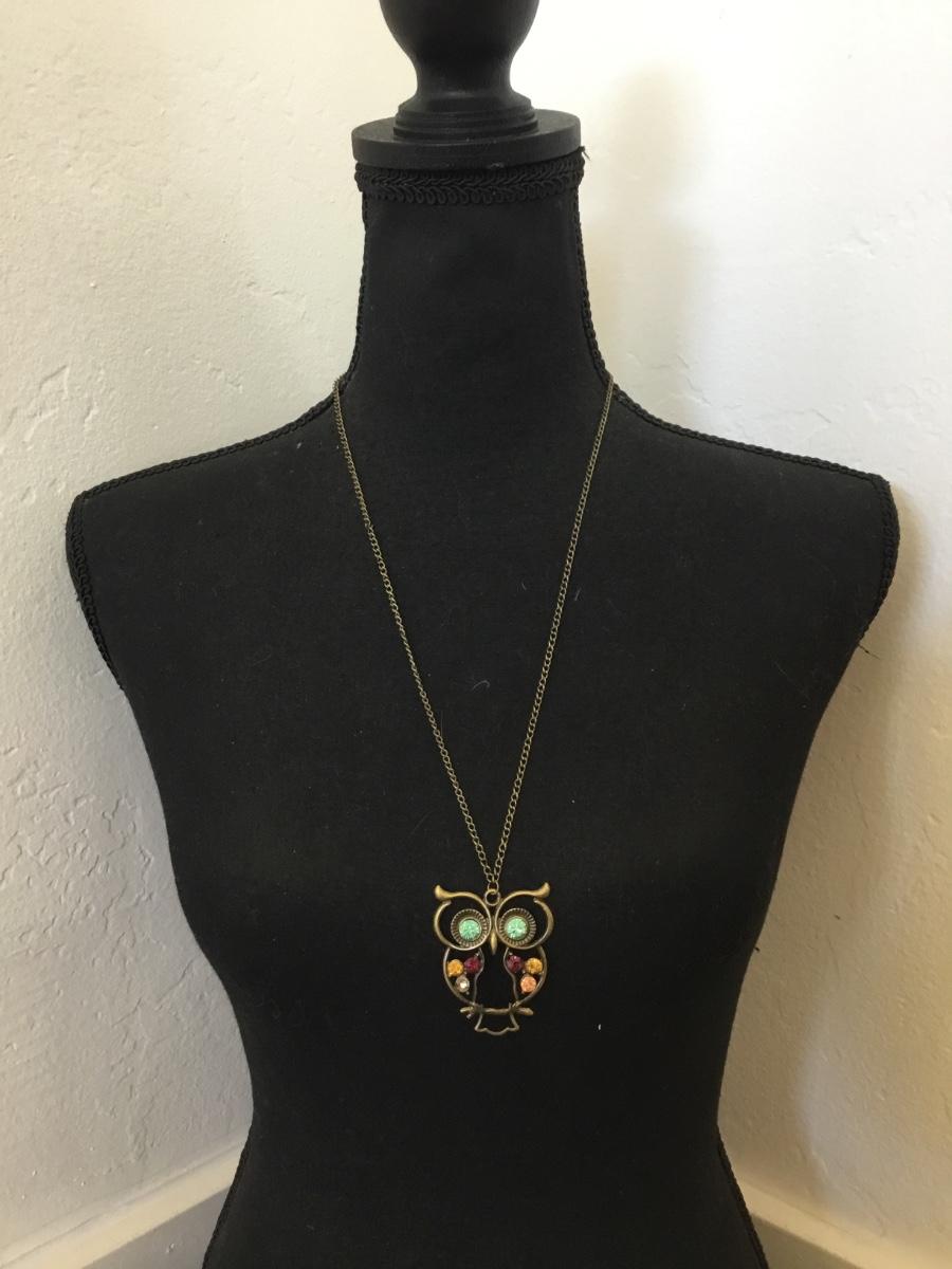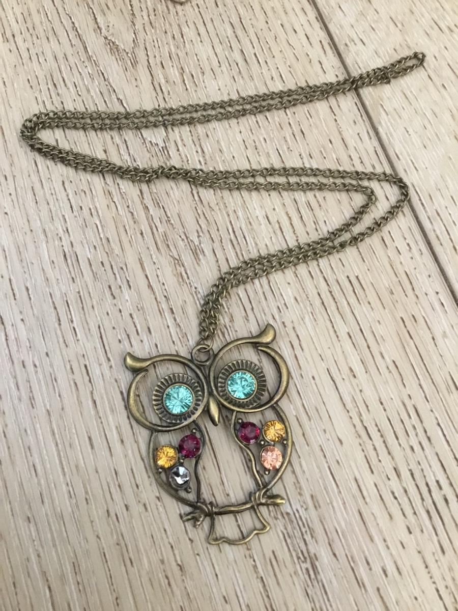 Cute, bronze, toned, multicolored, rhinestone owl, pendant necklace