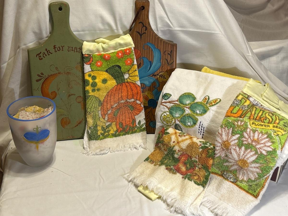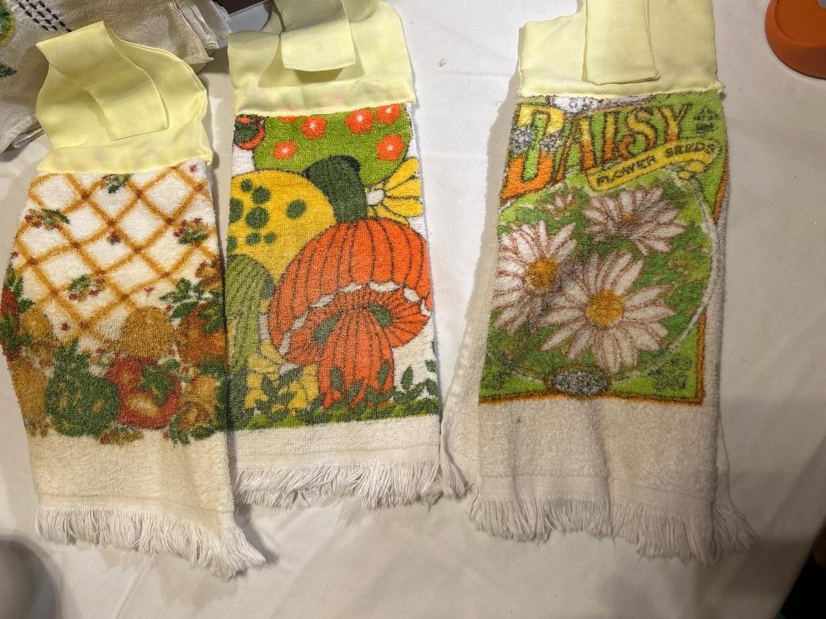 The green one is quite worn and the other is not. 7 towels & a vase.